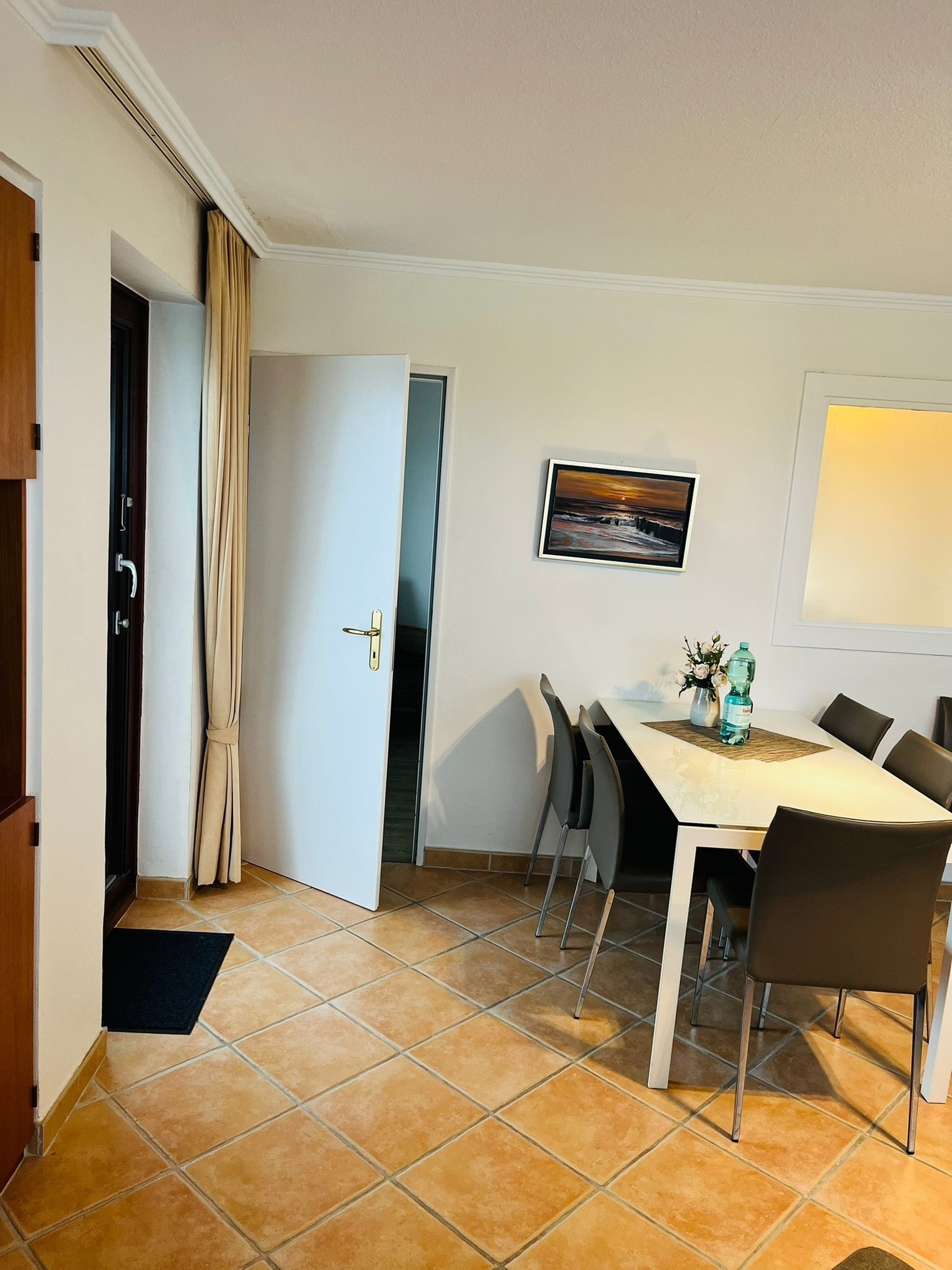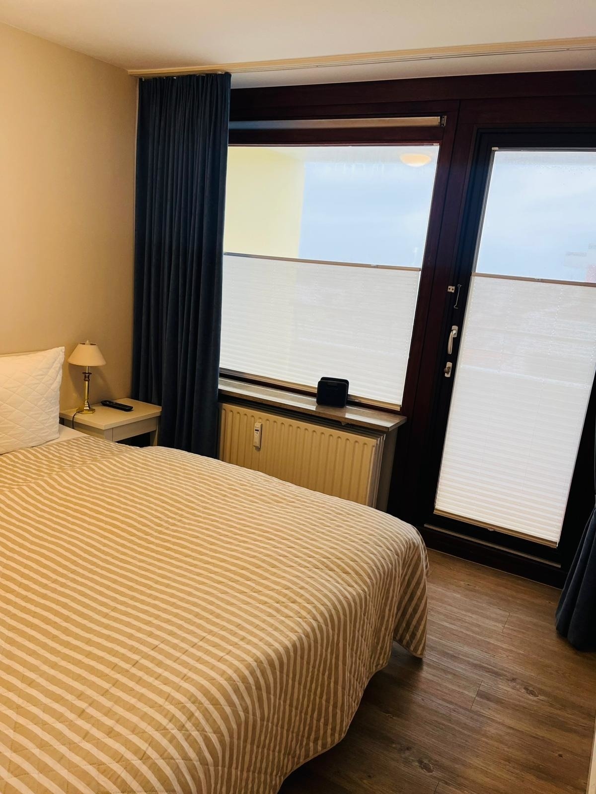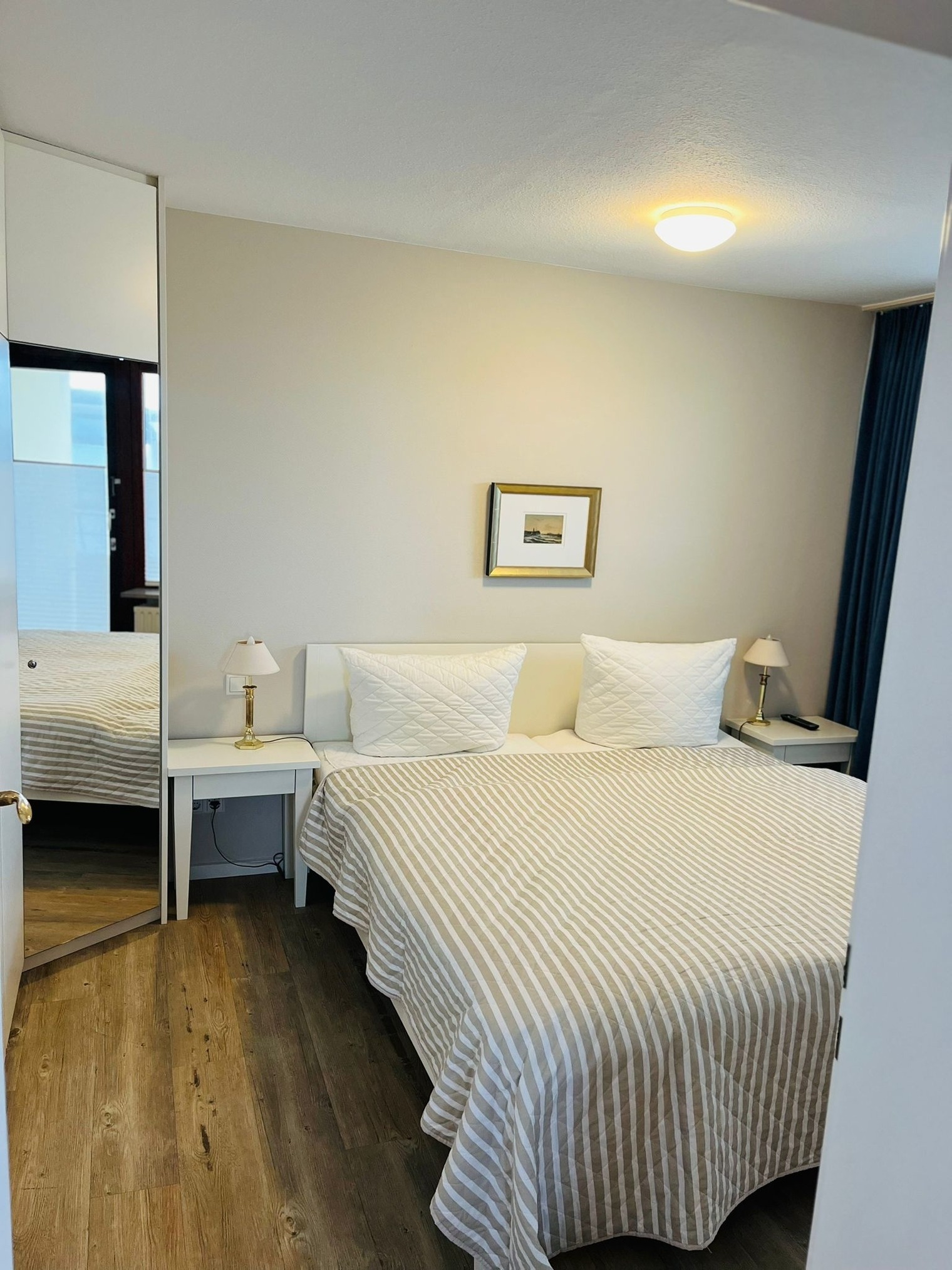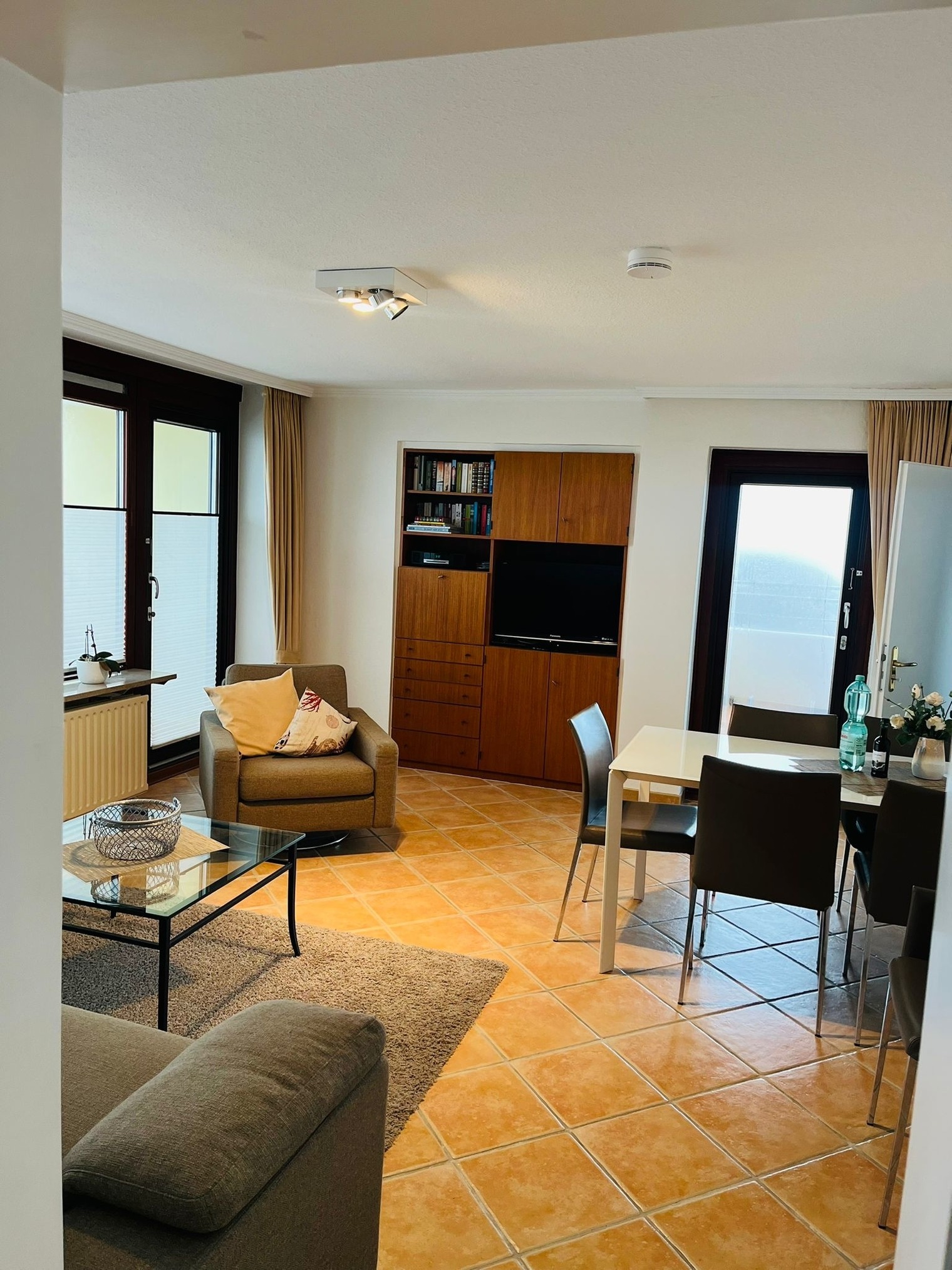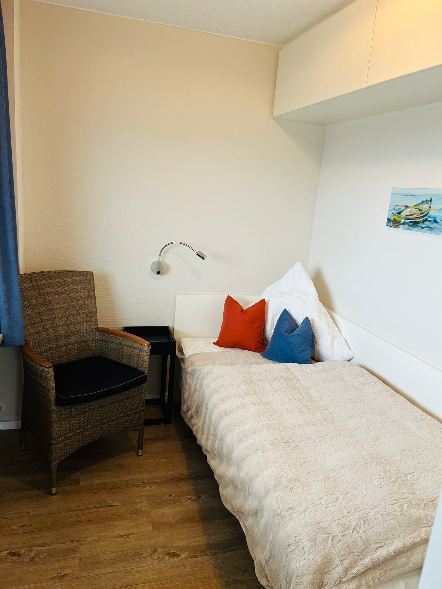 Vorflur, kleine sep. Küche mit Geschirrspüler, großes helles, modernes Wannenbad und extra Dusche, WC. Heller Schlafraum mit Doppelbett eigenen Flachbildfernseher und sep. Balkon zum Osten. Wohnraum mit Sitzgarnitur (Sofa und Sessel), großer Essplatz, Flachbildfernseher, Radio mit CD-Player von BOSE, hauseigenes freies WLAN. Kl. sep. Schlafraum zum Süden mit einem Einzelbett und einen Notbett für die 4.te Pers. KEIN Teppichboden.