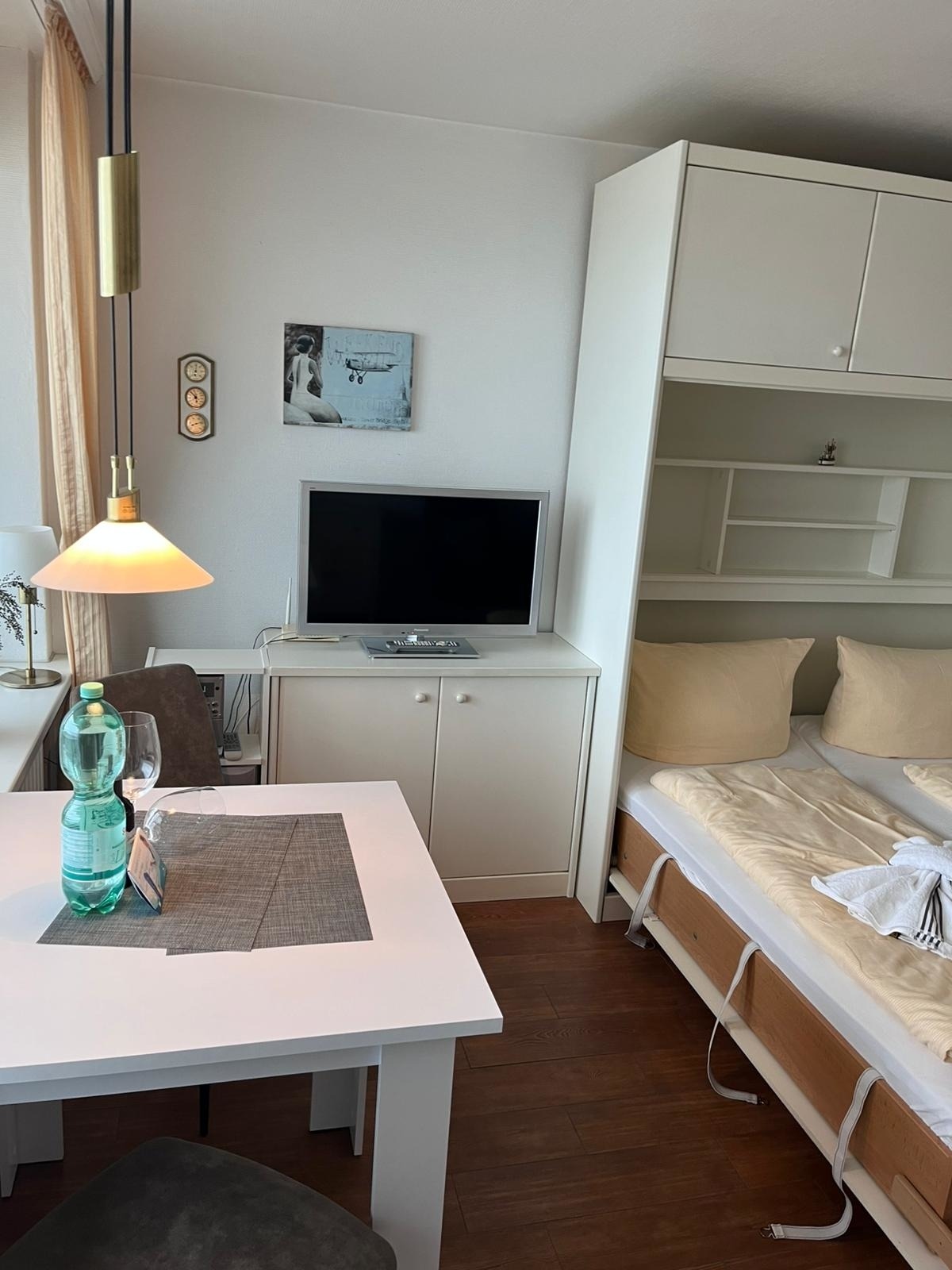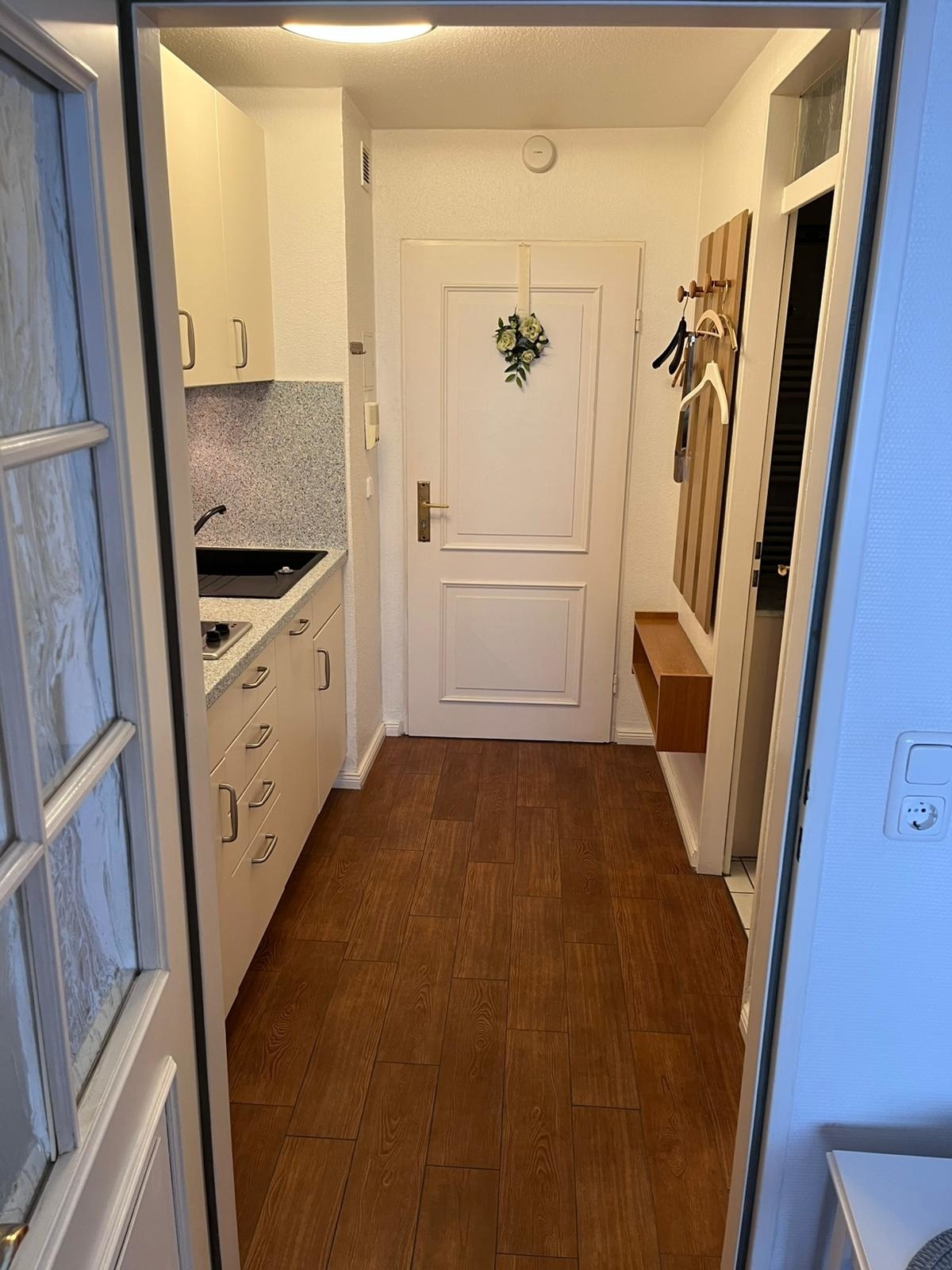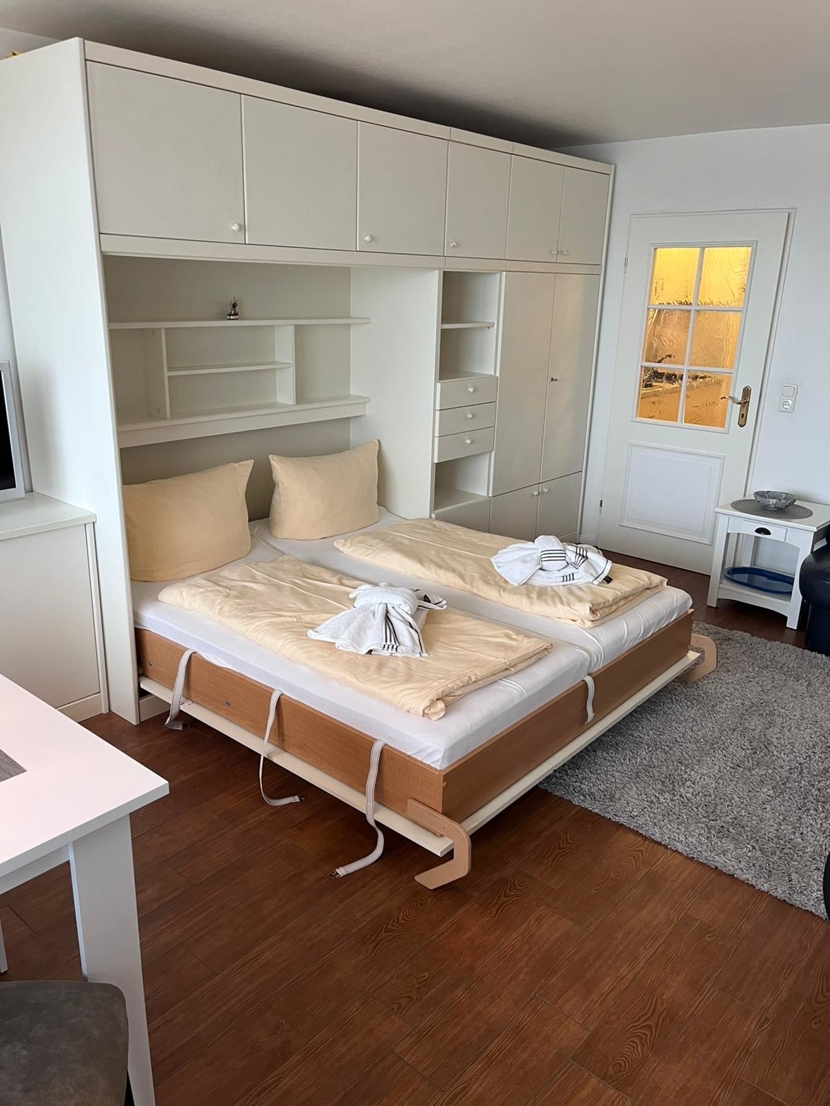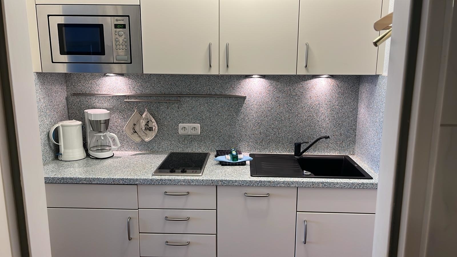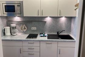 Vorflur mit moderner neuer Küchenzeile mit Geschirrspüler, modernes renoviertes helles Duschbad/WC, heller modern eingerichteter Wohn-/Schlafraum mit einem Doppelschrankbett, Sitzgarnitur, Essplatz am Fenster, Flachbildfernseher, CD-Player mit Radio, hauseigenes freies WLAN. Ein Balkon rundet dieses schöne, hell und freundlich eingerichtete ca. 34 qm große Appartement ab. KEIN Teppichboden. Ein Abstellplatz in der Tiefgarage kann hinzugemietet werden. Der Tiefgaragenplatz muss bestellt werden, ansonsten verfällt der Anspruch!
