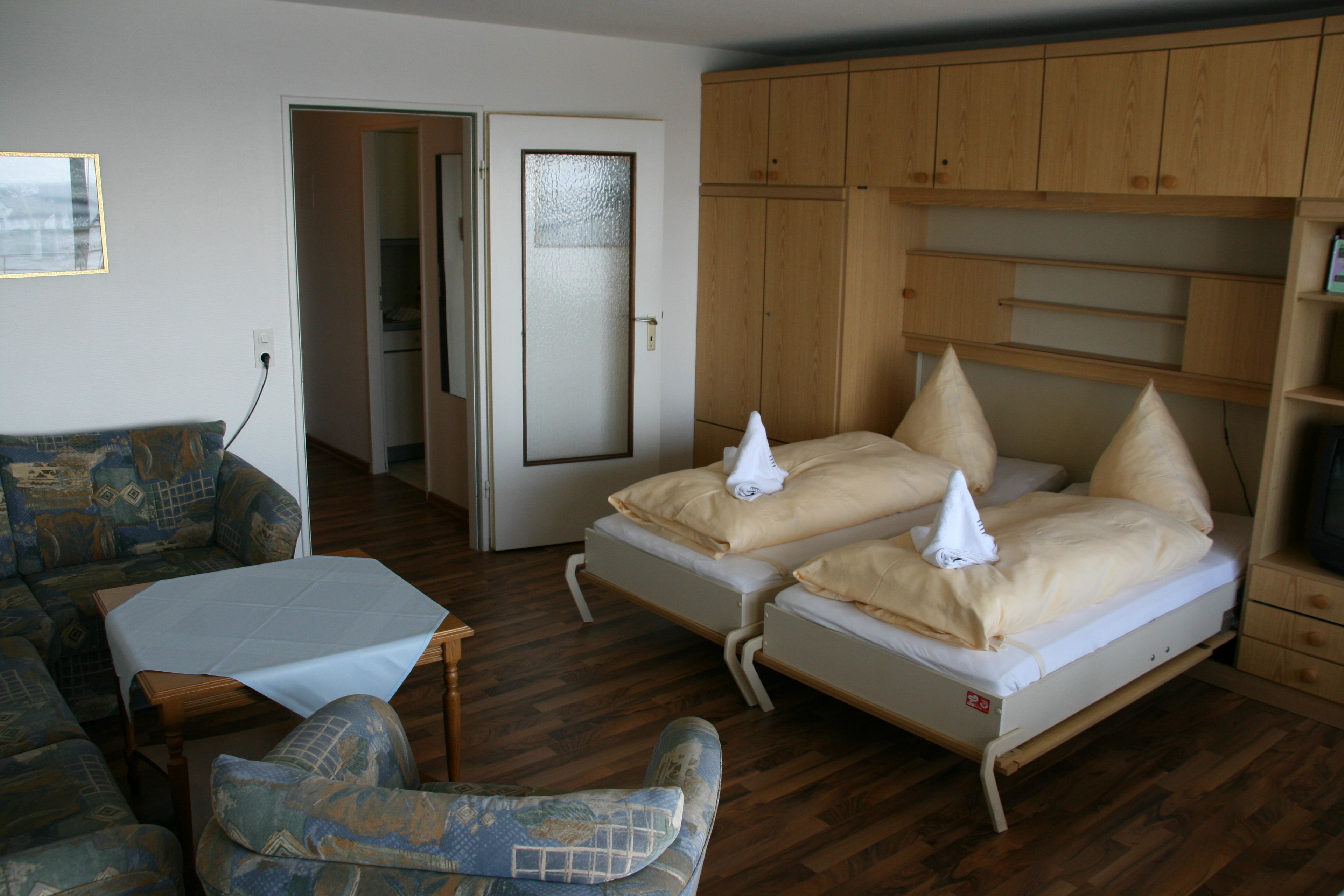 Vorflur, kl. moderne sep. Küche mit Geschirrspüler, neu renoviertes Bad mit Dusche / WC, heller Wohn-/Schlafraum mit zwei Einzelschrankbetten, Sitzgarnitur mit Sessel, Essplatz am Fenster, Flachbildfernseher, Radio/CD, hauseigenes freies WLAN. Ein Balkon rundet dieses schöne ca.43 qm große Appartement ab. Haustiere sind im Appartement nicht gestattet.