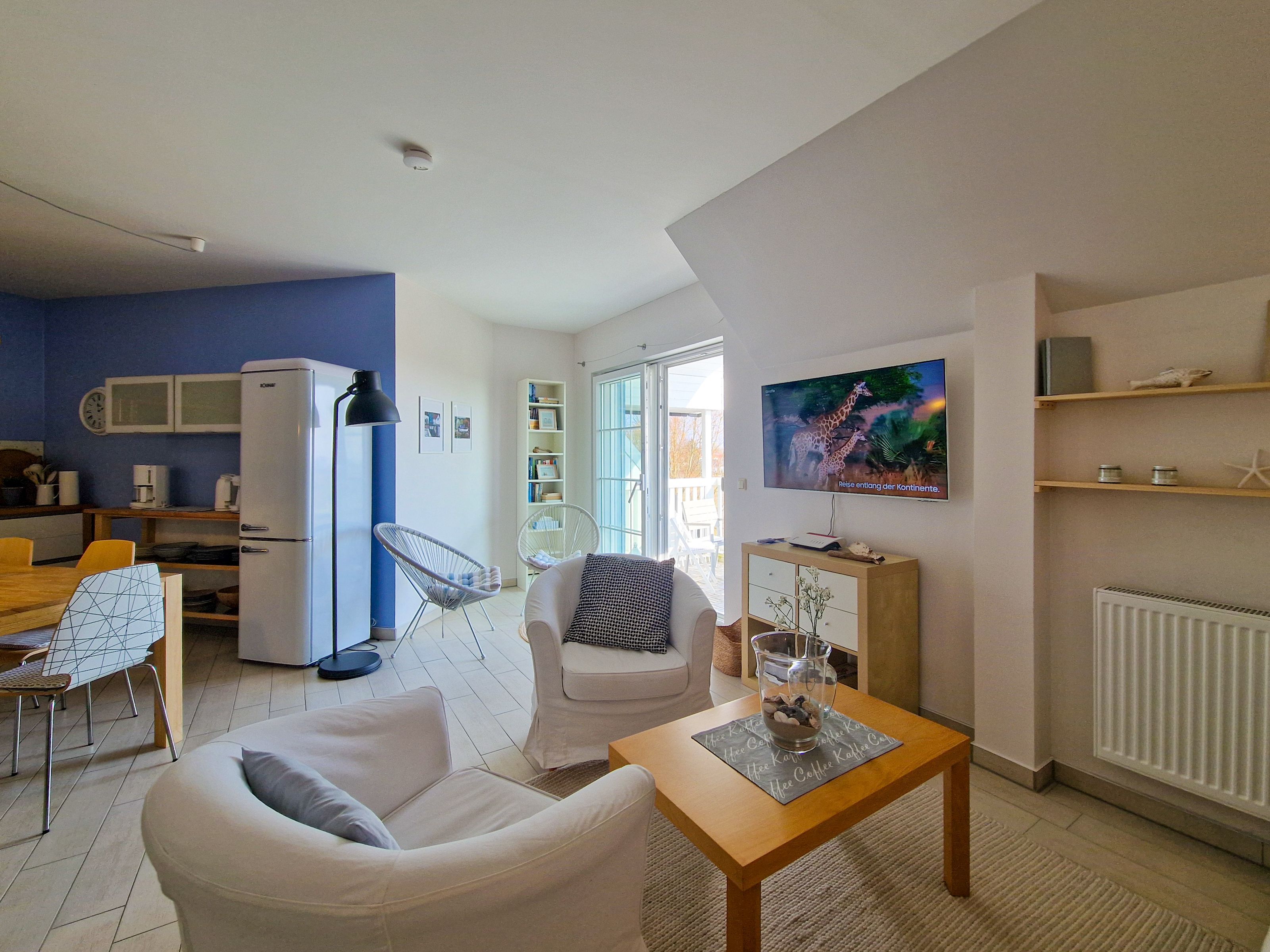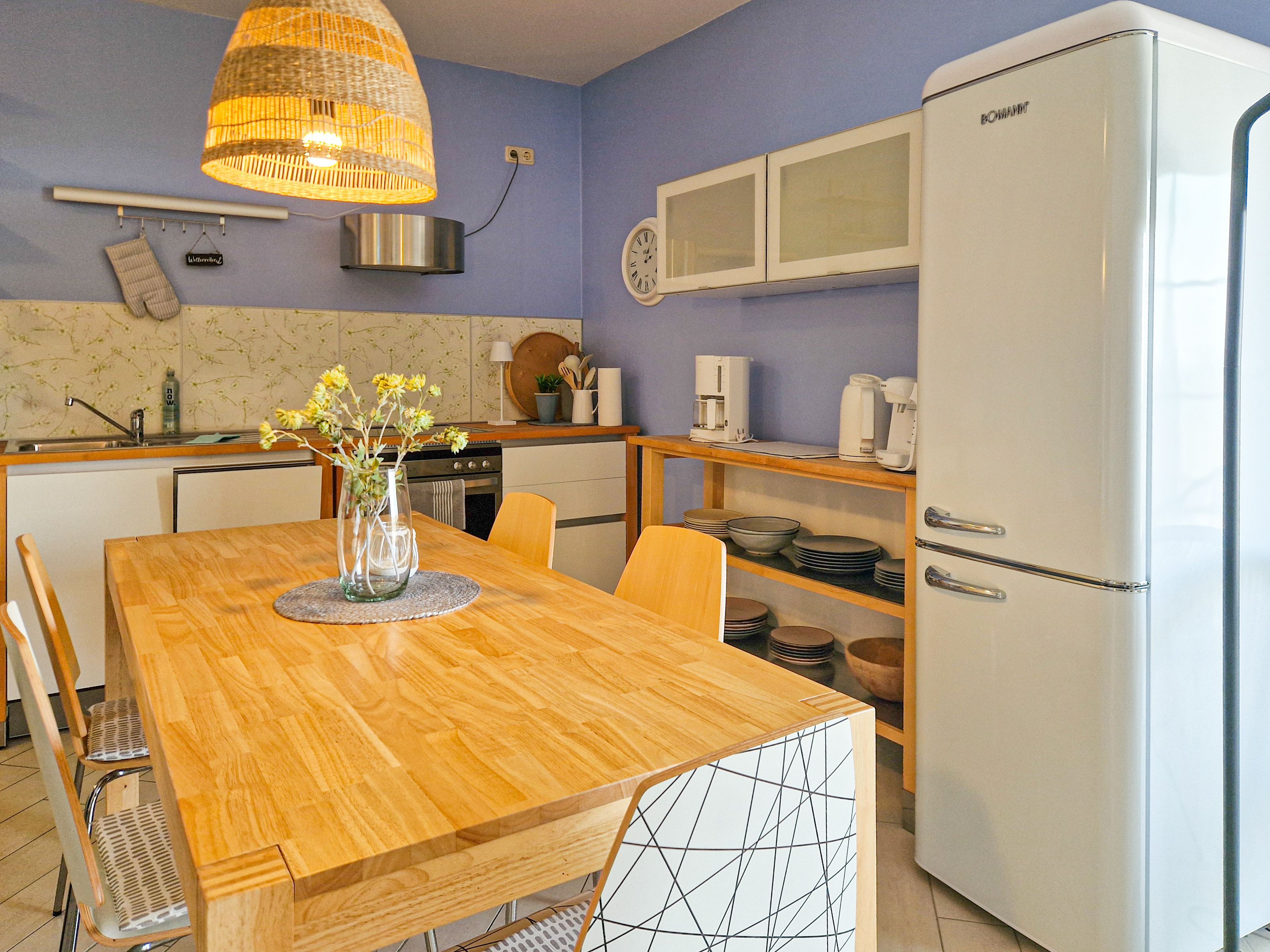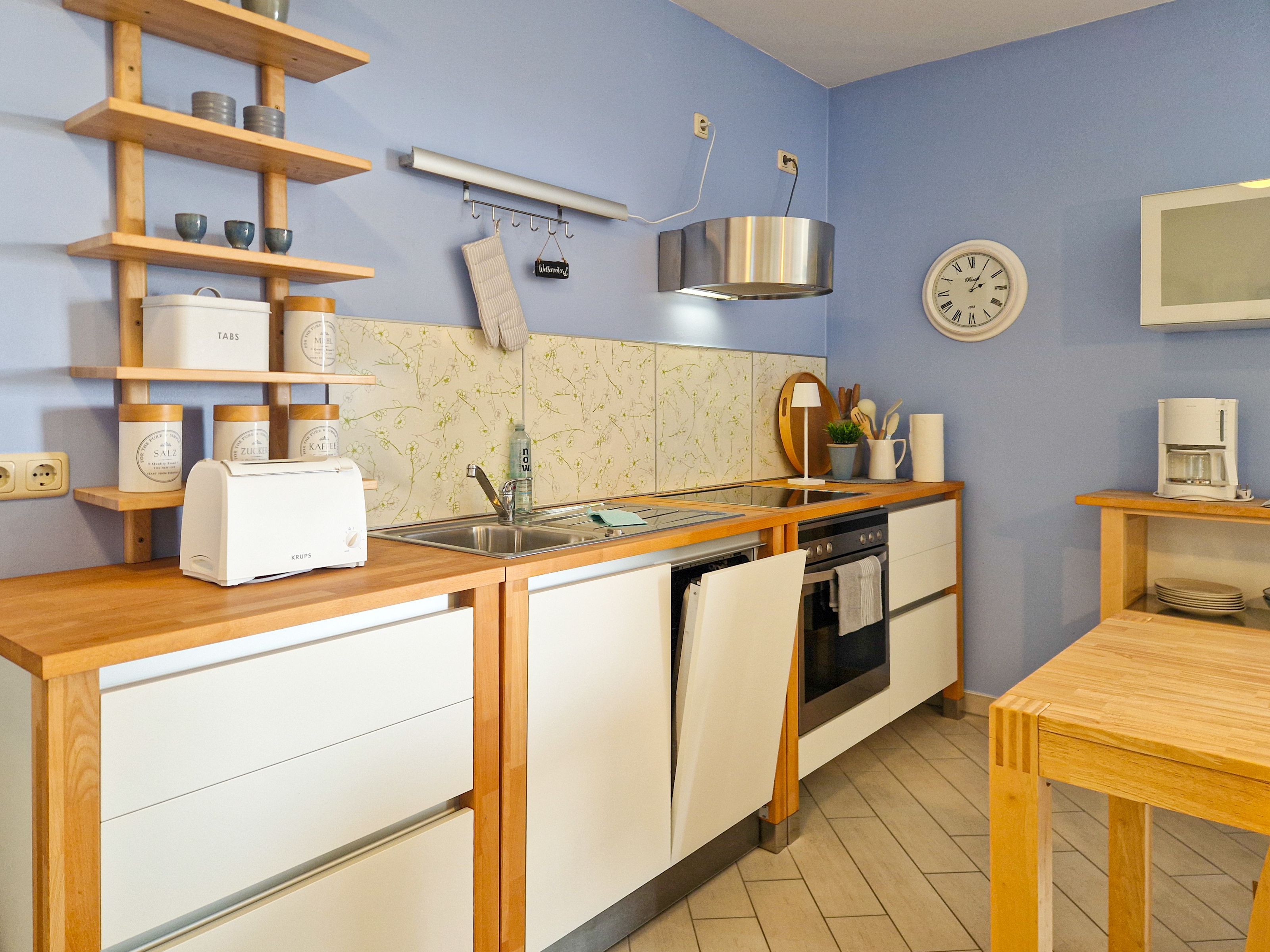 Dieses gemütlich und liebevoll eingerichtete Nichtraucher-Ferienapartment heißt Sie herzlich willkommen. Es bietet Ihnen zwei einladende Schlafzimmer und ein großes Wohnzimmer mit einem Esstisch und einer komfortablen Sitzgarnitur, die zum Entspannen einlädt. Die angrenzende Küchenzeile ist bestens ausgestattet, darunter reichlich Geschirr, ein Toaster, Kaffeemaschine, Kapselkaffeemaschine (TASSIMO), Spülmaschine, Wasserkocher sowie ein E-Herd mit Cerankochfeld und Backofen.