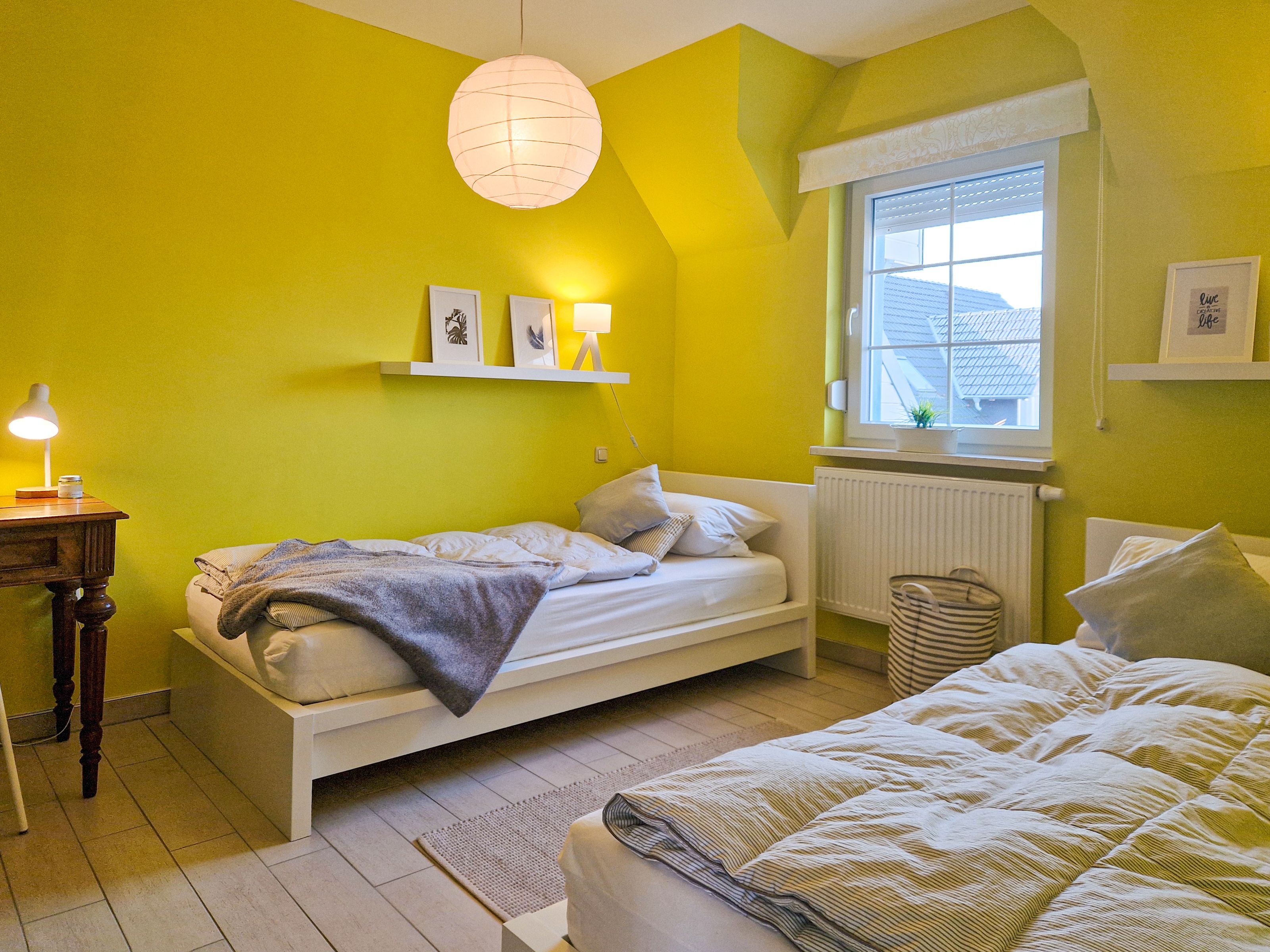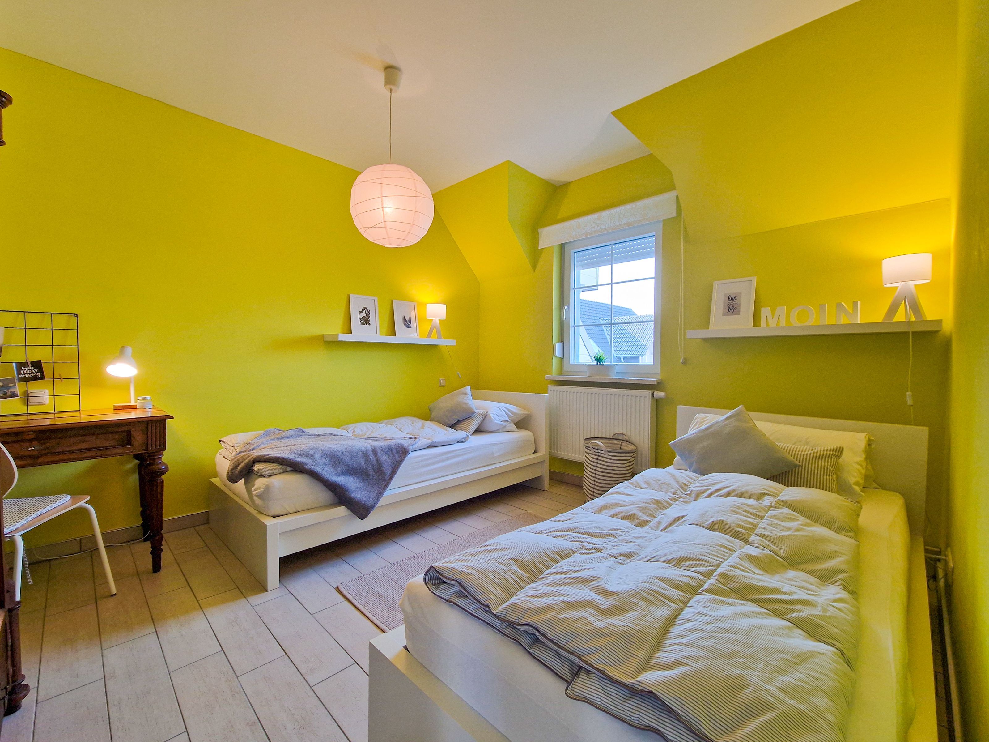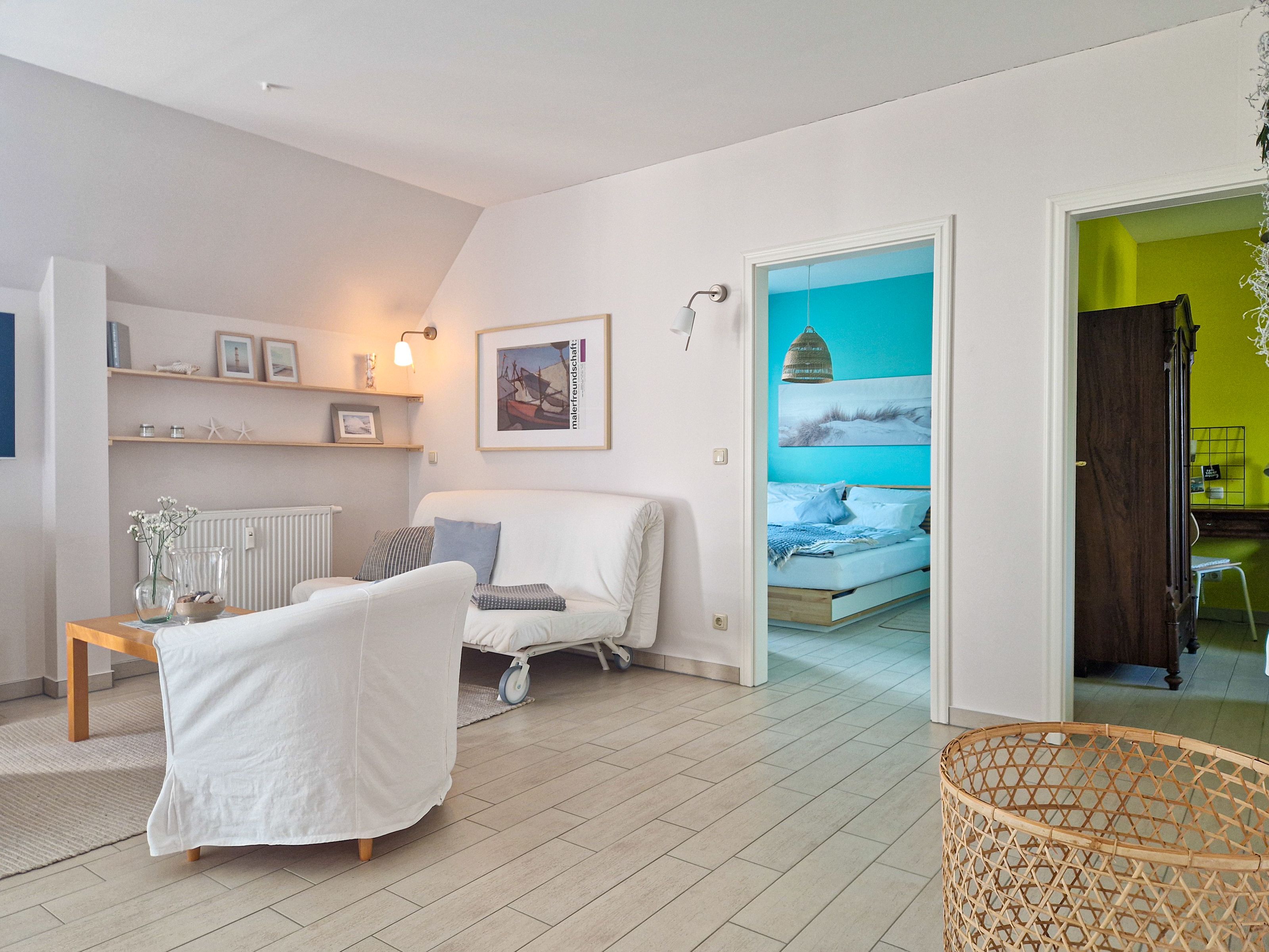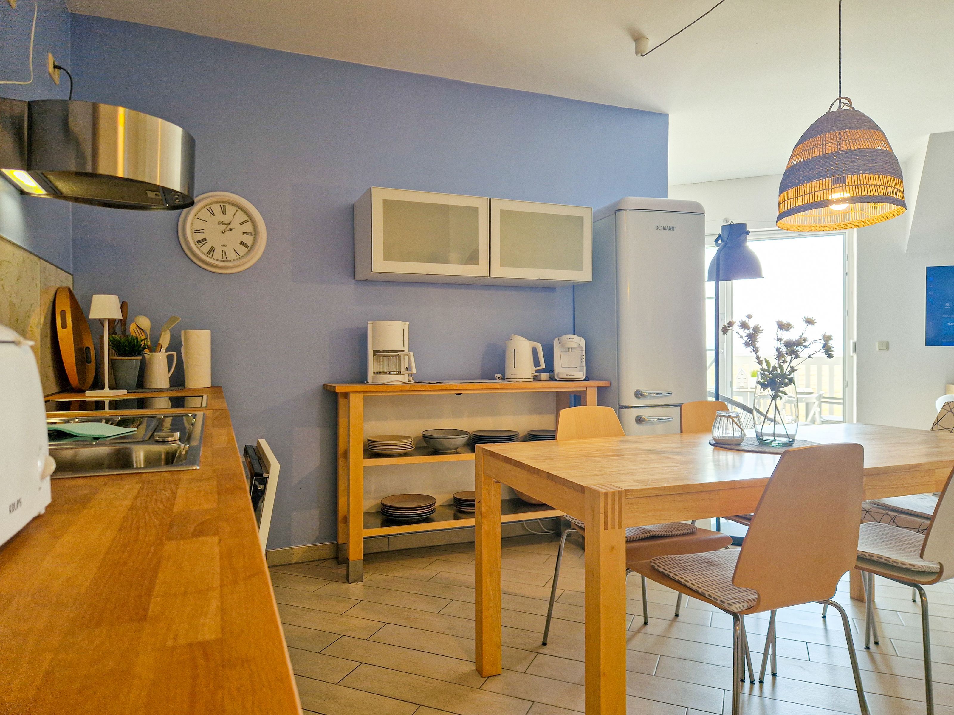 Dieses gemütlich und liebevoll eingerichtete Nichtraucher-Ferienapartment heißt Sie herzlich willkommen. Es bietet Ihnen zwei einladende Schlafzimmer und ein großes Wohnzimmer mit einem Esstisch und einer komfortablen Sitzgarnitur, die zum Entspannen einlädt. Die angrenzende Küchenzeile ist bestens ausgestattet, darunter reichlich Geschirr, ein Toaster, Kaffeemaschine, Kapselkaffeemaschine (TASSIMO), Spülmaschine, Wasserkocher sowie ein E-Herd mit Cerankochfeld und Backofen.