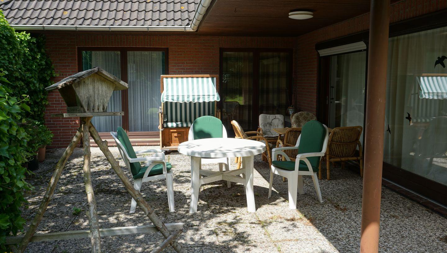 Der große, naturbelassene Garten mit möblierter Terrasse und Strandkorb lädt zum Entspannen ein. Im Garten ist eine Wäschespinne vorhanden für längere Aufenthalte. Zwei Parkplätze stehen direkt am Haus zur Verfügung.