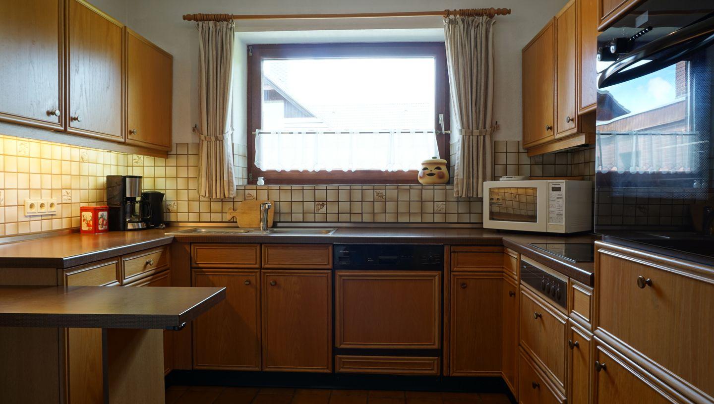 Die voll ausgestattete Küche lässt keine Wünsche offen und beinhaltet einen Backofen, ein Cerankochfeld, einen Geschirrspüler, eine Mikrowelle, einen Kühlschrank und eine Kaffeemaschine.