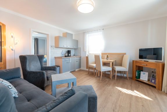 Die offene Küche ist ideal in den Wohnbereich integriert und bietet Ihnen eine kleine Küchenzeile mit Kühlschrank, Kaffeemaschine, Wasserkocher und Geschirr/Besteck alles, was Sie für Ihre Selbstversorgung brauchen. Die Ferienwohnung ist für bis zu 3 Personen perfekt geeignet.