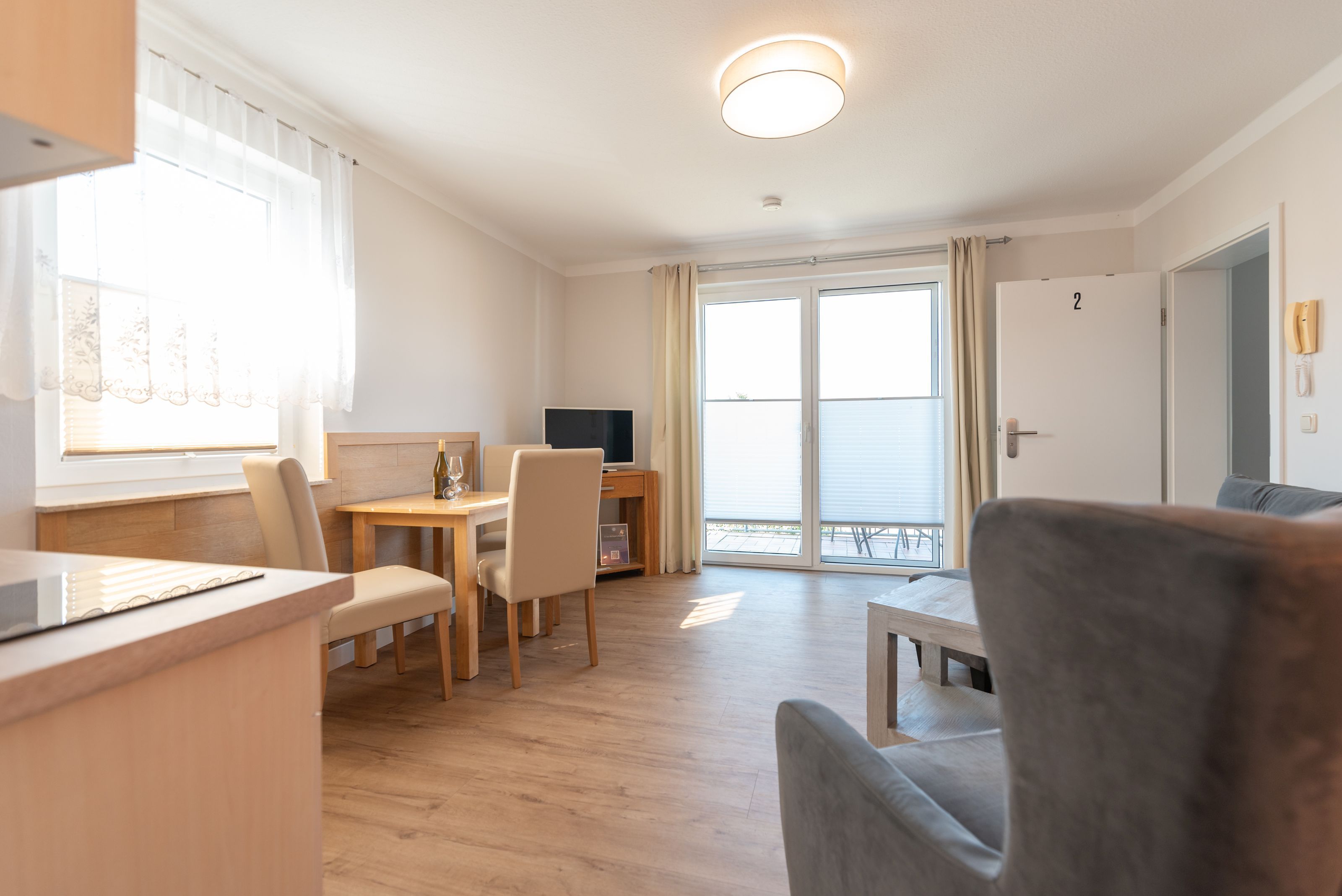 Die Wohnung verfügt über ein gemütliches Schlafzimmer, ein helles Wohnzimmer mit einer kleinen Küchenzeile inklusive Cerankochfeld und ein modernes Badezimmer. Von Ihrem Balkon aus können Sie die frische Luft und die Ruhe der Umgebung genießen.