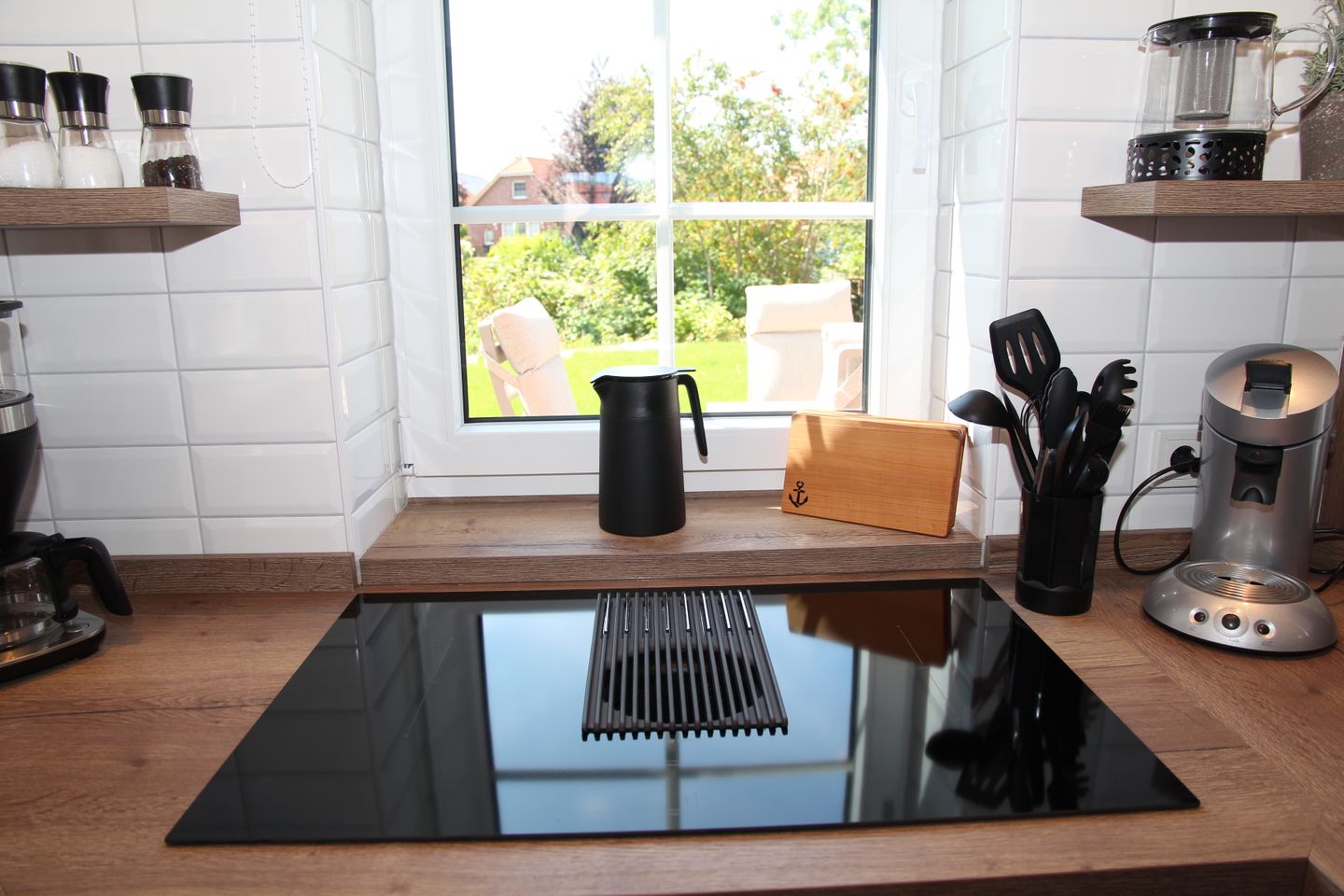 Gleich beim Betreten des Hauses werden Sie den maritimen und hochwertigen Einrichtungsstil des Hauses bemerken. Nach dem Eingangsbereich mit Garderobe kommen Sie in die voll ausgestattete Küche mit schönem Blick vom Induktionskochfeld in den Garten und auf den Kanal. Hier finden Sie Spülmaschine, Kühlschrank mit Gefrierfach, Backofen, Wasserkocher, Toaster, Filterkaffeemaschine, Senseo-Padmaschine und vieles Weiteres. Direkt angrenzend befindet sich der großzügige und helle Wohn- und Essbereich mit großem Esstisch, streaming- und internetfähigen-Fernseher, sowie einem Sofa mit Sessel. Das Highlight ist hier der elektrische Kamin inkl. visuellem und auditivem Ambiente, wie auch einer Heiz- und Kühlfunktion. Entdecken Sie von hier auch den großen, nach Südwest ausgerichteten Garten direkt am Uttumer Sieltief mit eigenem Steg inklusive Sitzbank am Wasser und möblierter Terrasse, von denen die Sonne genossen werden kann.