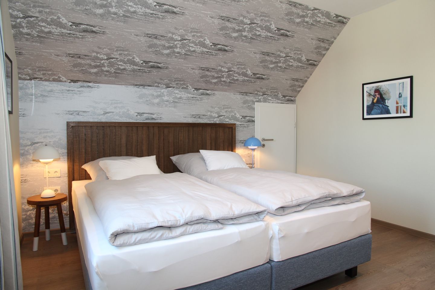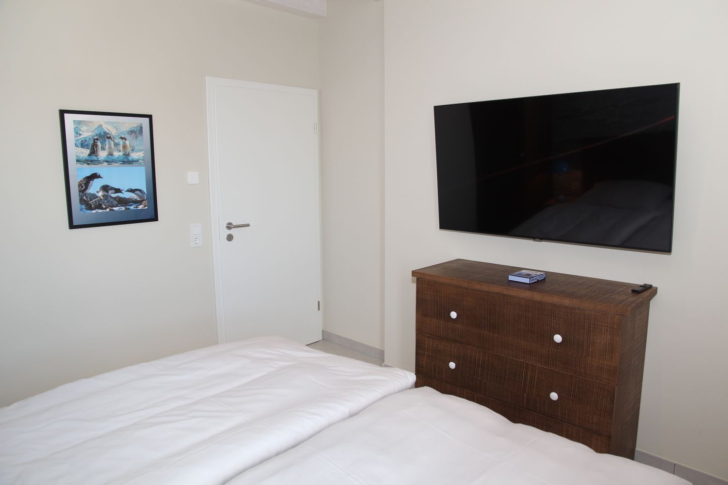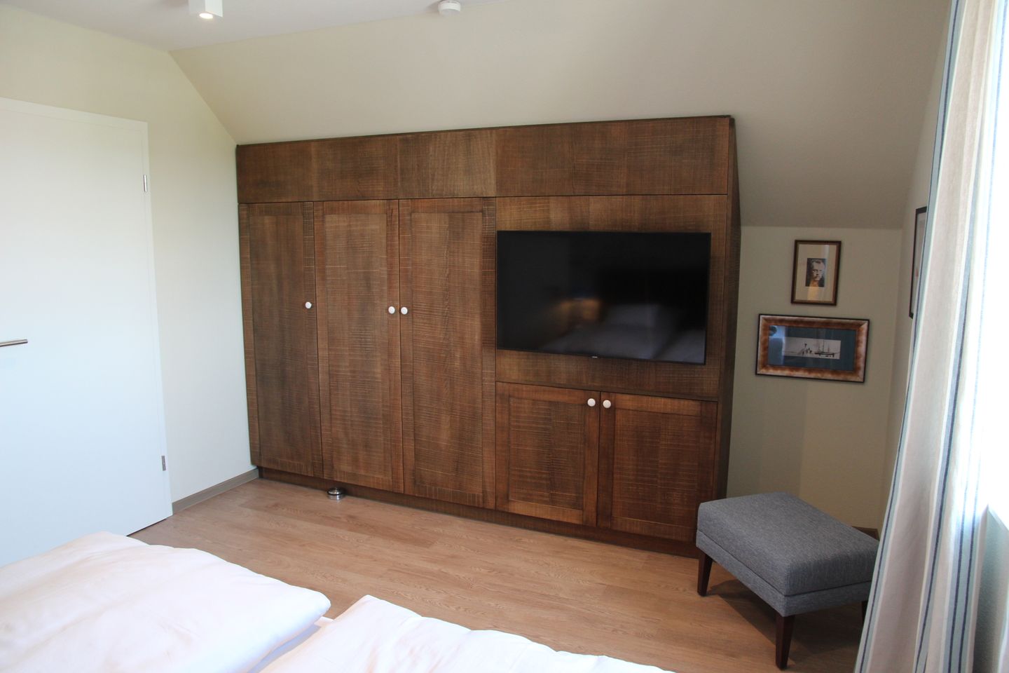 Das Haus verfügt insgesamt über drei Schlafzimmer (jeweils mit 90 x 200cm Betten), wobei zwei davon jeweils mit Doppelbett, Kleiderschrank und Fernseher ausgestattet sind. Eines befindet sich im Erdgeschoss, das andere im Obergeschoss. Das dritte Schlafzimmer befindet sich ebenfalls im Obergeschoss und verfügt neben einem großen Dachfenster über ein Hochbett, bei dem sich unten ein Doppelbett und oben ein Einzelbett befinden, sodass insgesamt sieben Personen im Framheim wohnen können. Zusätzlich sind hier auch ein Kleiderschrank und ein Schreibtisch mit tollem Wasserblick untergebracht.