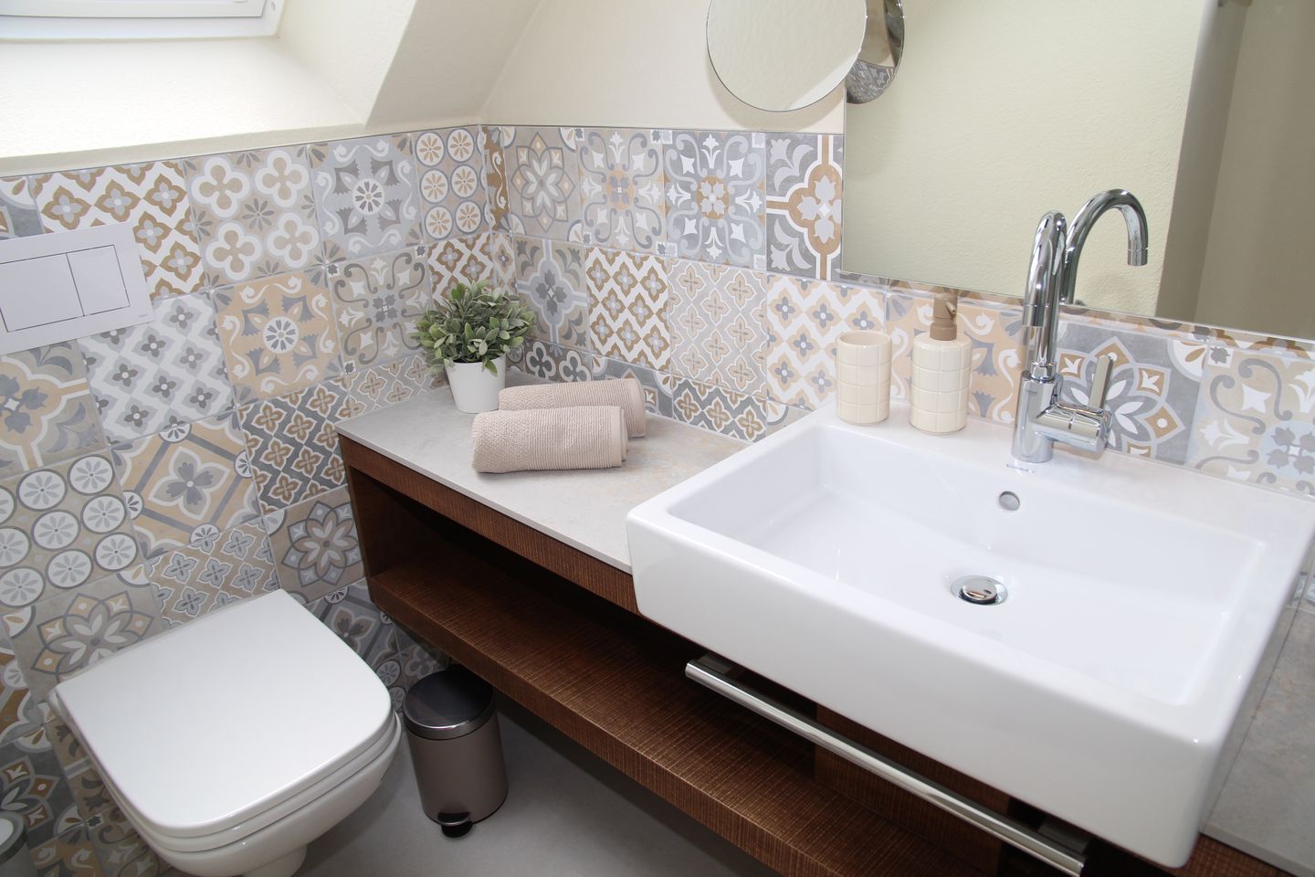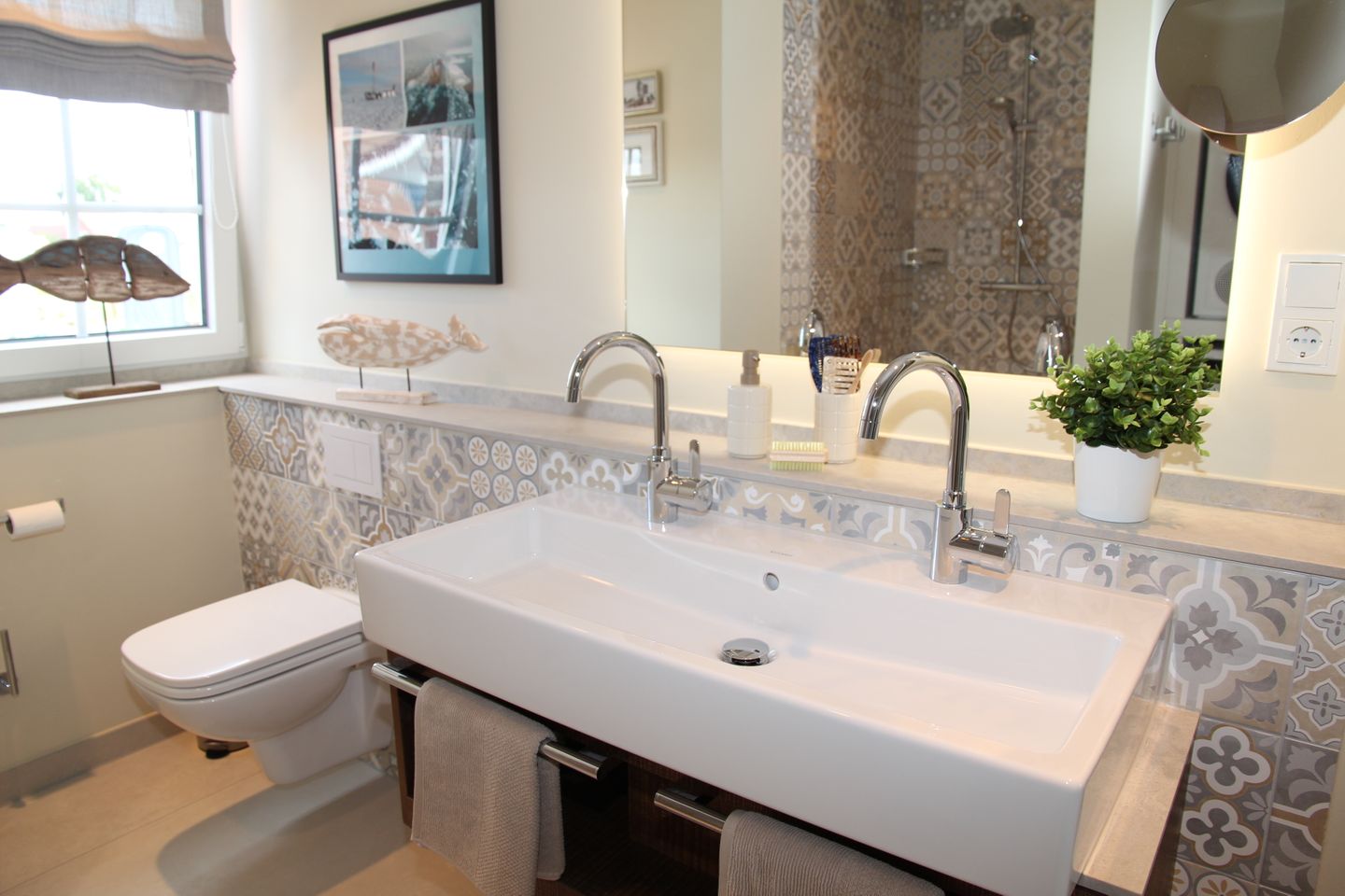 Die beiden Duschbäder (im EG mit Fön, Waschmaschine und Trockner) sind jeweils mit ebenerdiger Dusche inklusive Rainshower, Waschbecken (im EG Doppelwaschbecken) und Toilette ausgestattet.