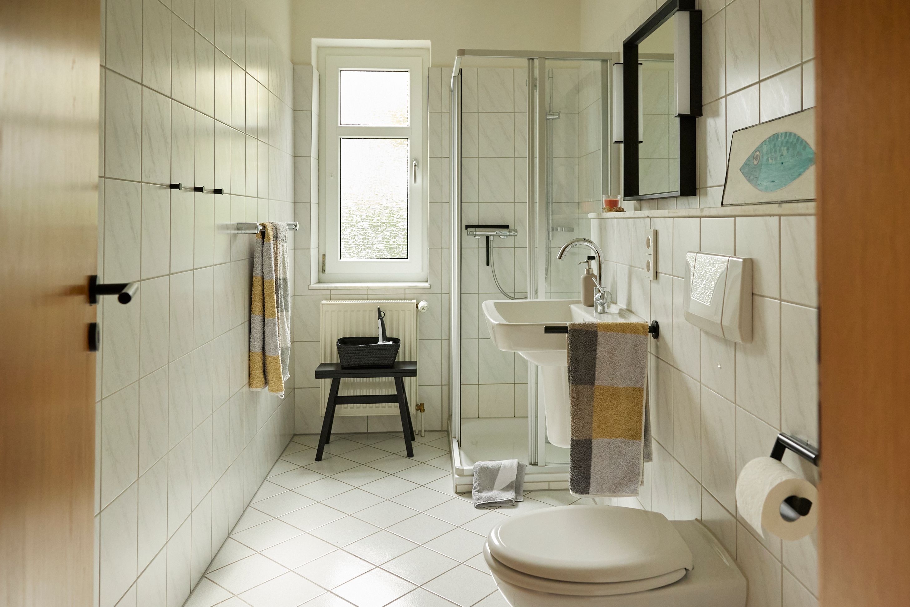 geräumiges Bad mit Dusche und Fenster (Föhn vorhanden)