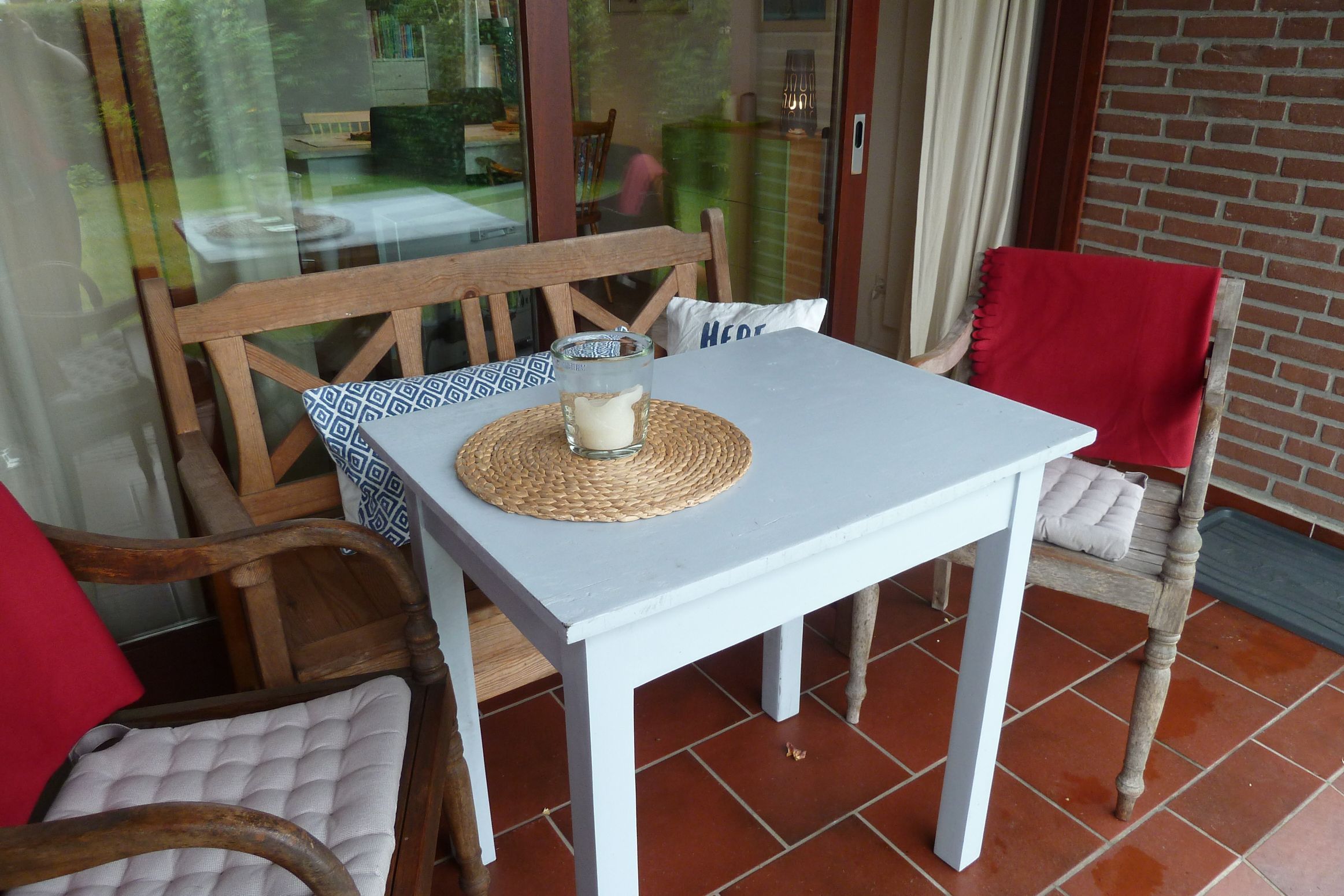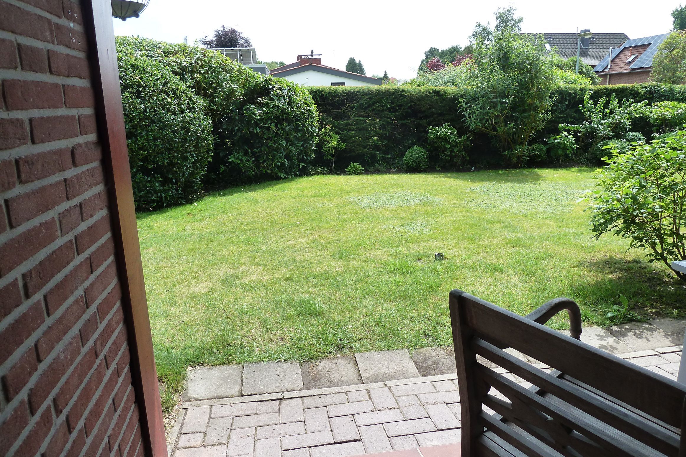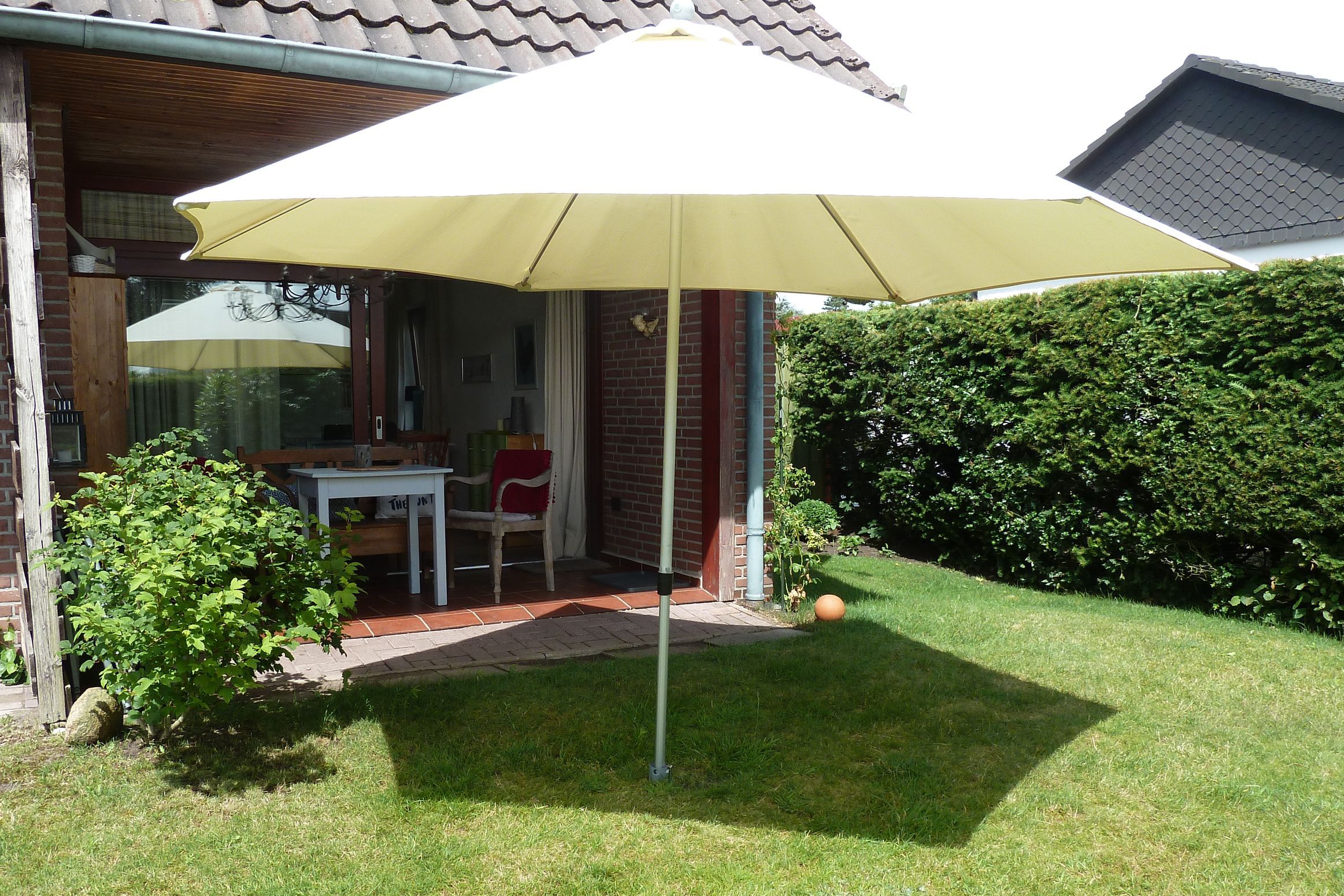 eine teilüberdachte Süd-Terrasse mit Blick in den Garten
