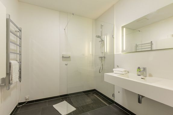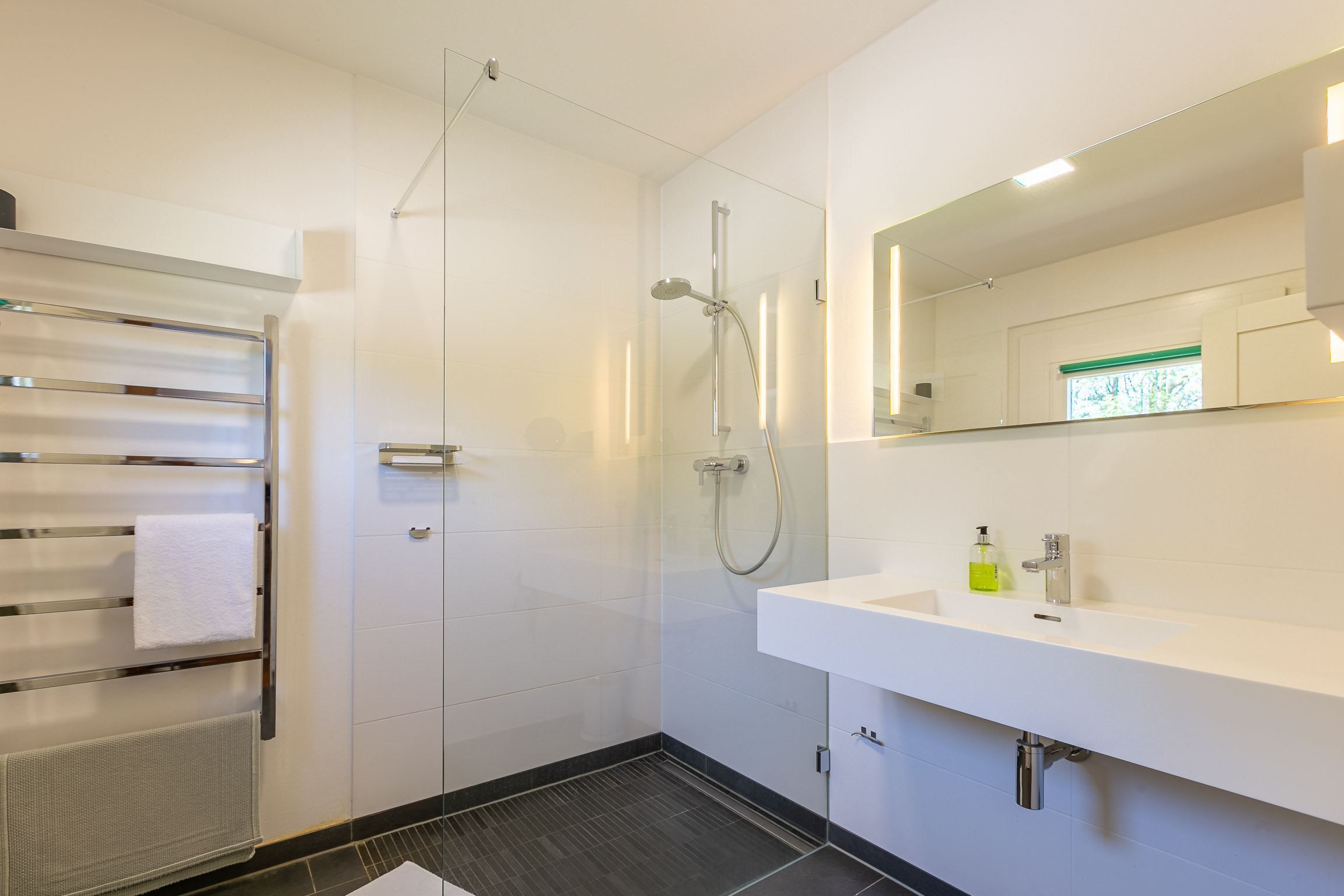 2. Badezimmer (ID 349) mit bodengleicher Dusche, Tageslicht und Föhn. Separates WC.
