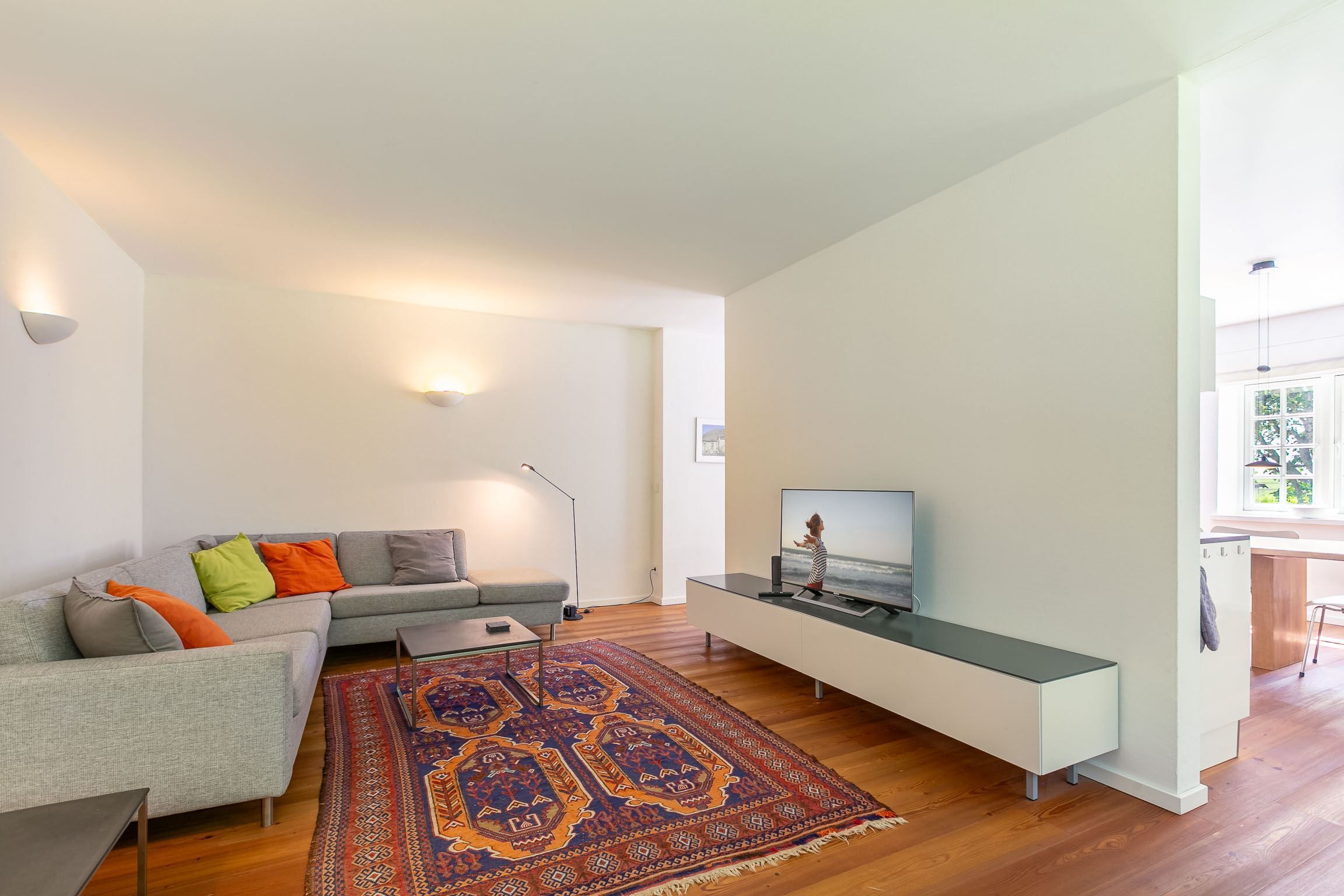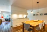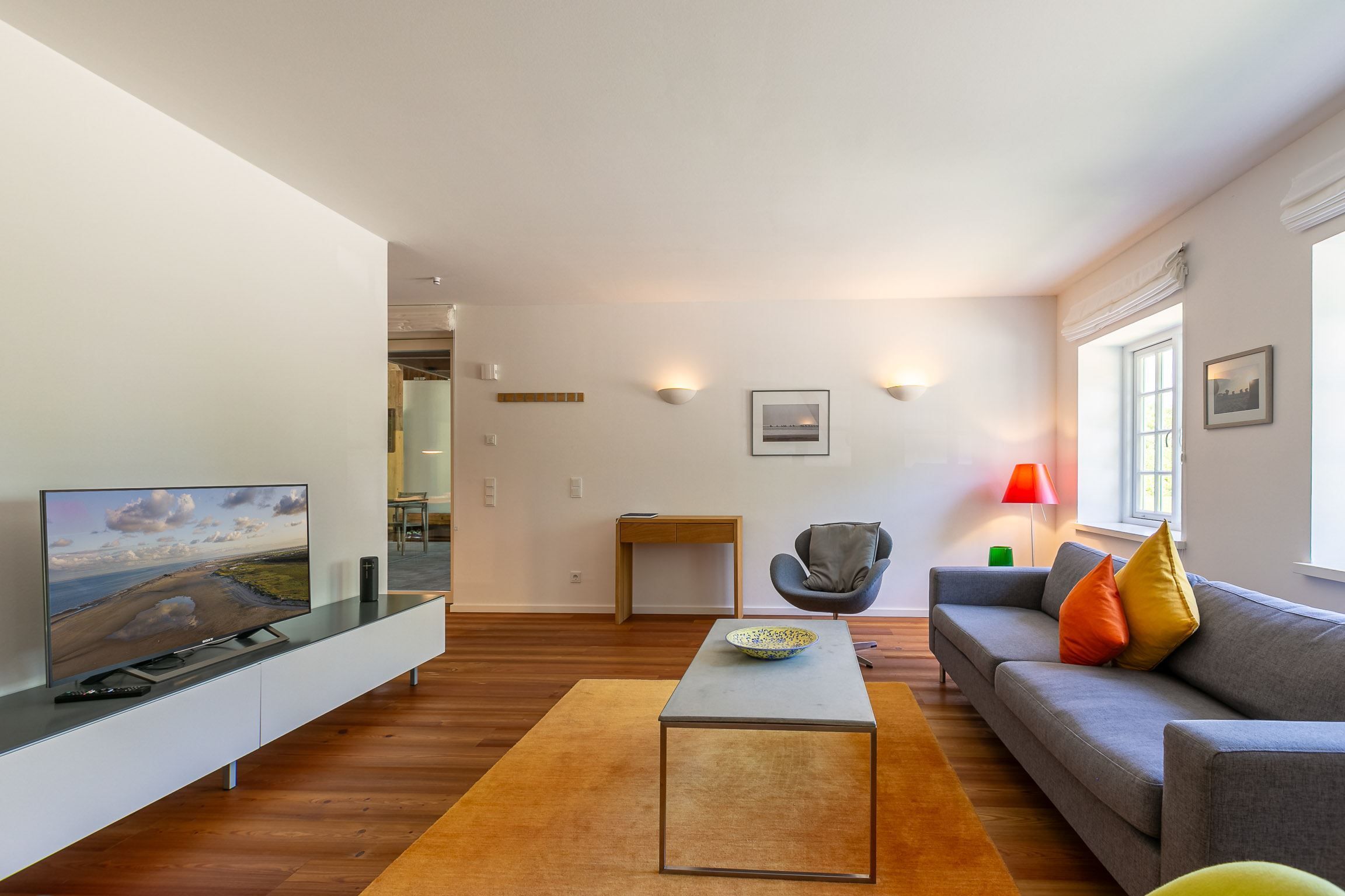 2. Wohnzimmer (ID 349) mit großem Sofa, 2 Sesseln und TV (Sat). Offene Küche mit Backofen, Geschirrspüler, Kühlschrank mit Gefrierfach und großem Esstisch für bis zu 6 Personen.