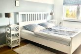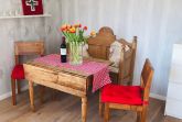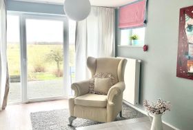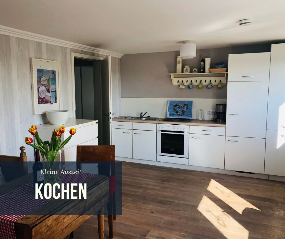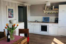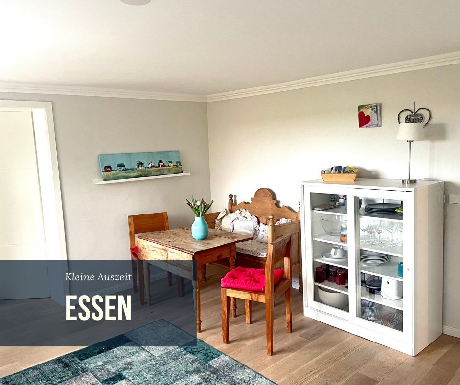 Der Essbereich ist mit einer Küchenzeile ausgestattet und mit friesischen Elementen wie einer antiken Bank und einem Tisch. Das liebevoll eingerichtete Wohnzimmer verfügt über eine Ausziehcouch, die als Bett(160cm) genutzt werden kann, TV und bodentiefen Fenstern. Im kuscheligen Schlafzimmer befindet sich ein Doppelbett. Neben dem Blick in die Natur ist das Highlight dieser Wohnung das hochwertig-ausgestattete Badezimmer mit begehbarer Dusche und einer XL-Badewanne.