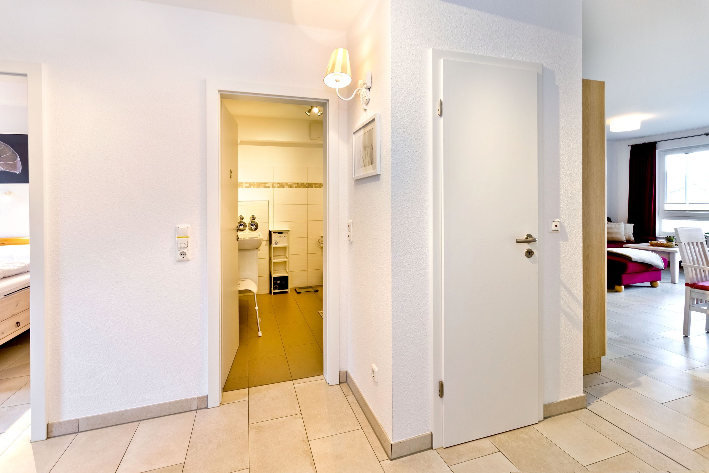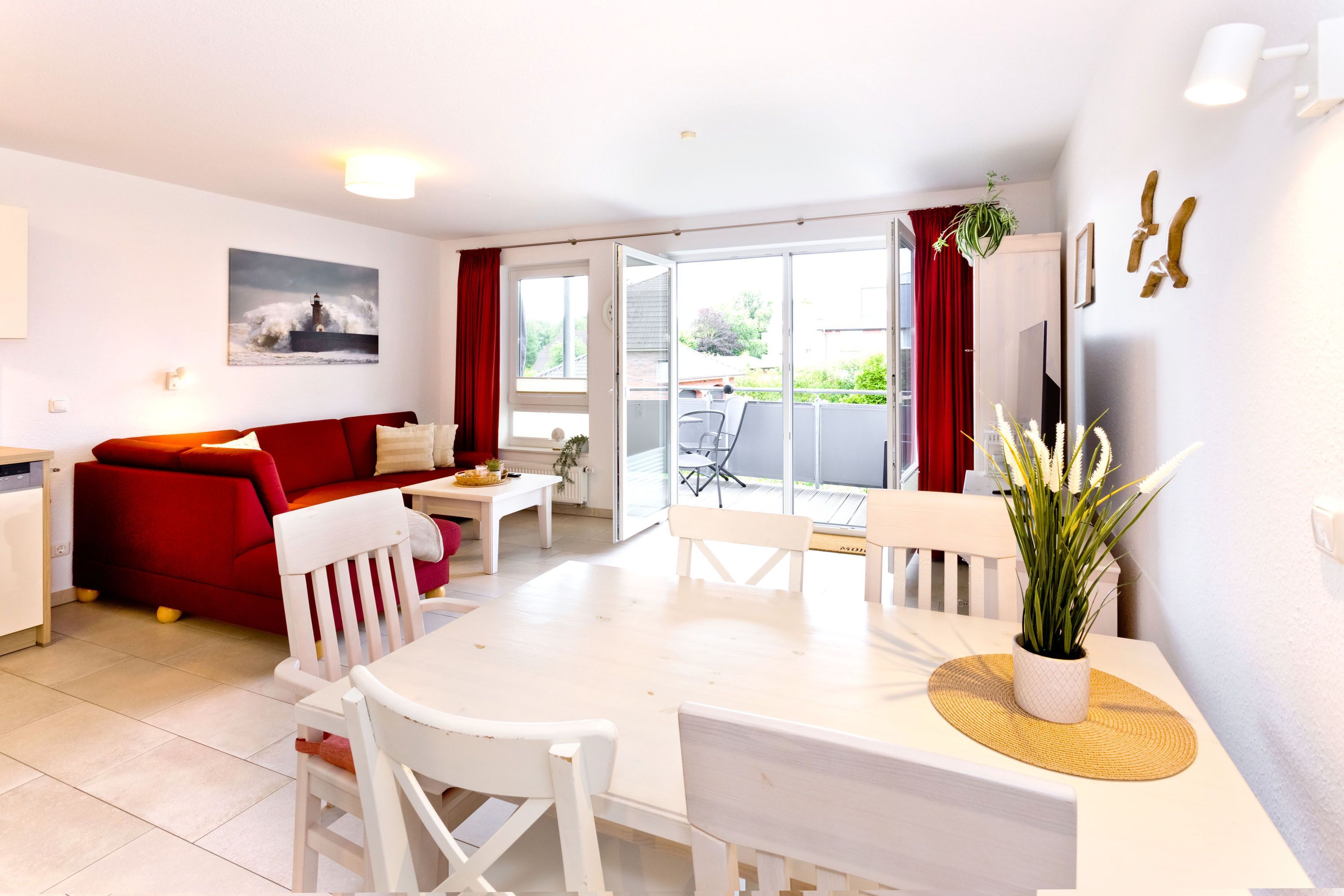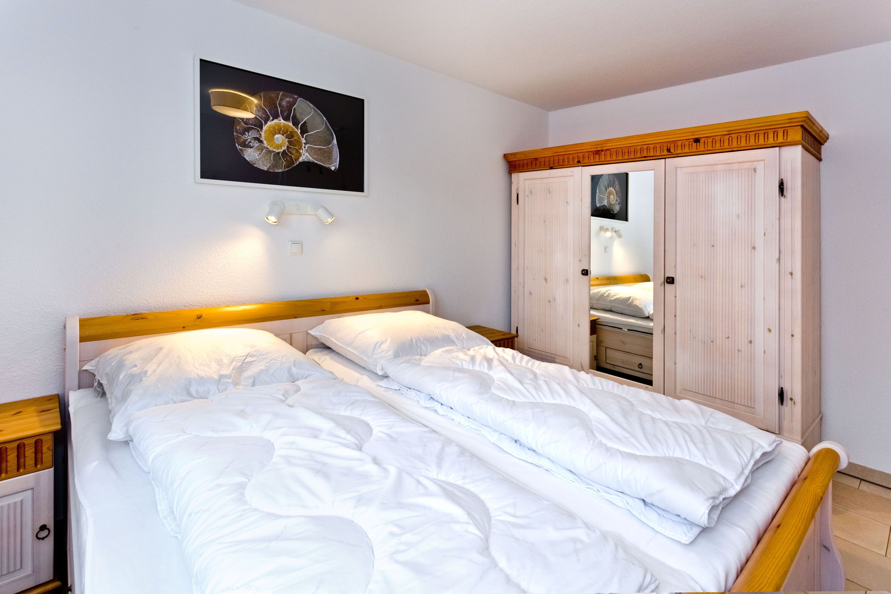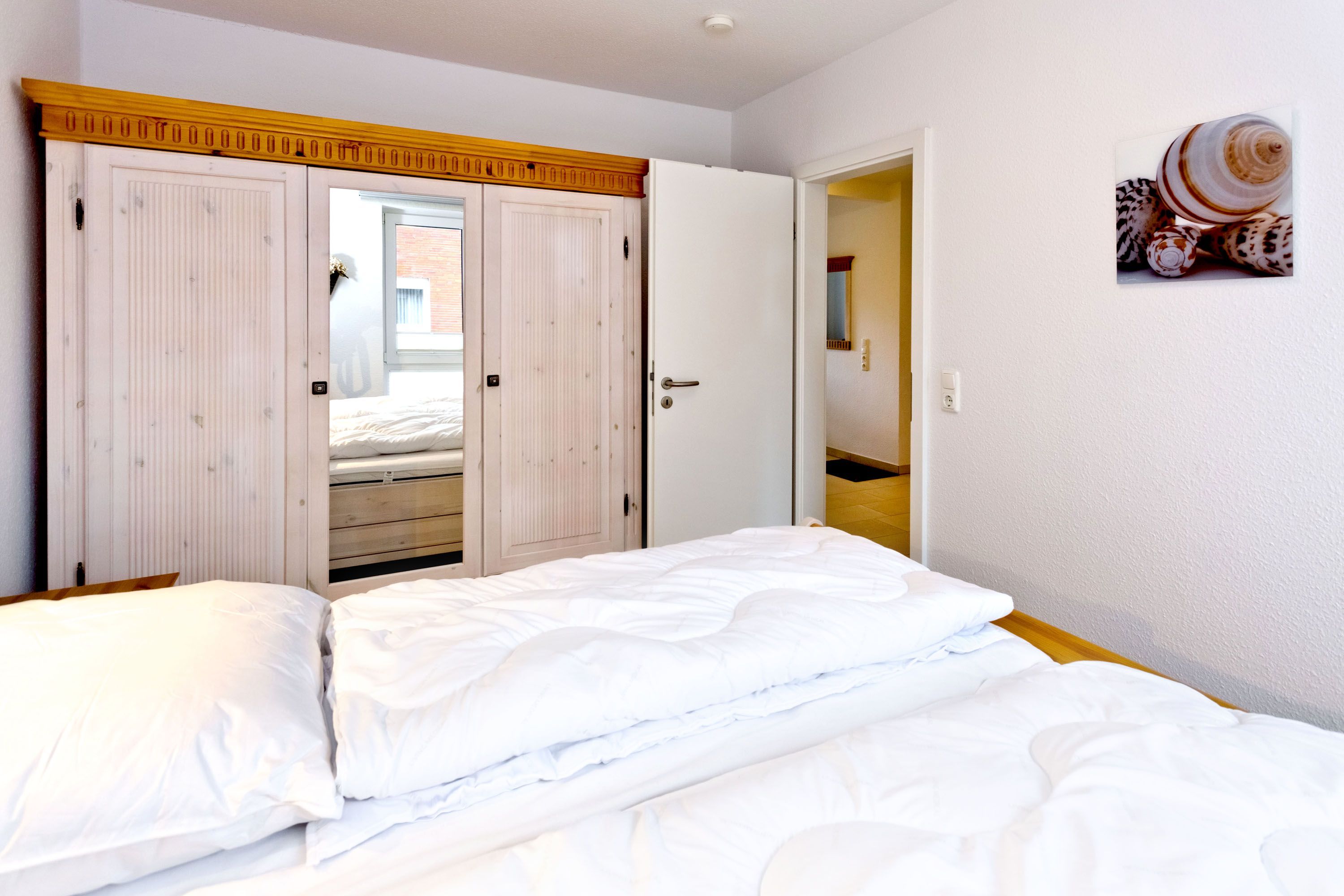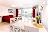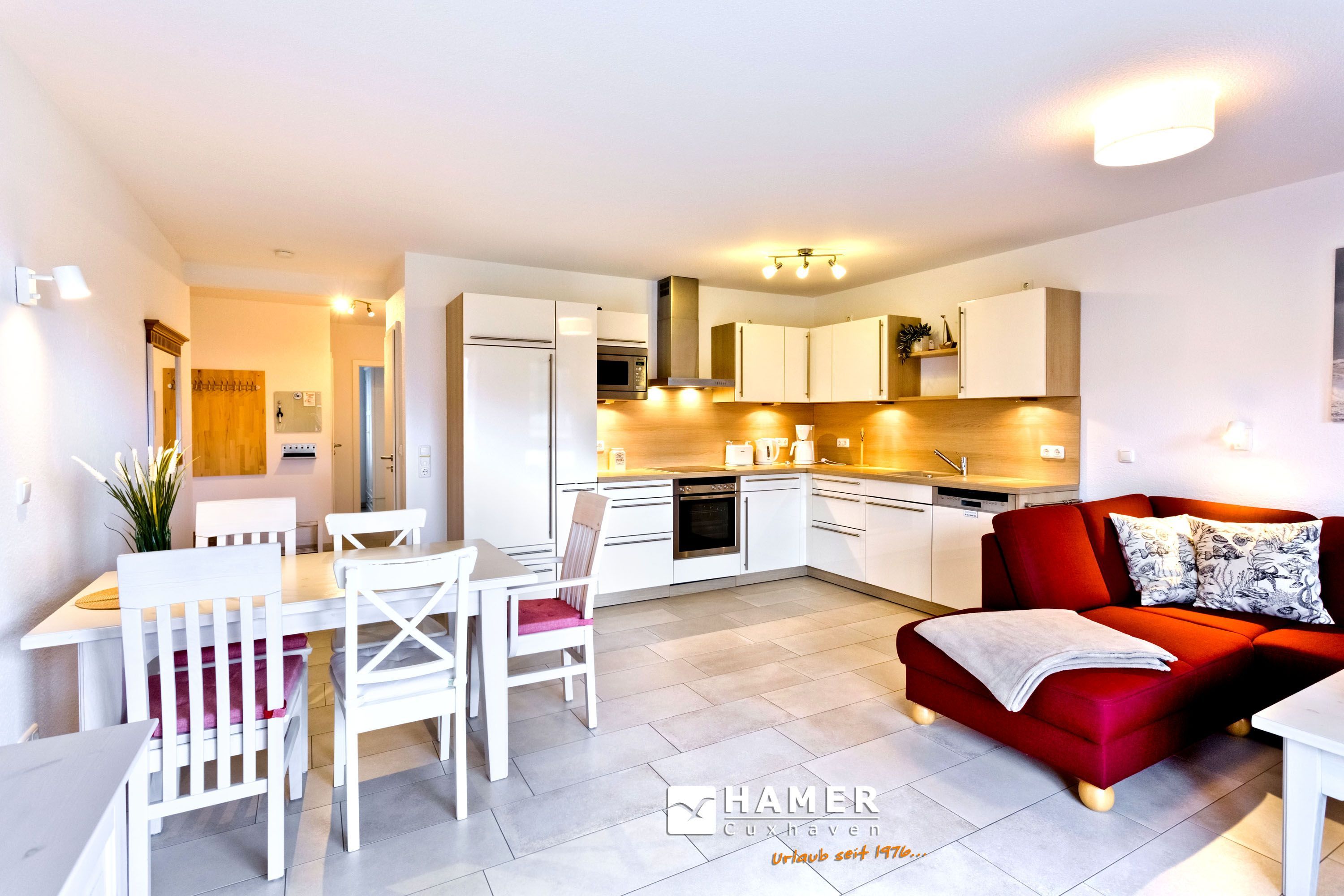 Sehr schöne 3-Zimmer-Wohnung auf ca. 62m², 1. Etage mit Aufzug erreichbar, Wohnzimmer mit vollausgestatteter Küchenzeile (Backofen, Mikrowelle, Geschirrspüler, Kühlschrank mit 3 Sterne Gefrierfach) Kabel-TV, kostenloses W-LAN-Internet, 1 Schlafzimmer mit Doppelbett, 1 Schlafzimmer mit Etagenbetten, alle Räume mit Insektenschutz an den Fenstern, ebenerdige Dusche u. WC, separates Gäste-WC, komfortables Wohnzimmer mit großem Balkon (süd-ost) inkl. Balkonmöbeln und Sonnenschirm, reservierter Pkw-Stellplatz #6 hinter dem Gebäude, keine Haustiere erlaubt, Nichtraucher.