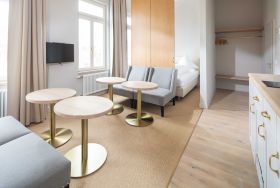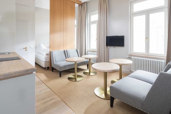 In diesem Ein-Raum-Appartement erwarten Sie zwei 1,80 x 2,10 m großes Premium-Boxspringbetten, eine Kochnische sowie ein modernes Badezimmer. Der Boden des Appartements ist mit einem Sisal-Teppich ausgestattet, vor der Küchenzeile finden Sie Echtholzboden vor.