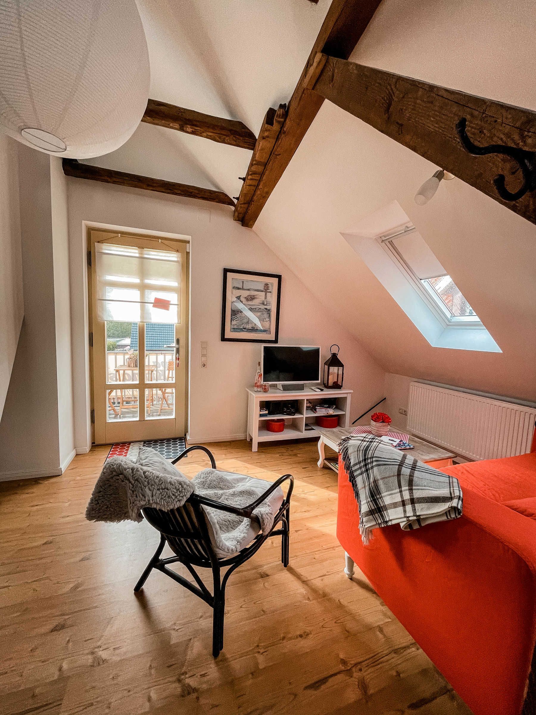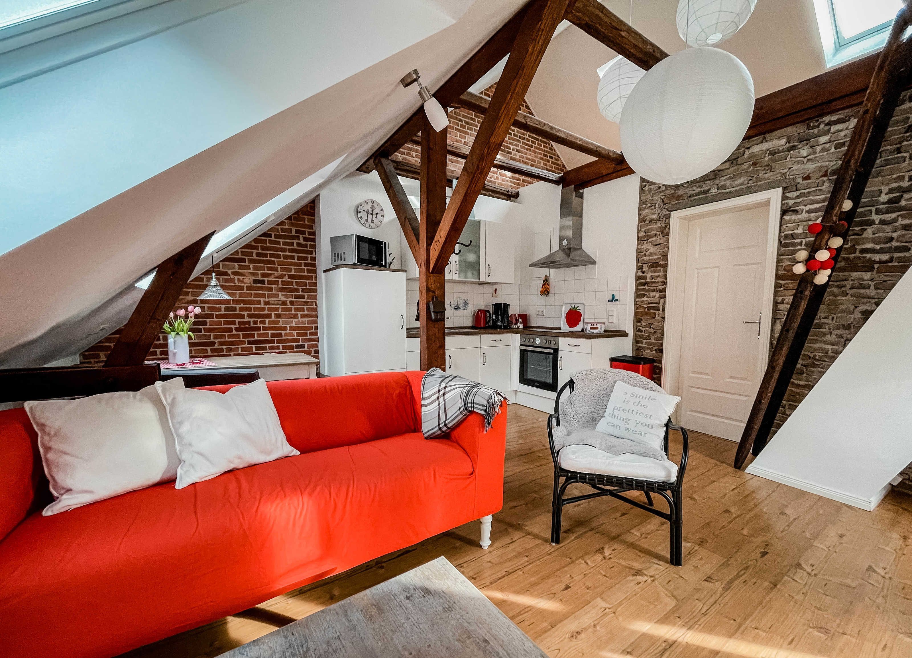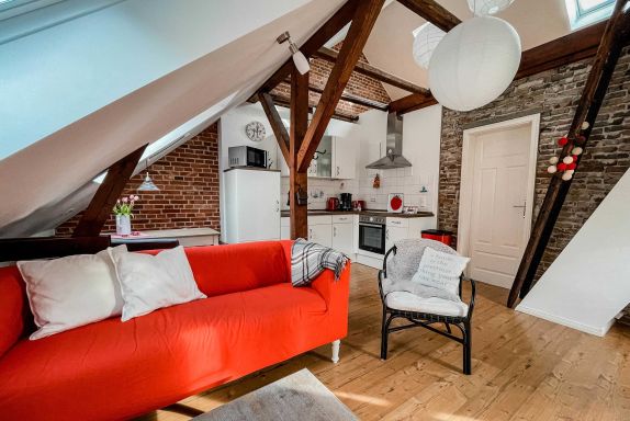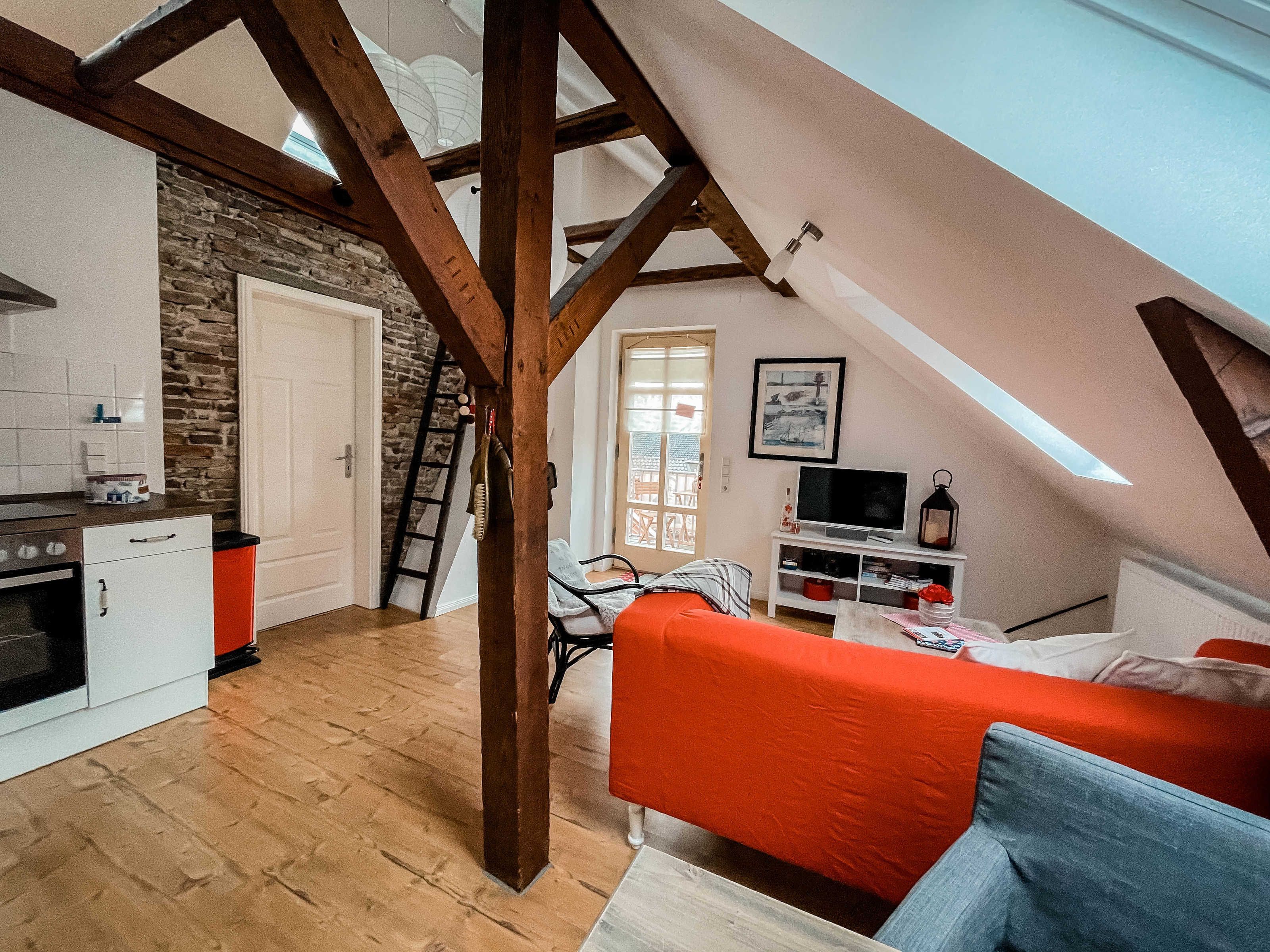 Die Nichtraucherwohnung ist 38qm groß, hat einen 6qm Balkon in Südlage und ist bis in die Dachspitze offen ausgebaut. Die Wohnung ist geeignet für max. zwei Erwachsene Personen und einem Kind bis zum Alter von drei Jahren. Das alte Balken- und Mauerwerk ist in Sicht und gibt der Wohnung in dem denkmalgeschützten Gebäude eine besondere Atmosphäre. Sie besteht aus Wohn-/Essraum, Schlafzimmer, Bad mit Dusche und WC. Küche mit Geschirrspüler, Kühlschrank, Backofen, Herd, Mikrowelle.
