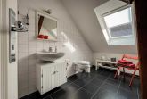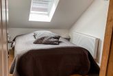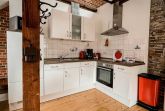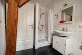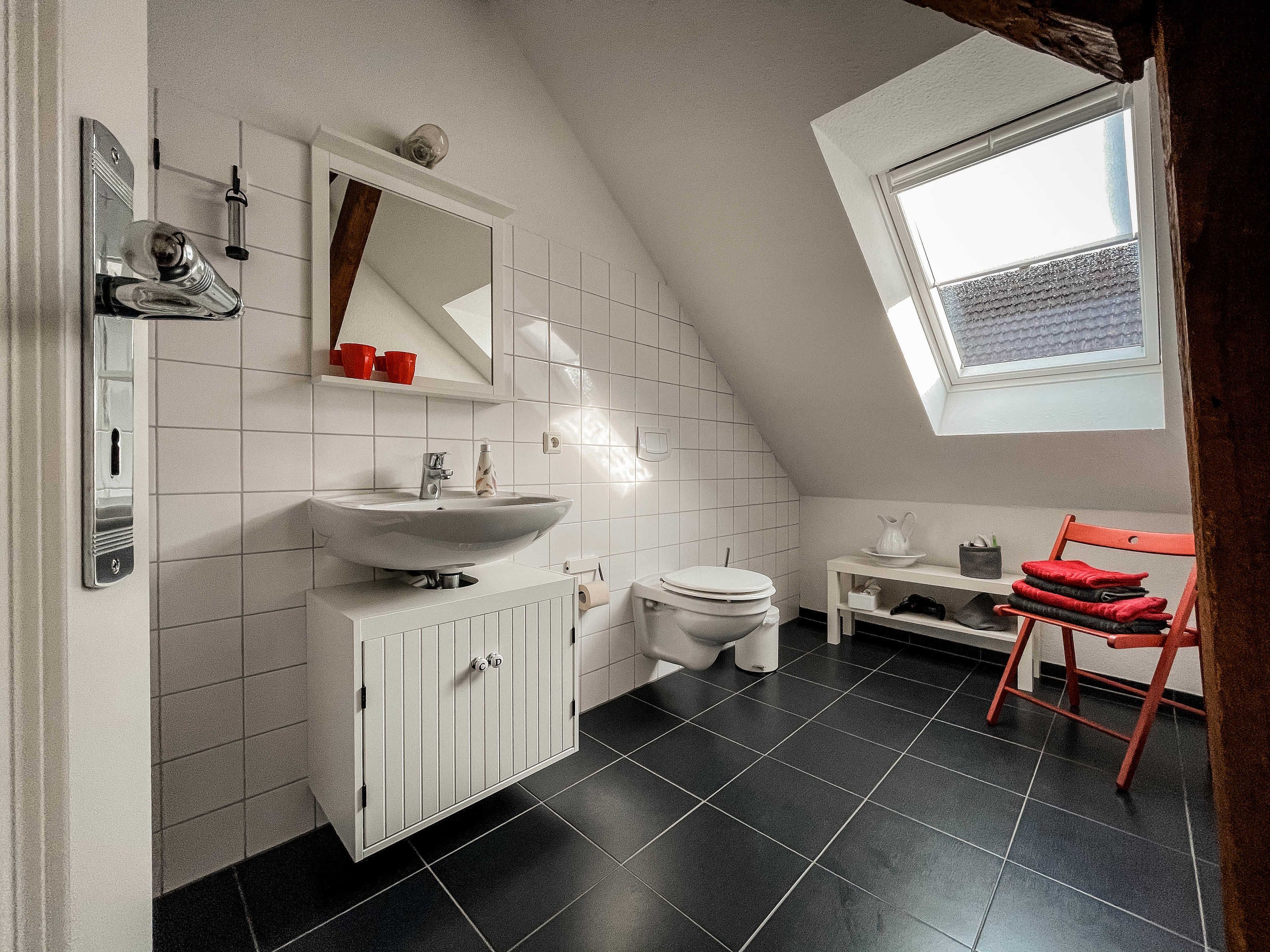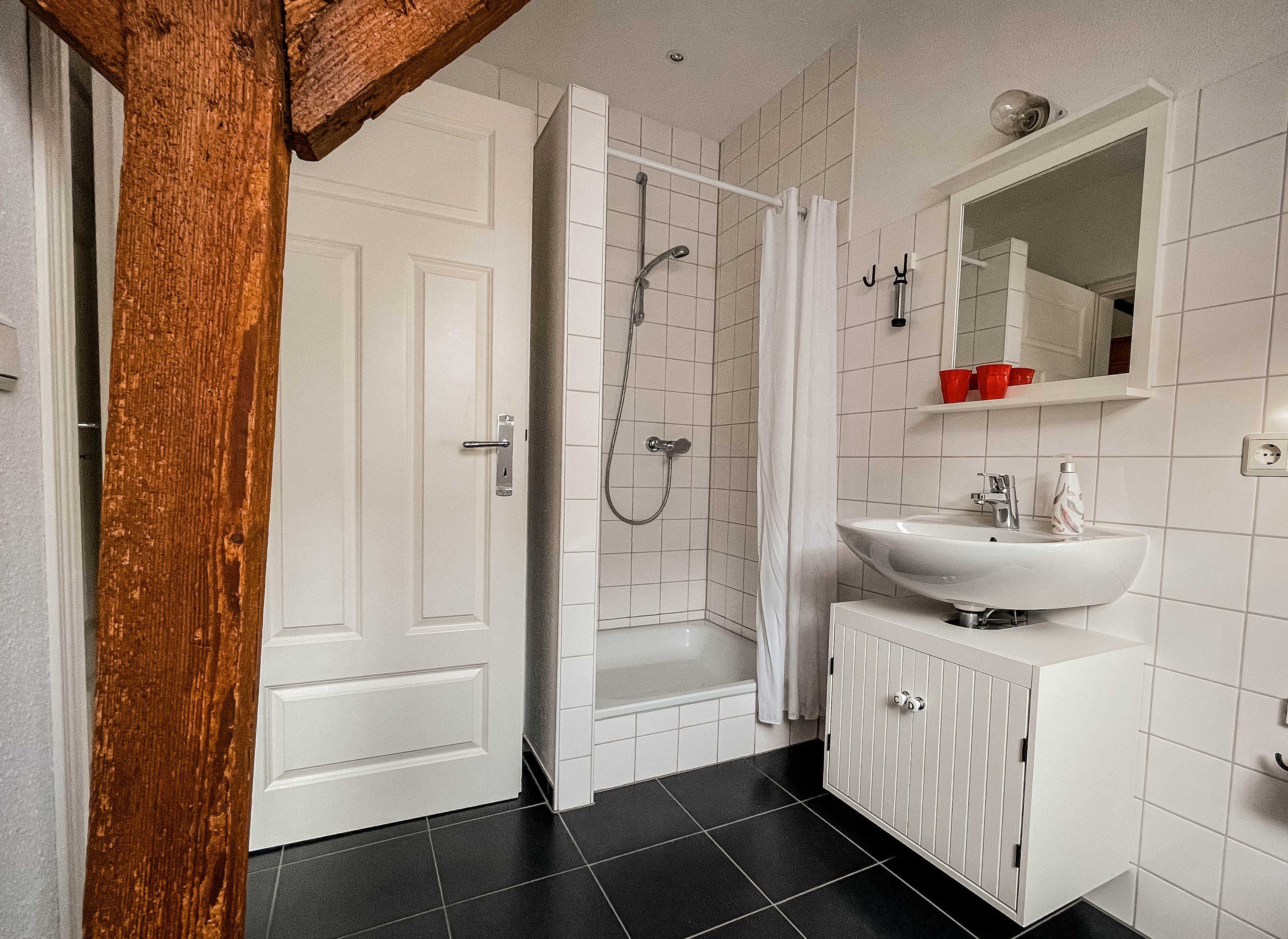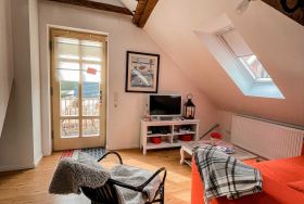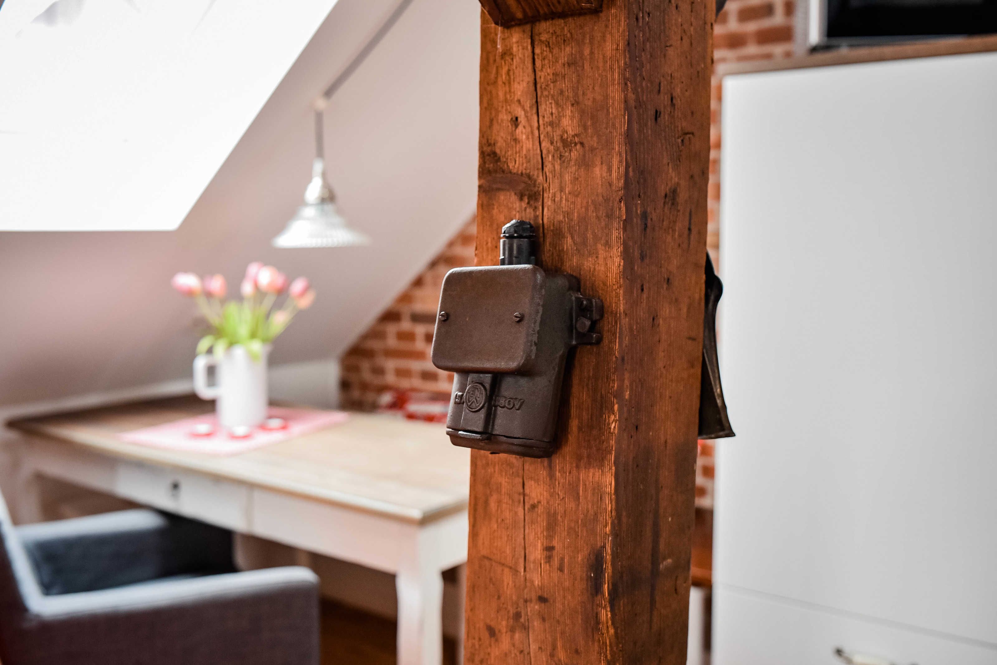Die Nichtraucherwohnung ist 38qm groß, hat einen 6qm Balkon in Südlage und ist bis in die Dachspitze offen ausgebaut. Die Wohnung ist geeignet für max. zwei Erwachsene Personen und einem Kind bis zum Alter von drei Jahren. Das alte Balken- und Mauerwerk ist in Sicht und gibt der Wohnung in dem denkmalgeschützten Gebäude eine besondere Atmosphäre. Sie besteht aus Wohn-/Essraum, Schlafzimmer, Bad mit Dusche und WC. Küche mit Geschirrspüler, Kühlschrank, Backofen, Herd, Mikrowelle.
