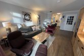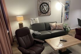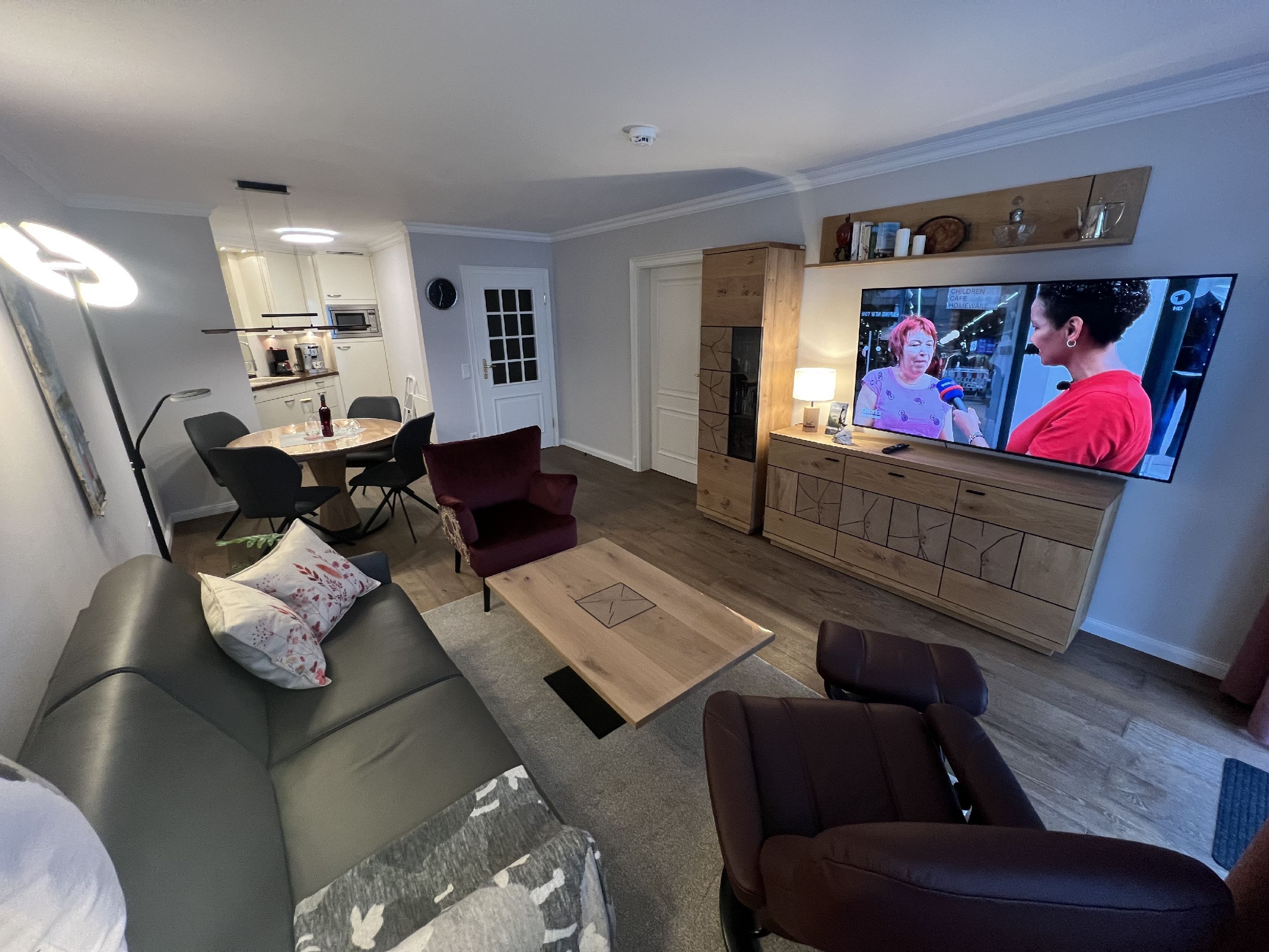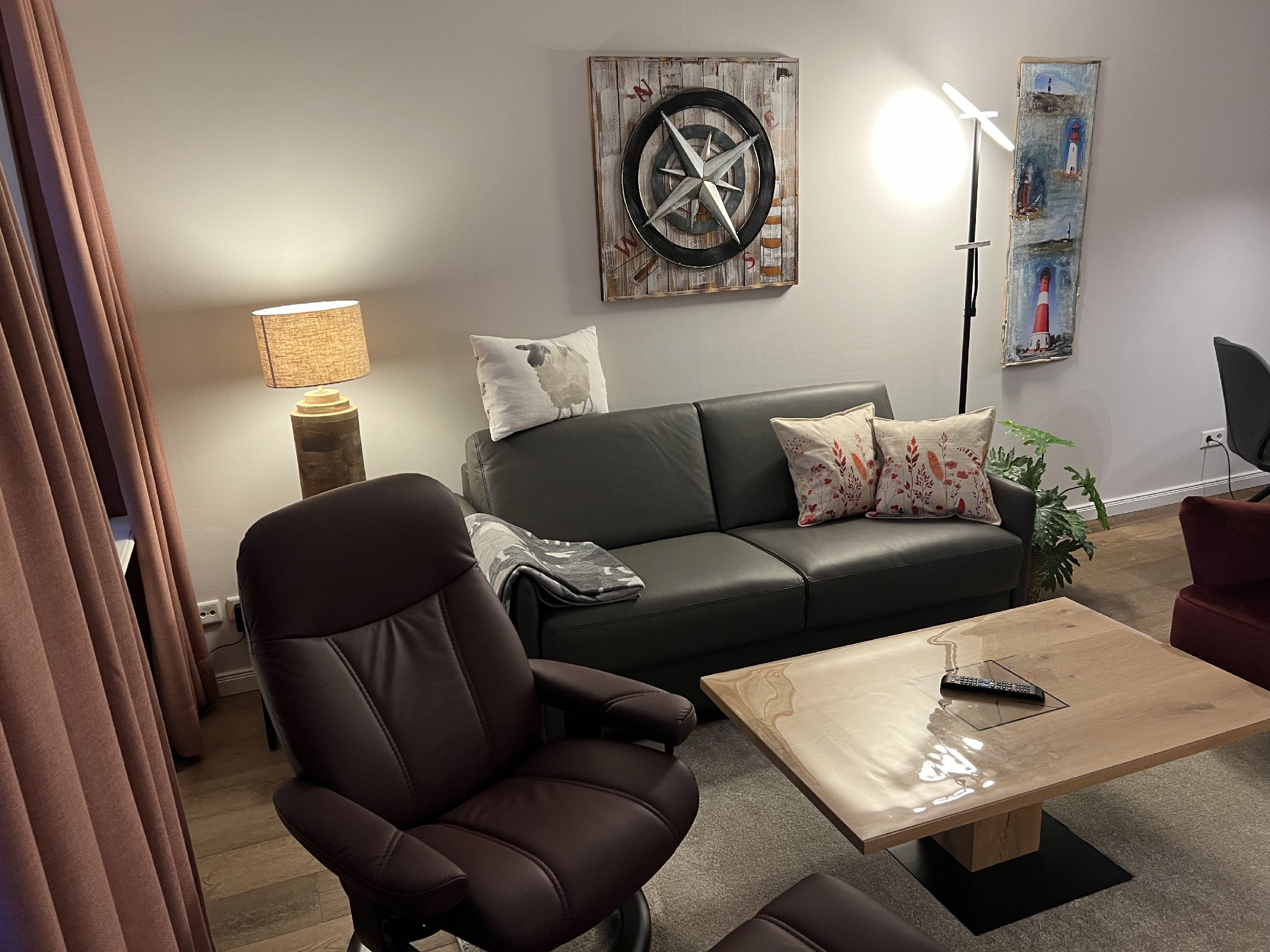 Der Wohnbereich wirkt einladend und ist mit viel Liebe zum Detail ausgestattet. Sie finden dort eine gemütliche 2-er Ledercouch, die auch hervorragend als Schlafcouch für eine 3. Person geeignet ist, und zur Entspannung einen komfortablen Stressless-Sessel. Zum bequemen Fernsehen erwartet Sie ein 65“ Smart-TV.