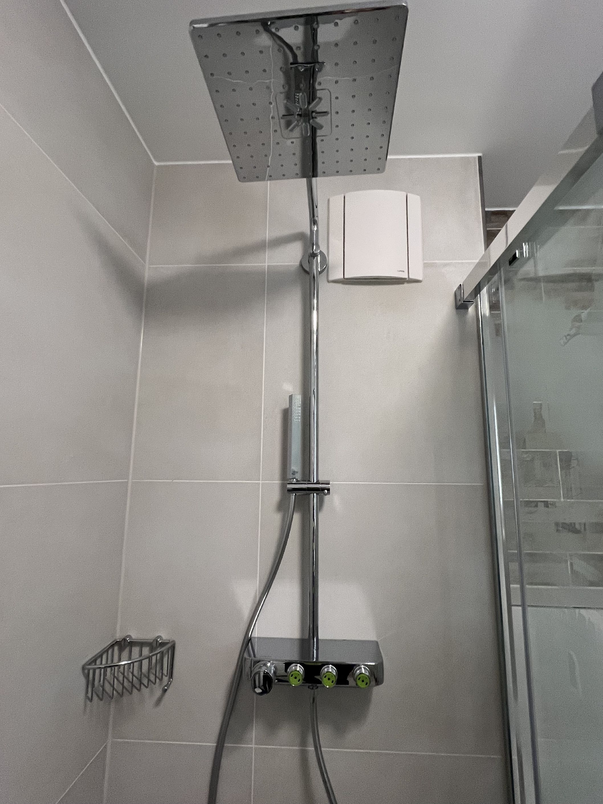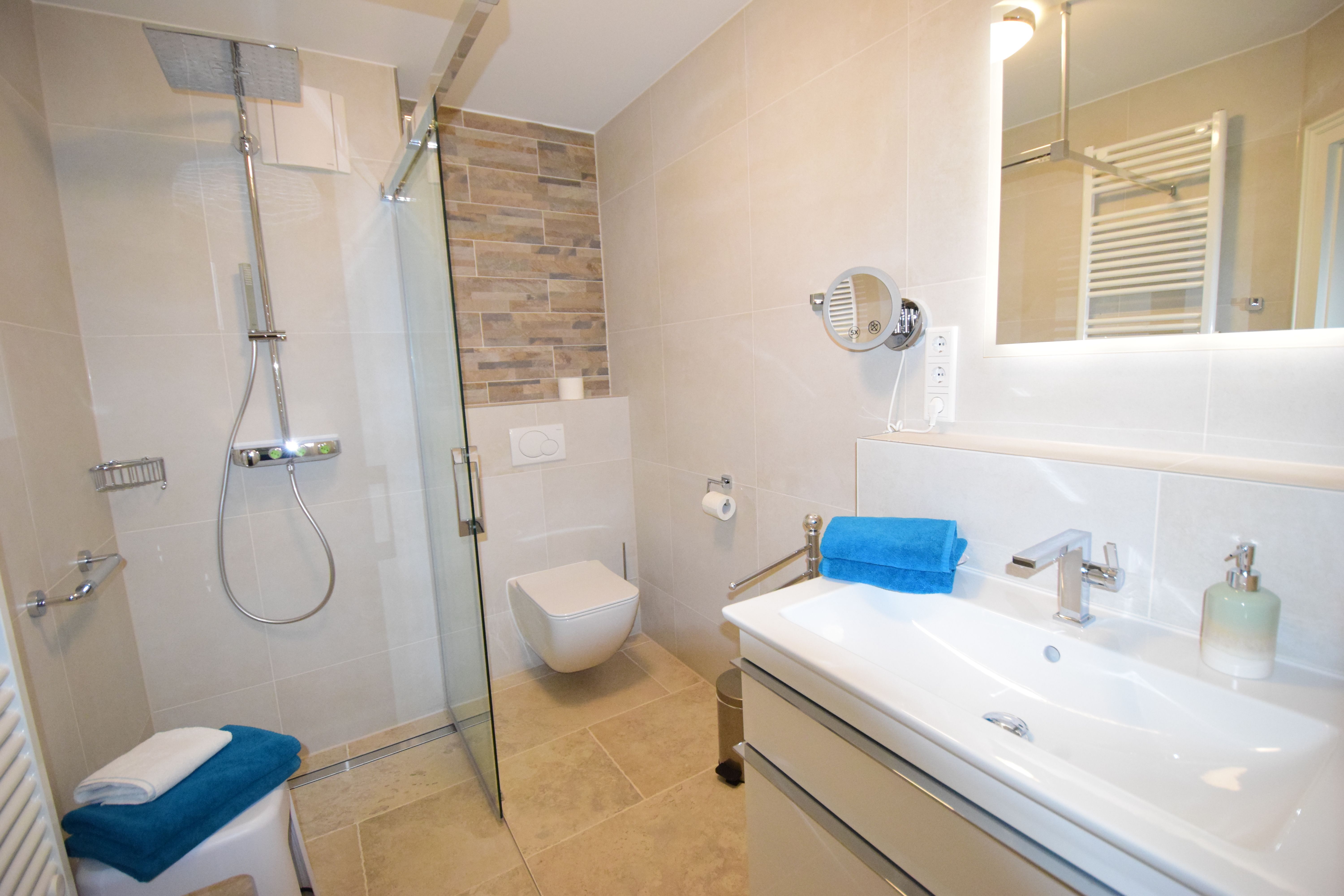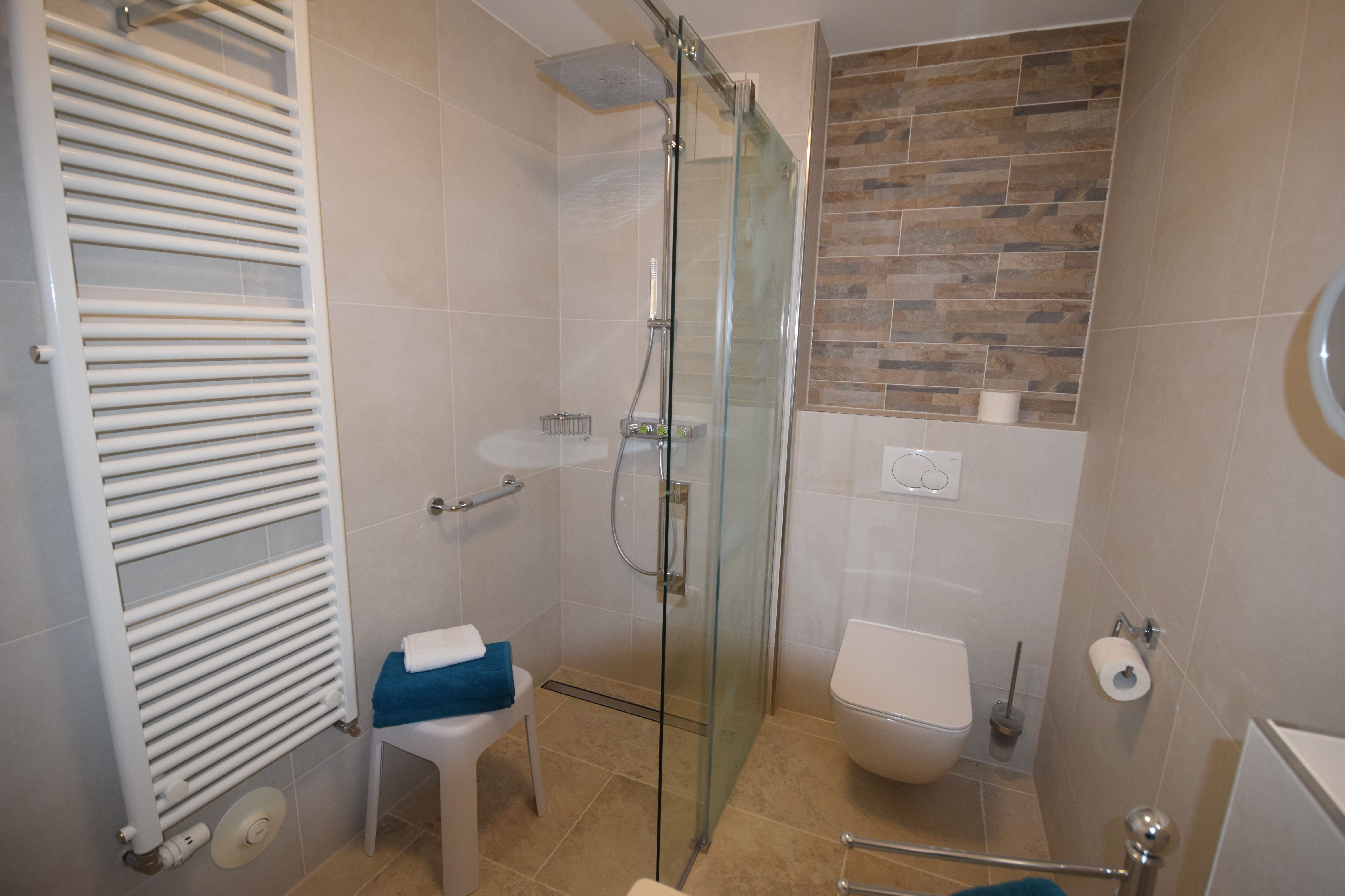 Badezimmer (Duschbad) mit Dusche, WC, Handtuchwärmer und Föhn.