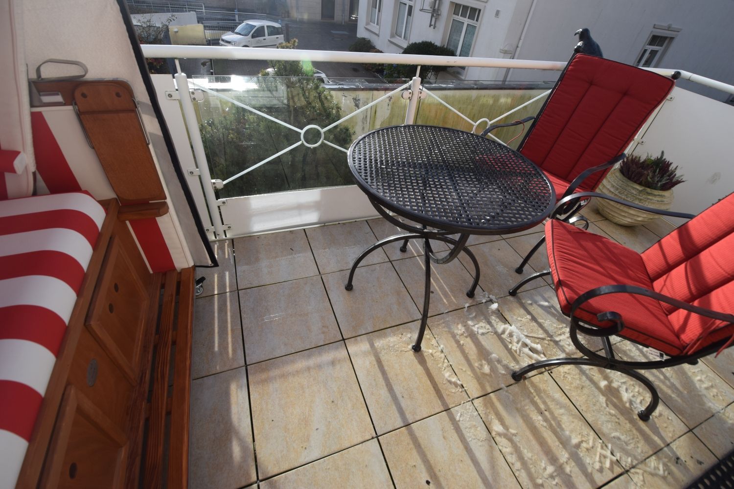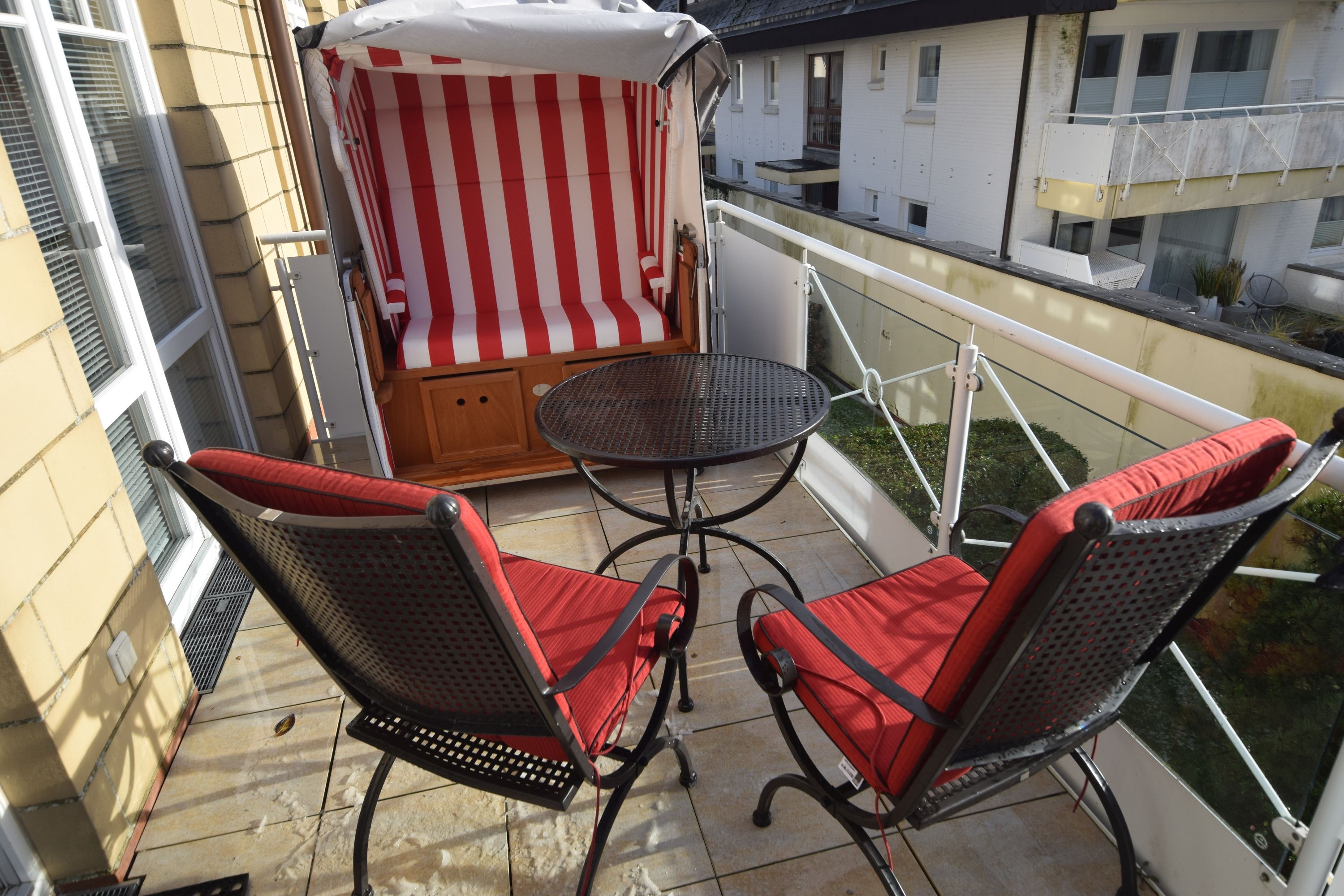 Der nach Süden ausgerichtete Balkon ist sowohl vom Schlaf- als auch vom Wohnzimmer erreichbar und lässt keine Wünsche offen. Sie finden dort einen Tisch mit 2 Stühlen sowie einen Strandkorb zur Alleinnutzung, um auch windgeschützt die Sonne genießen zu können.