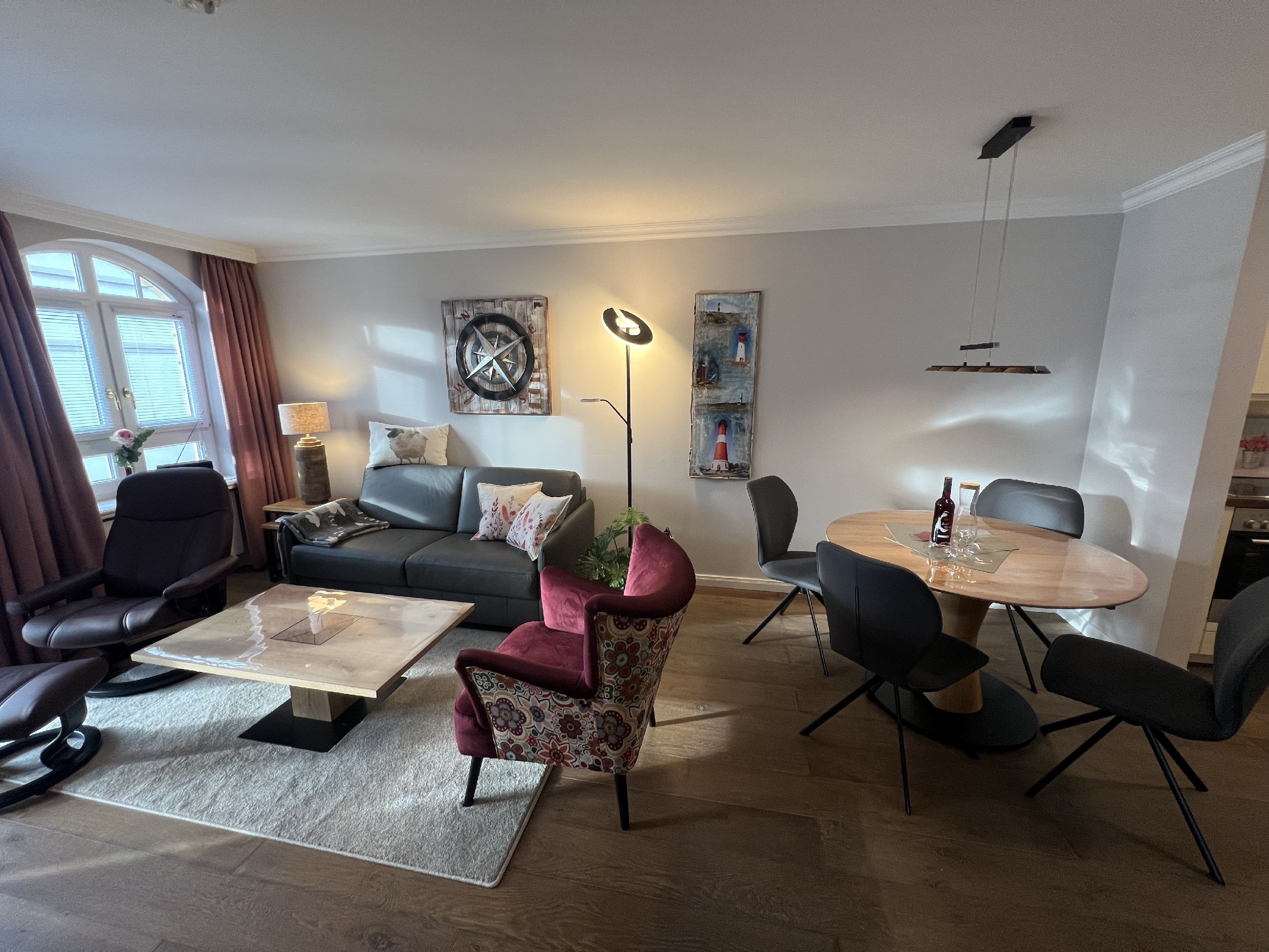 Mittendrin in der Innenstadt mit all ihren Annehmlichkeiten, aber dennoch schön ruhig. Und zum Strand sind es nur wenige Minuten. Die perfekte (Nichtraucher-) Ferienwohnung für den perfekten Urlaub. Wohnzimmer mit ausziehbarem (Schlaf-) Sofa (140x200cm), Stressless-Sessel, Esstisch mit 4 Stühlen und Smart-TV.