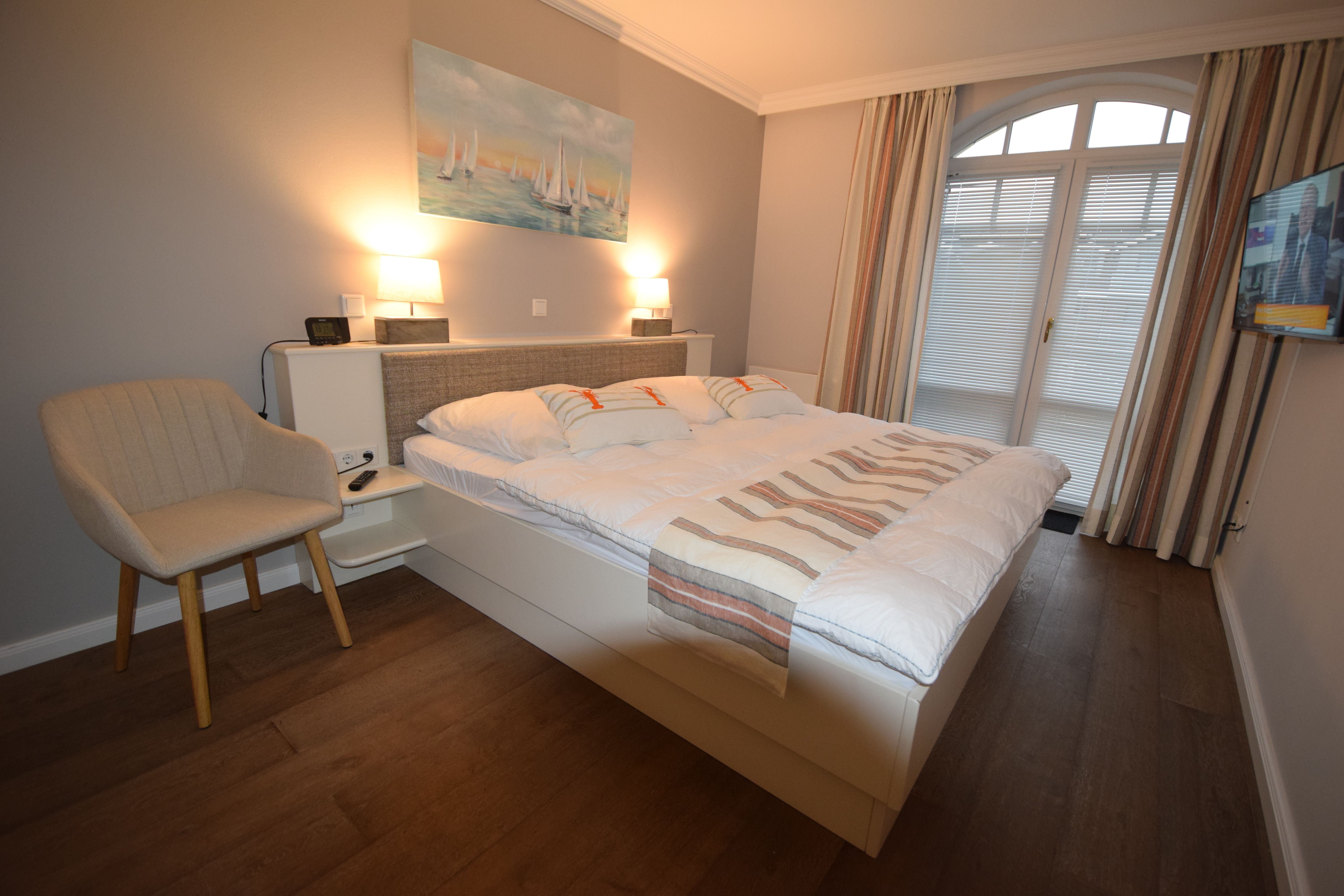 Das Schlafzimmer ist mit einem Doppelbett im Standardmaß von 1,80 m x 2,00 m sowie einer Schrankwand mit Safe und viel Stauraum ausgestattet. So ist es Ihnen auch möglich, einfach länger in der Unterkunft zu verweilen. Zum Schlafen erwarten Sie die hochkomfortablen TEMPUR-Matratzen.