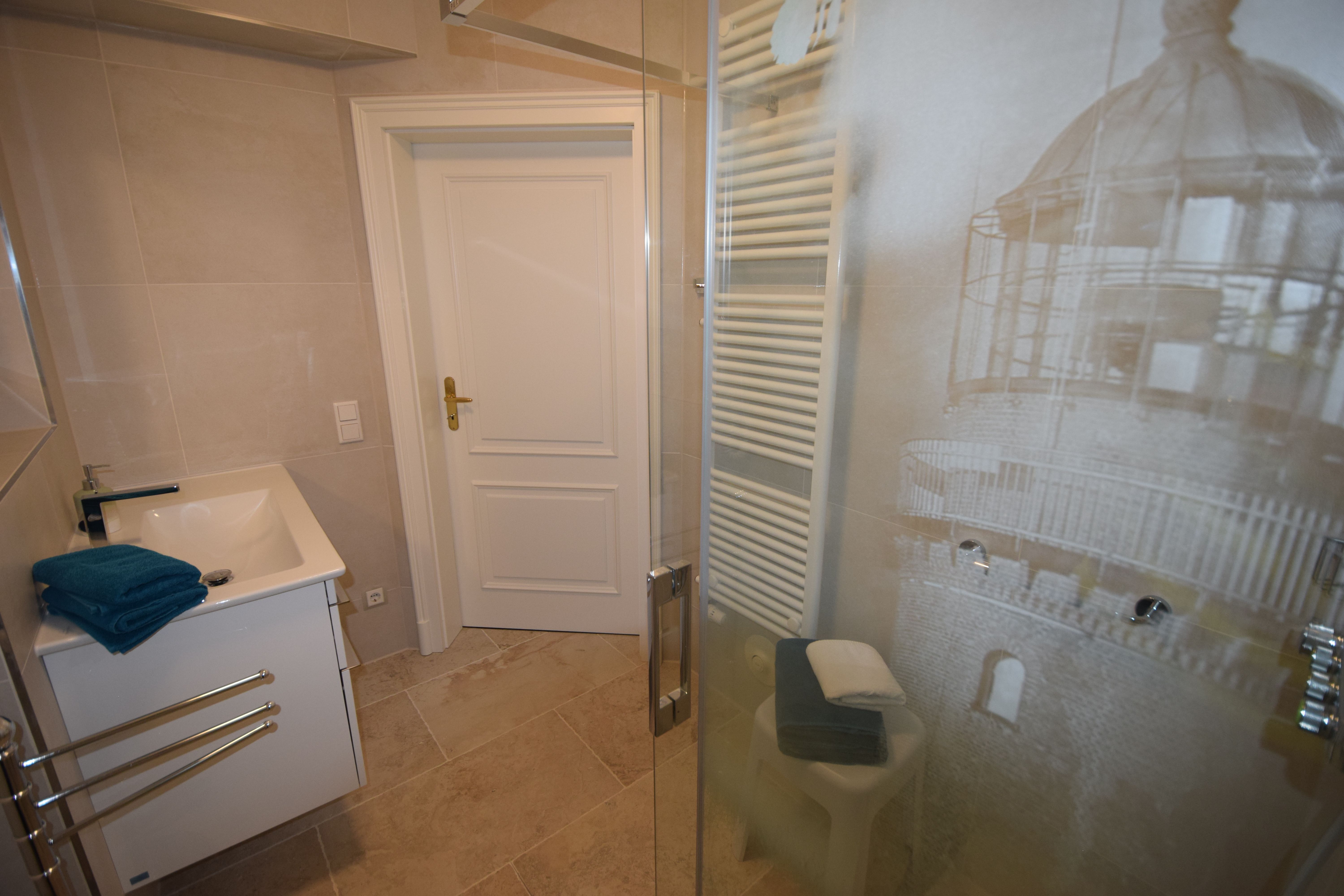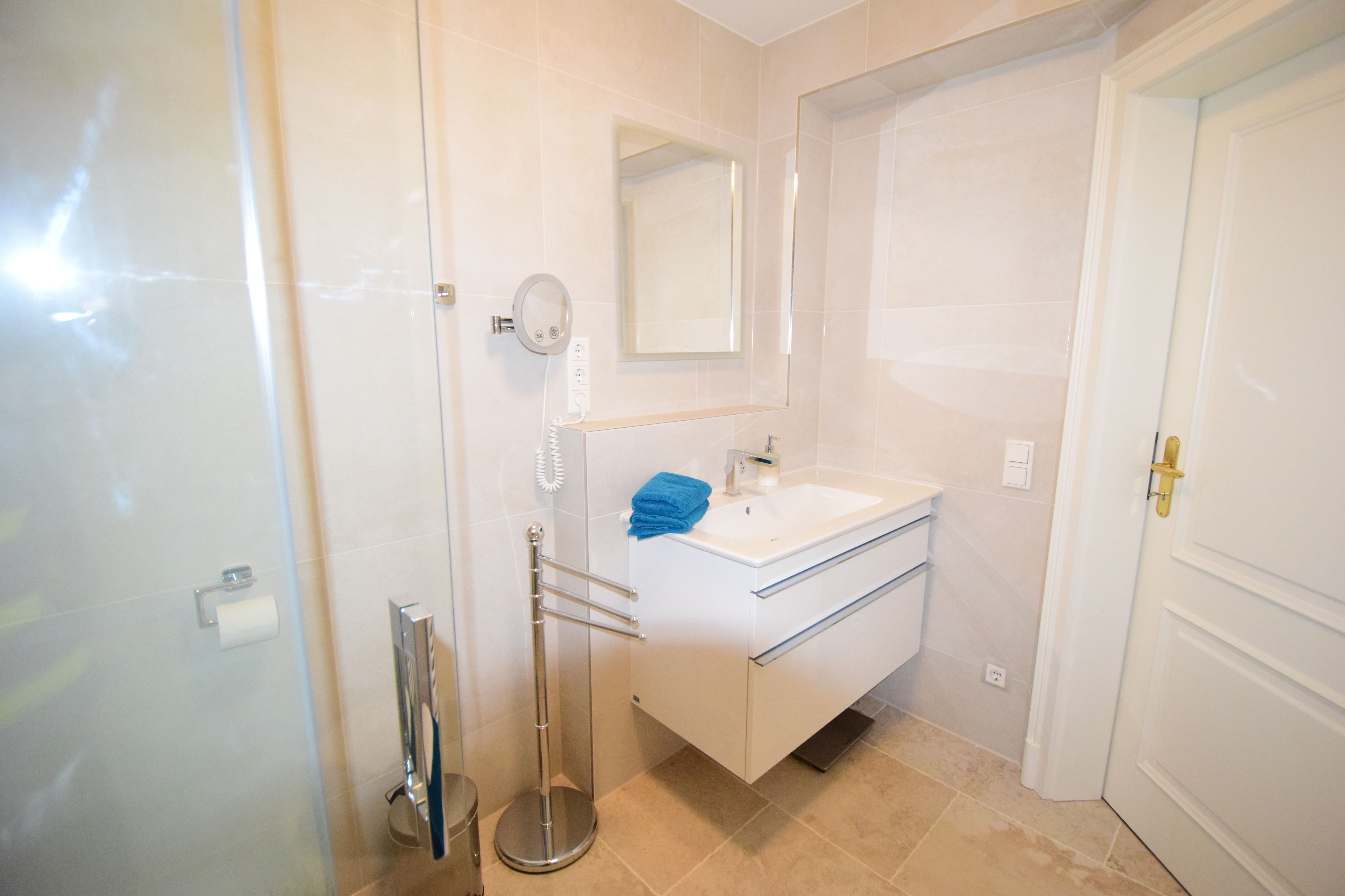 Damit Sie mit Ihrer Wäsche nicht in den Keller müssen, ist hier noch ein Waschtrockner für Sie untergebracht. Rechts daneben befindet sich das frisch renovierte Badezimmer. Das freundlich hell geflieste Bad hat einen ebenerdigen Duschbereich, ein WC sowie einen komfortablen Waschtisch. Ein Fön ist ebenso vorhanden wie der beleuchtete Kosmetikspiegel. Das helle Wohn-/Esszimmer hat eine offene Küche mit einem komfortablen Essplatz.