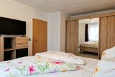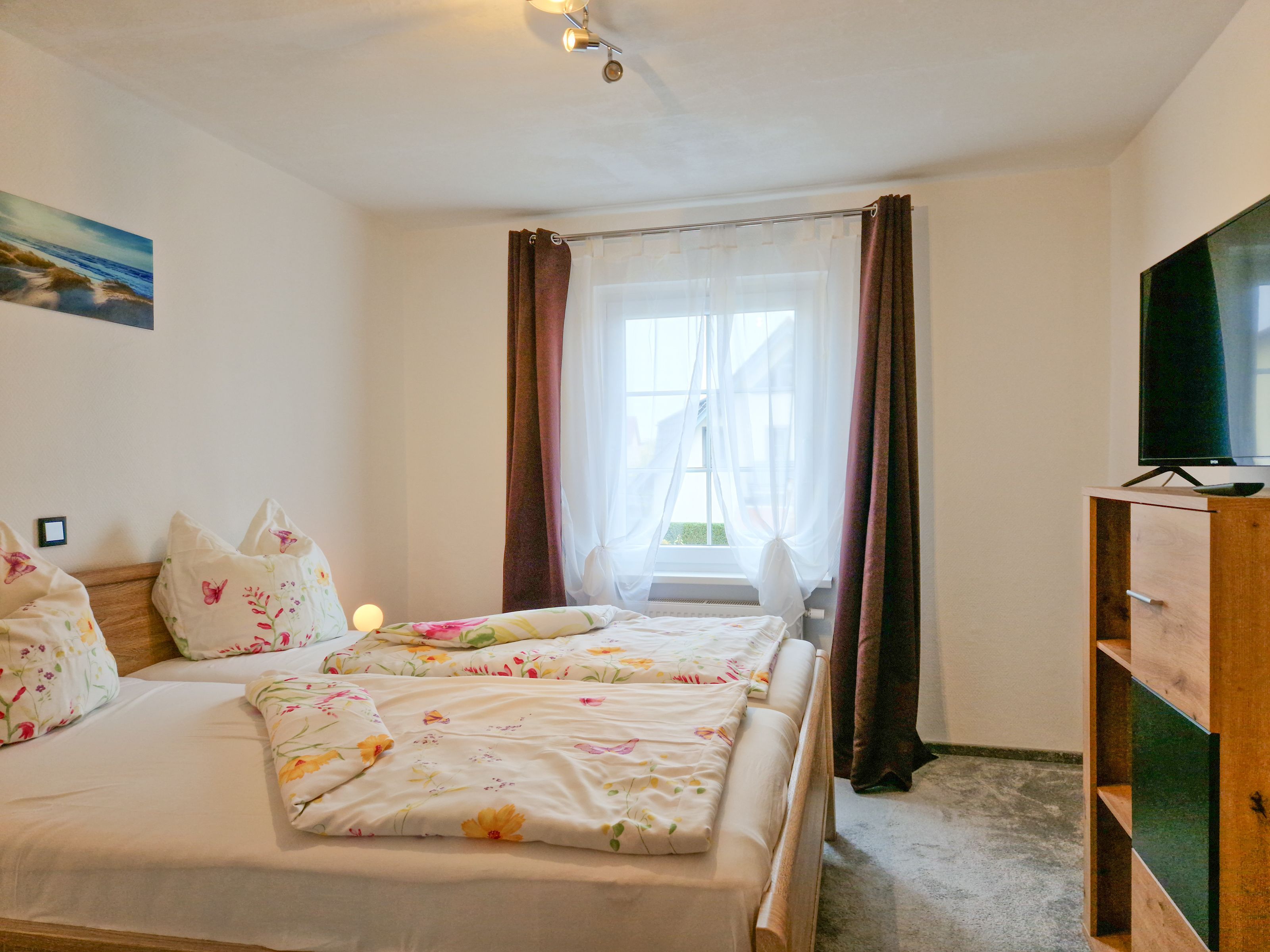 Die Wohnung bietet zwei liebevoll eingerichtete Schlafzimmer: eines mit einem bequemen Doppelbett und das andere mit zwei gemütlichen Einzelbetten - perfekt für Freunde oder Familienmitglieder, die gemeinsam entspannen möchten.