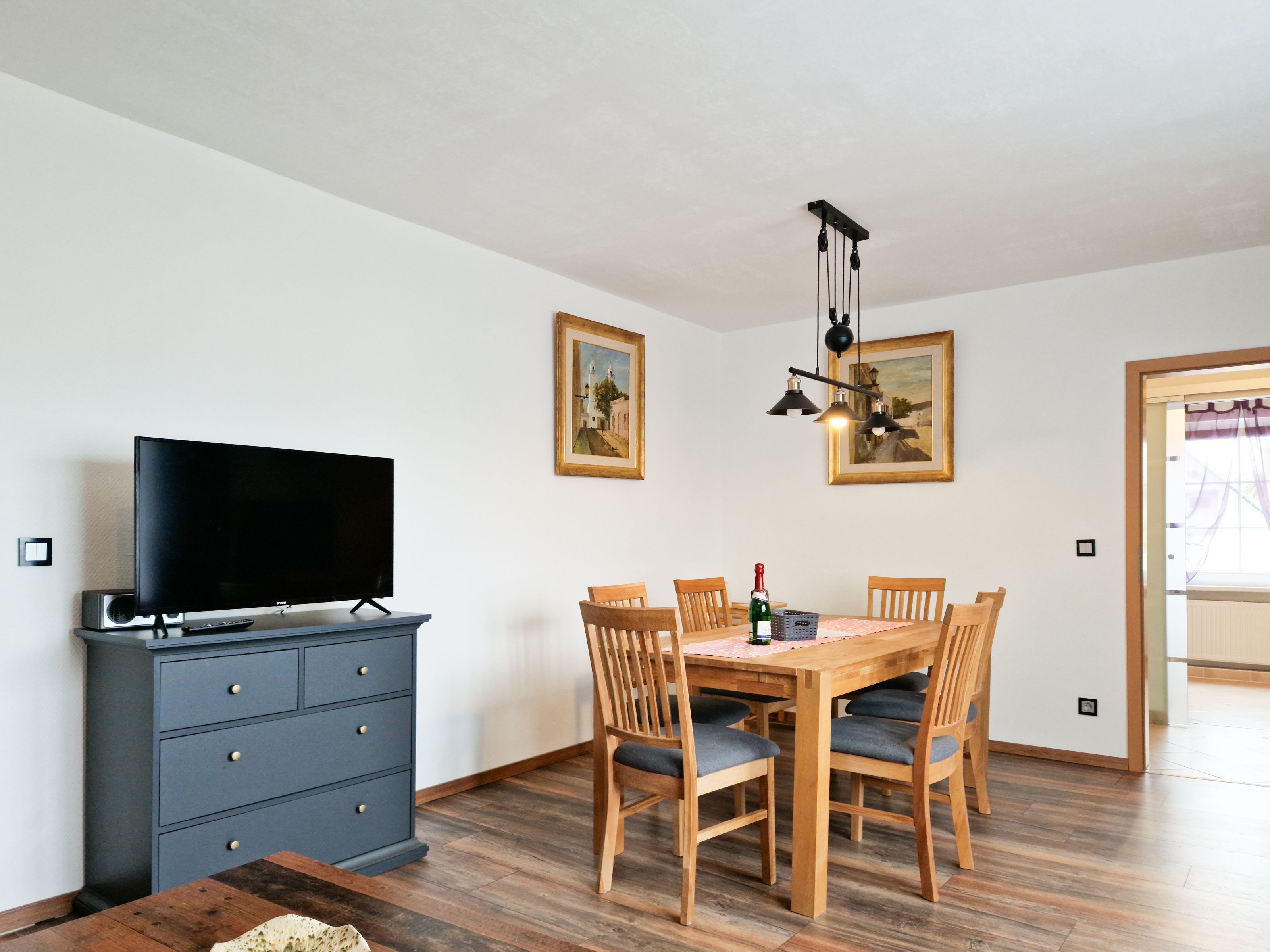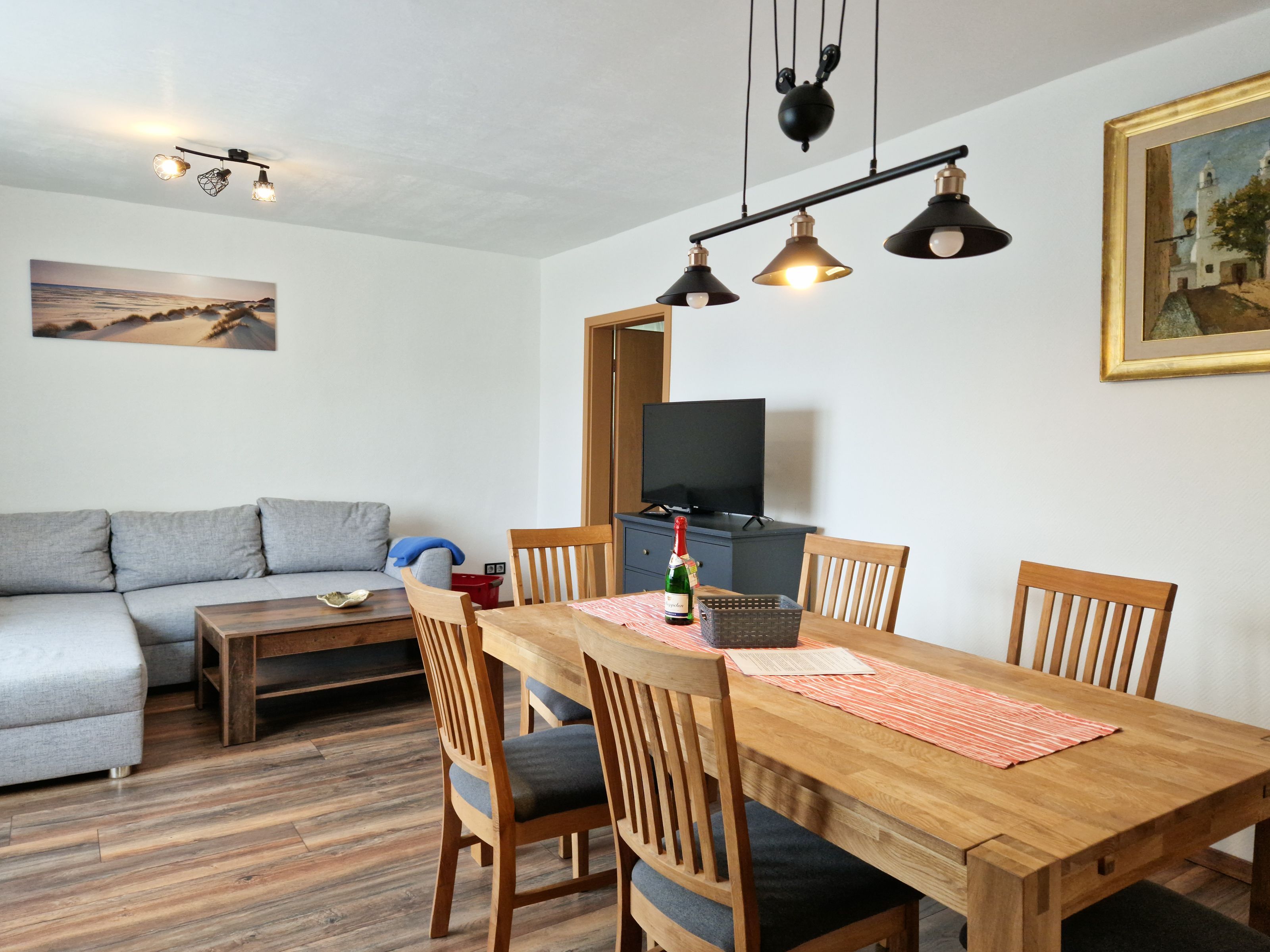 Der Esstisch im stilvoll gestalteten Wohnzimmer lädt ein, bei einem gemütlichen Abendessen zusammenzukommen und unvergessliche Momente zu teilen.