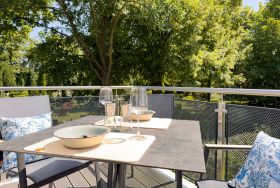 Genießen Sie die frische Ostseeluft auf dem Balkon mit Blick ins Grüne. Hier können Sie den Tag mit einem Frühstück im Freien beginnen oder abends bei einem Glas Wein ausklingen lassen.