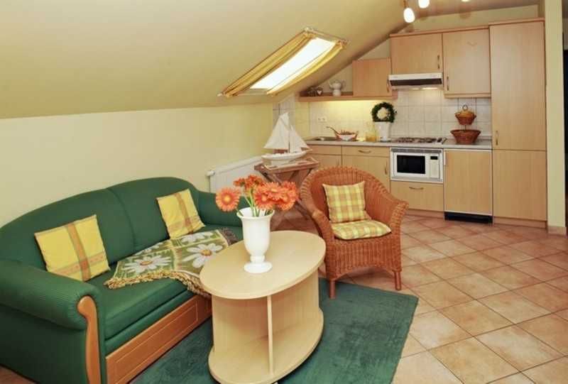 Im Wohnzimmer finden Sie, neben einer gemütlichen Veranda mit Sitzecke selbstverständlich eine Essecke für bis zu 4 Personen, eine bequeme Ausziehcouch und Sessel, Farb-TV, DVD- und CD-Player, Stereo-Radio, Durchwahltelefon, Sprechanlage und WLan, sowie eine vollständig eingerichtete Küche.