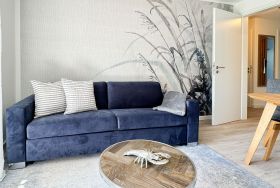 • Wohnbereich: Heller Wohnraum mit bequemer Sitzgruppe und Smart-TV für entspannte Stunden.
