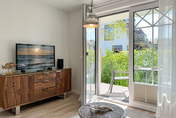 Die Ferienwohnung Küstenkajüte 2 empfängt Sie mit einer harmonischen Kombination aus modernem Komfort und maritimem Ambiente. Der lichtdurchflutete Wohnbereich lädt zu entspannten Stunden ein, während die offene Küchenzeile mit allem ausgestattet ist, was Sie für Ihre Lieblingsgerichte benötigen. Genießen Sie Ihre Mahlzeiten auf der einladenden Terrasse mit Gartenblick und lassen Sie den Tag in gemütlicher Atmosphäre ausklingen. Das moderne Badezimmer und das komfortable Schlafzimmer bieten zusätzlichen Komfort für erholsame Nächte.