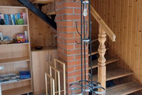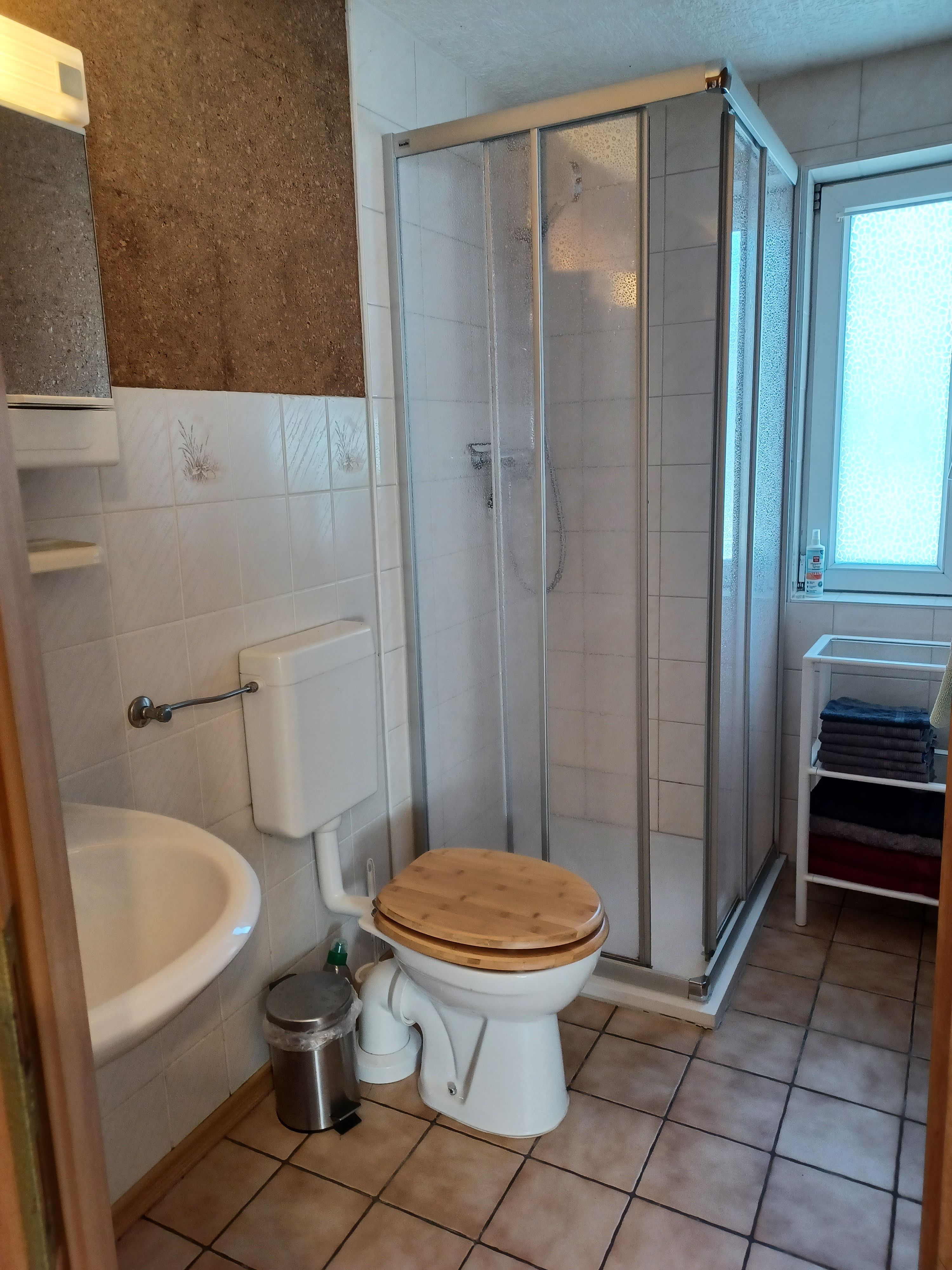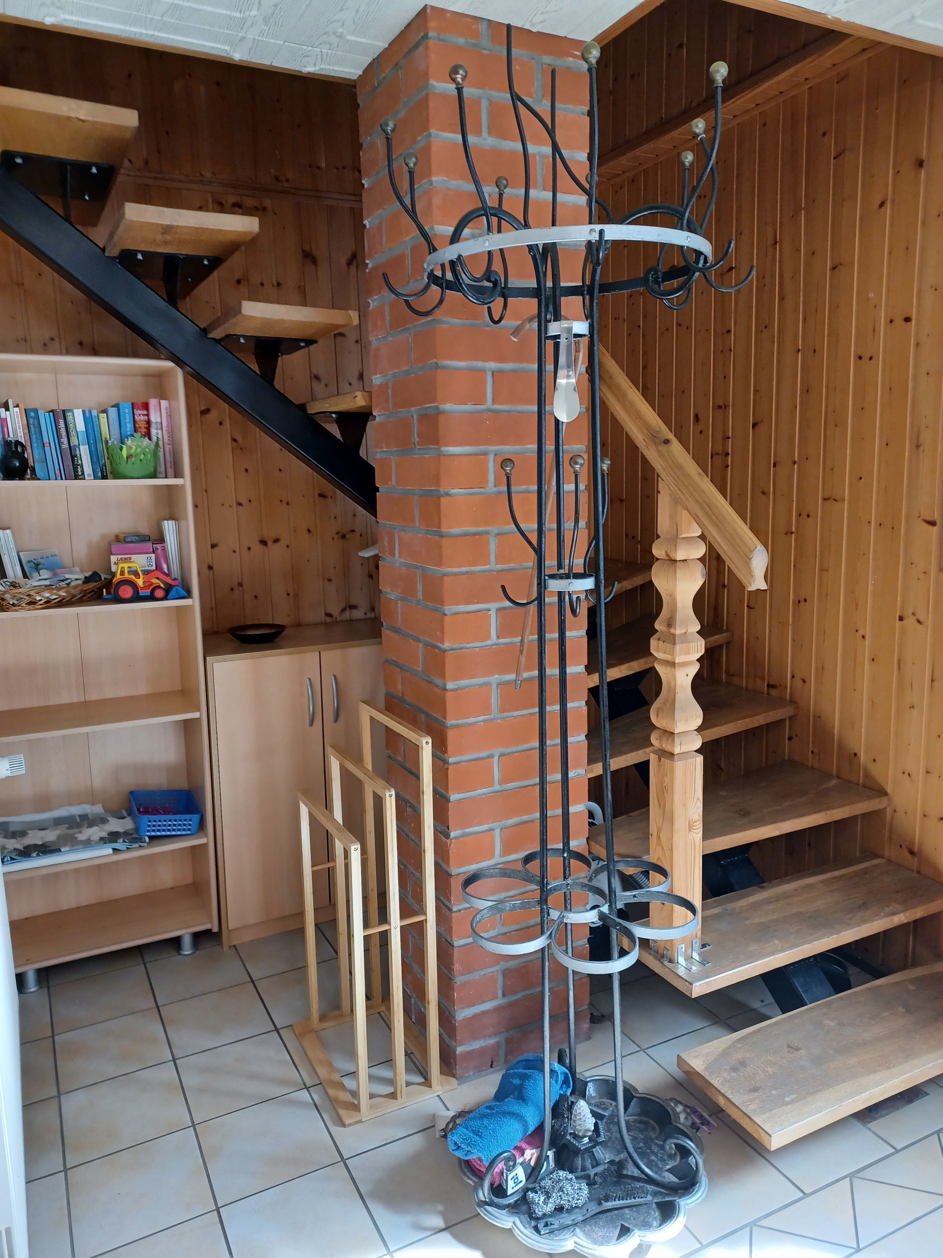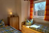 Unsere große Ferienwohnung im Landhausstil befindet sich in einem Nebengebäude auf unserem Grundstück und bietet Platz für bis zu 4 Personen. Die Wohnung erstreckt sich über zwei Etagen: Unten erwarten Sie ein gemütlicher Wohnraum, eine Kochecke sowie das Bad. Im Obergeschoss befinden sich zwei separate Schlafräume; im zweiten Schlafzimmer stehen zwei Einzelbetten (80 × 180 cm) zur Verfügung.