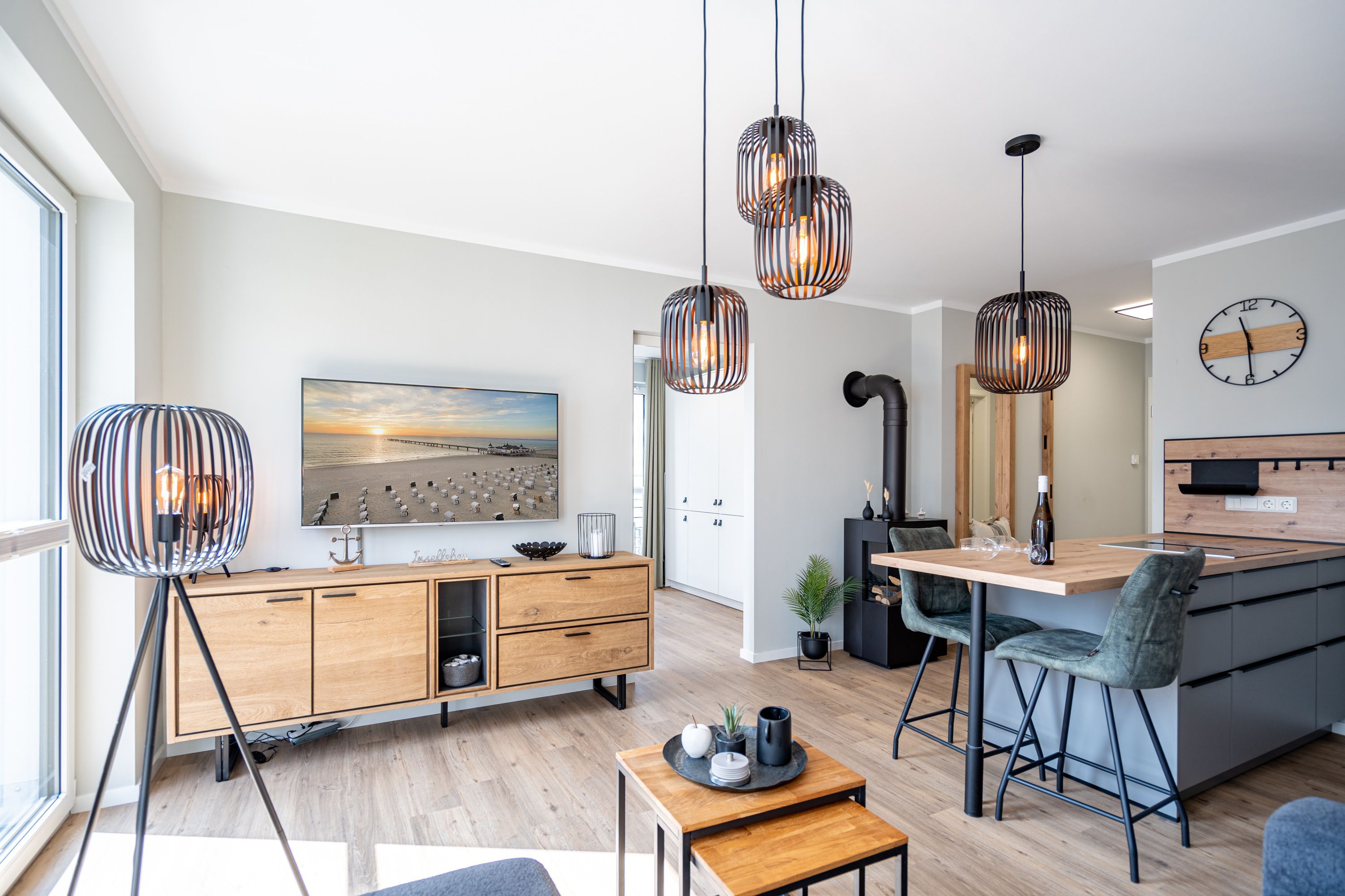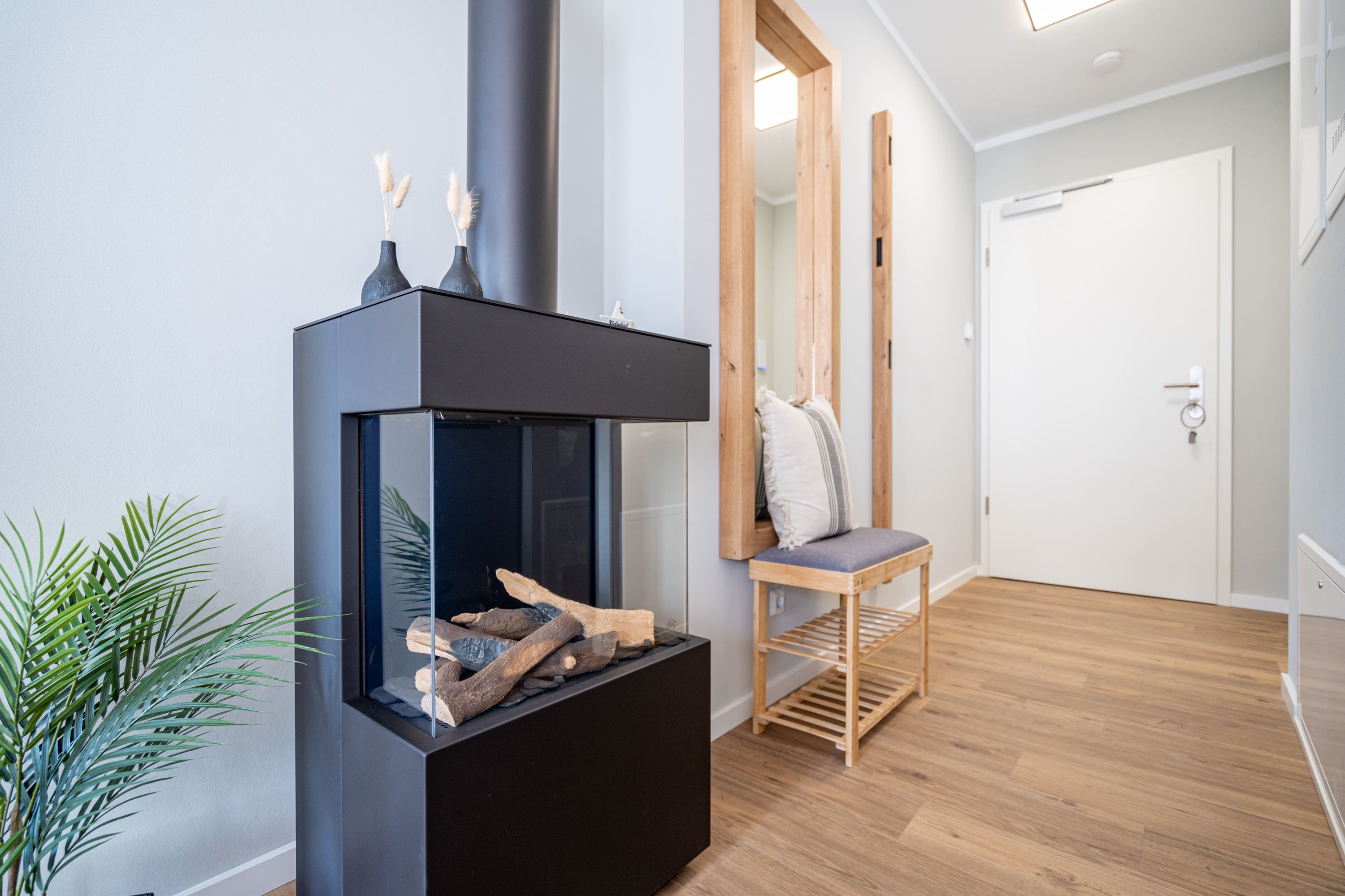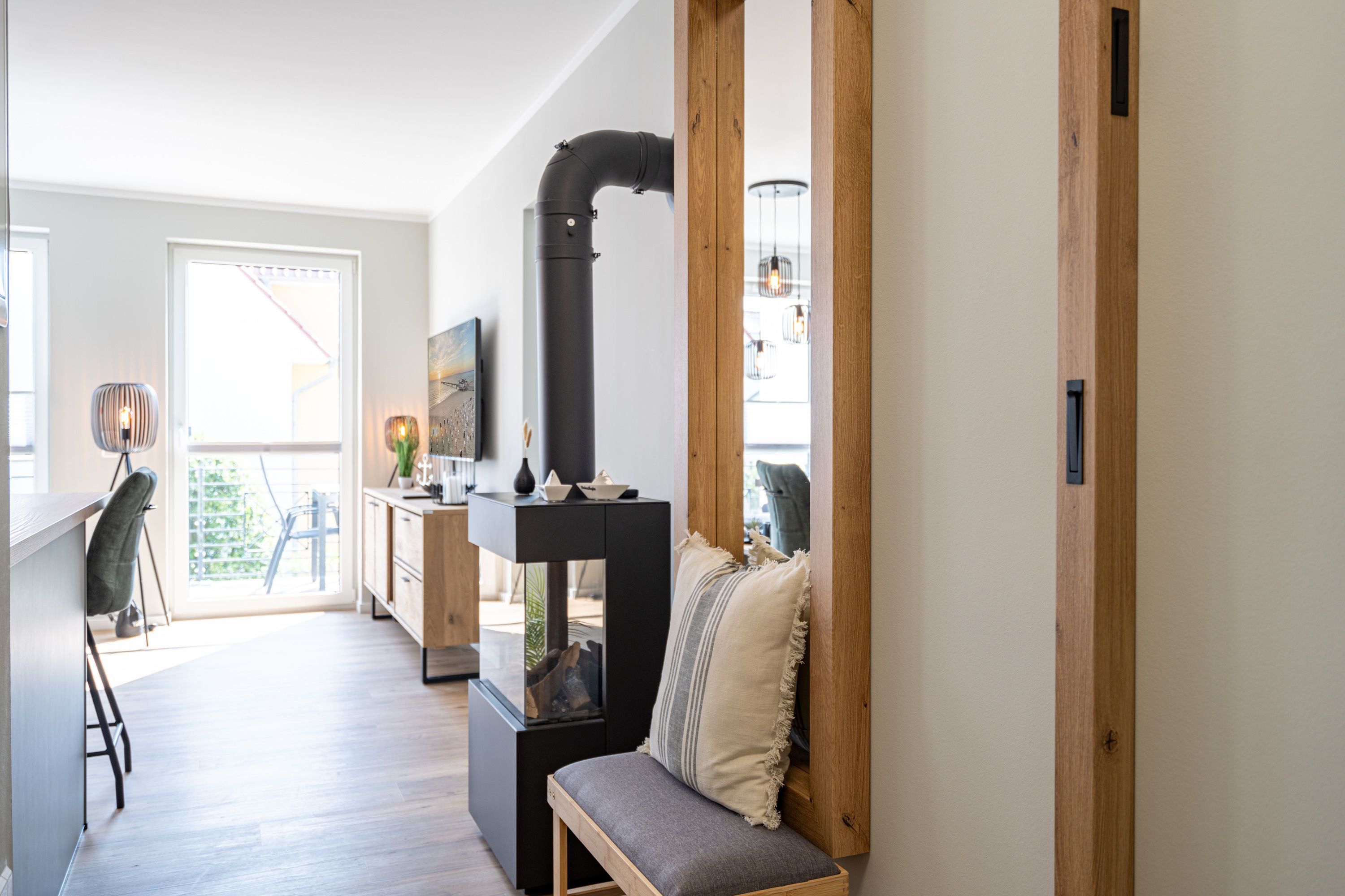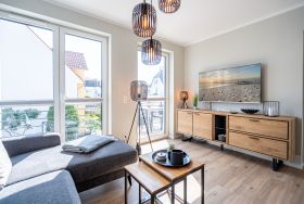 Herzlich willkommen im gemütlichen 2-Raum-Appartement N° 08 in der 1. Etage des Quartier 6. Auf 44 Quadratmetern bietet dieses liebevoll eingerichtete Domizil Platz für 2 Personen & 1 Kleinkind (bis 2 Jahre im Kinderreisebett). Der offene Wohnbereich überzeugt mit einer voll ausgestatteten Küchenzeile, einem Essplatz für 2 Personen und einer gemütlichen Sitzgruppe. Für entspannte Abende stehen Ihnen ein 55 Zoll Flat-TV und ein Gas-Kamin mit Fernbedienung zur Verfügung. Vom Wohnbereich gelangen Sie auf den Süd-Ost-Balkon, der mit Gartenmöbeln ausgestattet ist und zum Verweilen einlädt. Das Schlafzimmer verfügt über ein komfortables Boxspringdoppelbett (1,80 m x 2,00 m), einen Kleiderschrank und einen weiteren Flat-TV, sodass es Ihnen an nichts fehlt. Das moderne Duschbad ist mit einem Waschtisch, einem WC und einer Finnischen Sauna ausgestattet, die für erholsame Stunden sorgt. Eine Waschmaschine steht Ihnen ebenfalls zur Verfügung. Ein PKW-Stellplatz in der Tiefgarage und ein wohnungseigener Abstellraum für Fahrräder runden das Angebot ab. Selbstverständlich steht Ihnen kostenfreies WLAN zur Verfügung, damit Sie auch im Urlaub stets verbunden bleiben können. Wir freuen uns darauf, Sie in unserem einladenden Appartement begrüßen zu dürfen!