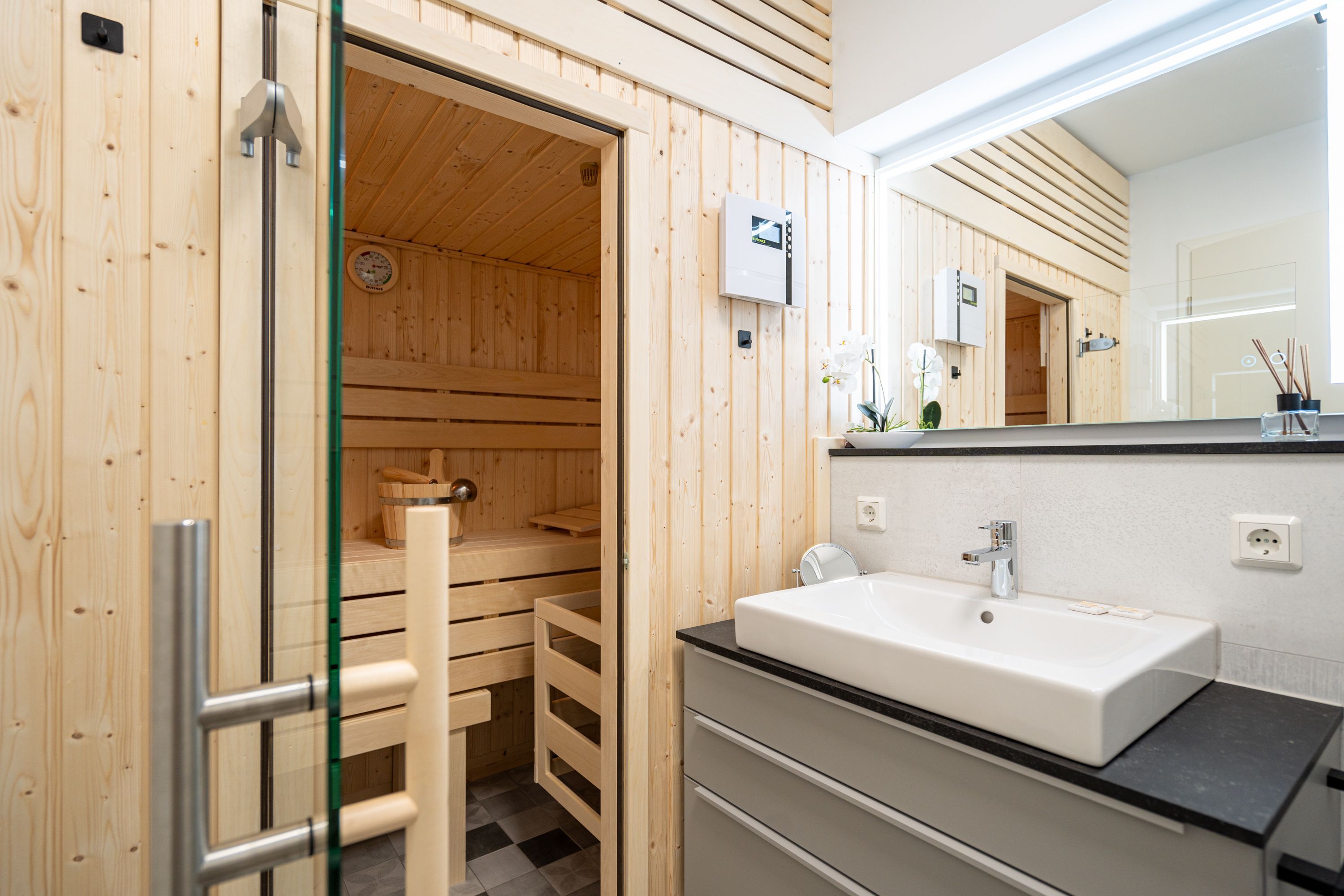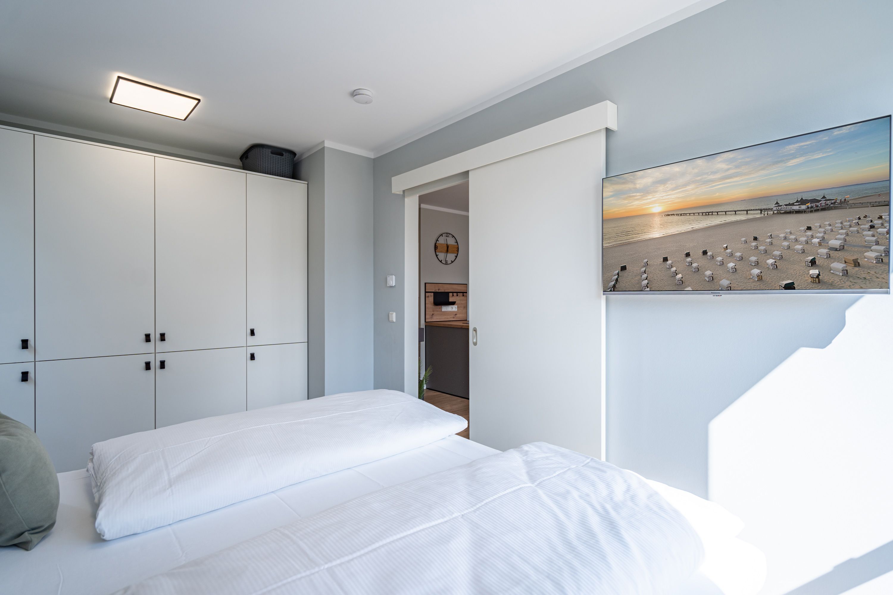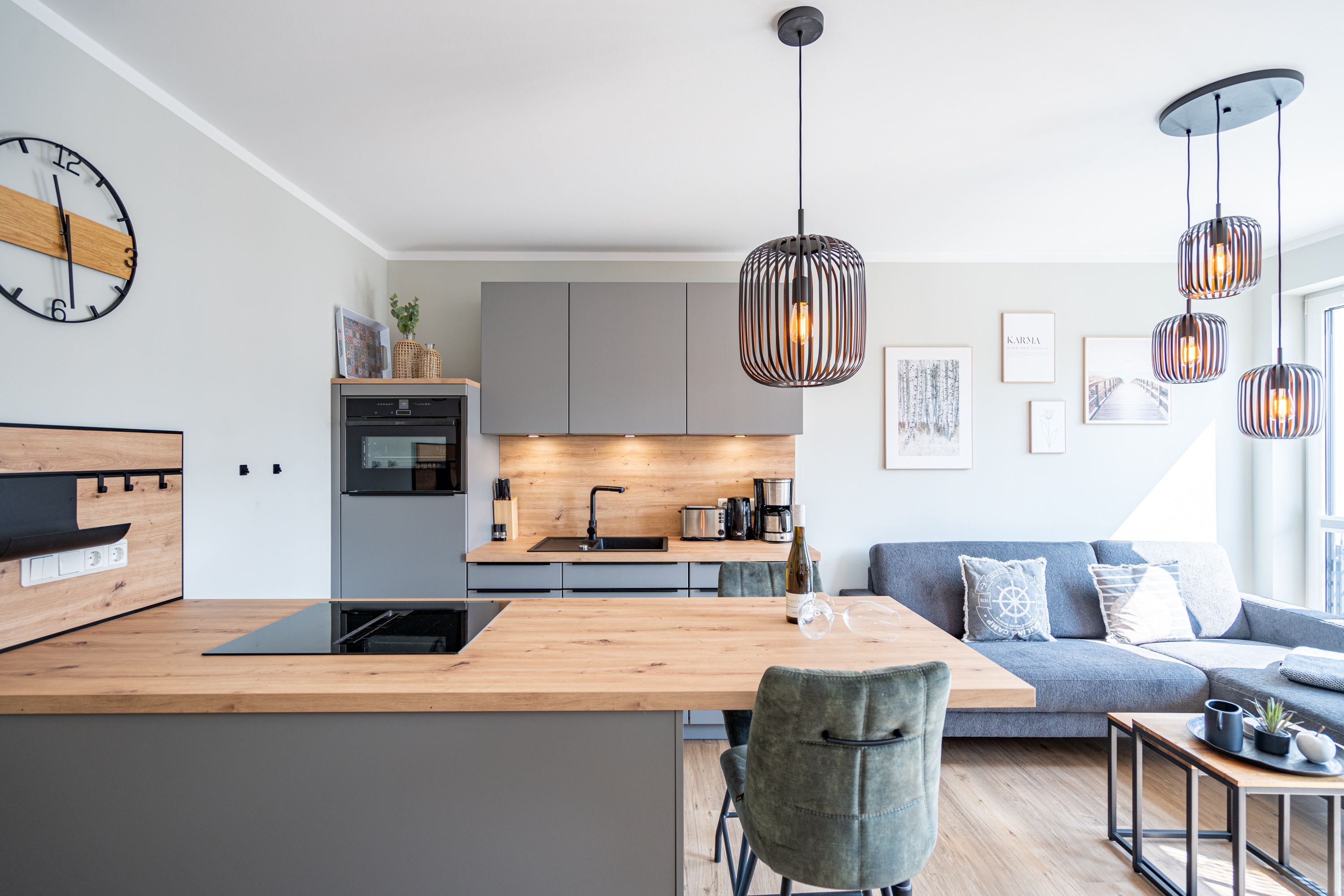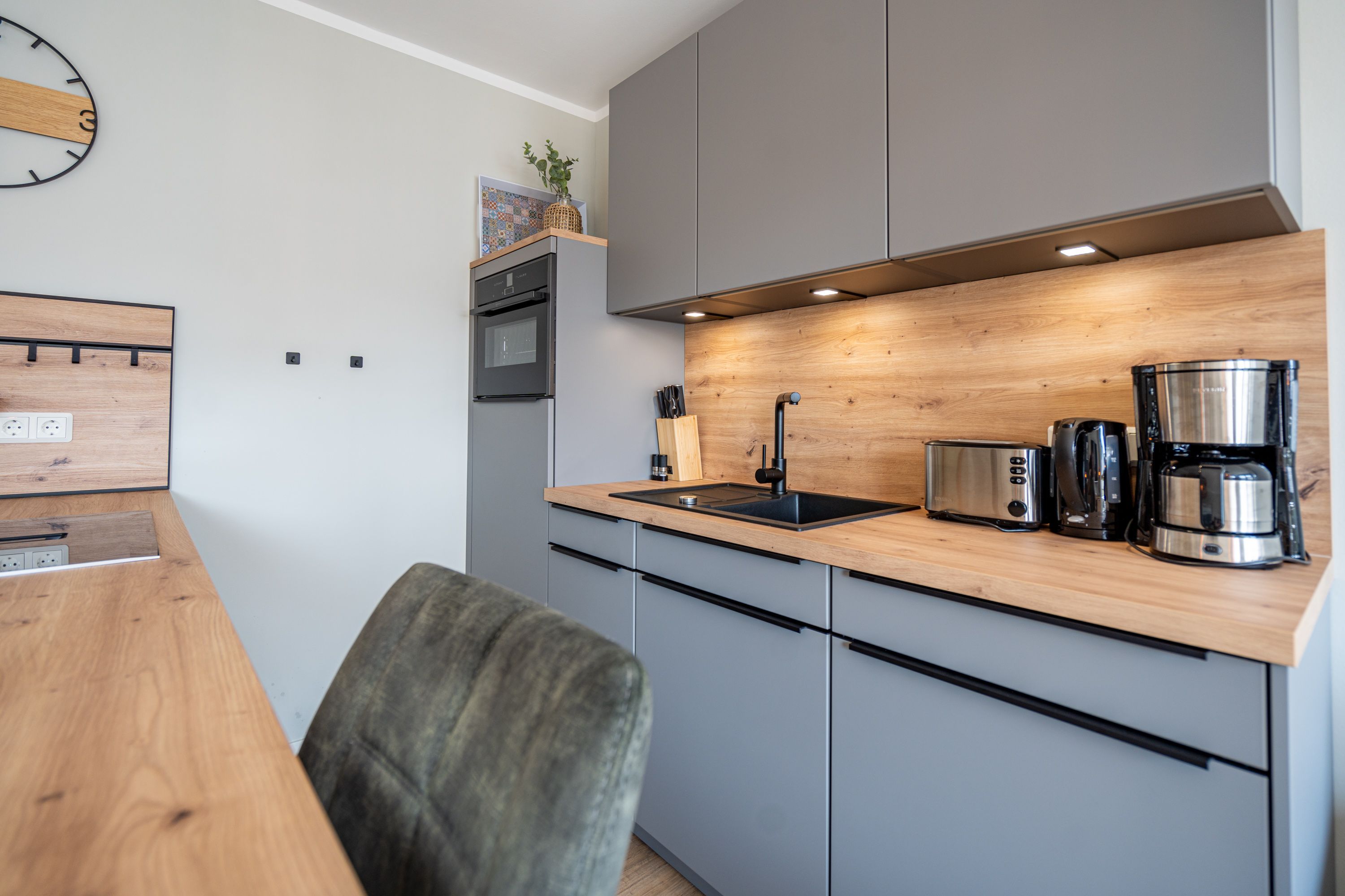 Herzlich willkommen im gemütlichen 2-Raum-Appartement N° 08 in der 1. Etage des Quartier 6. Auf 44 Quadratmetern bietet dieses liebevoll eingerichtete Domizil Platz für 2 Personen & 1 Kleinkind (bis 2 Jahre im Kinderreisebett). Der offene Wohnbereich überzeugt mit einer voll ausgestatteten Küchenzeile, einem Essplatz für 2 Personen und einer gemütlichen Sitzgruppe. Für entspannte Abende stehen Ihnen ein 55 Zoll Flat-TV und ein Gas-Kamin mit Fernbedienung zur Verfügung. Vom Wohnbereich gelangen Sie auf den Süd-Ost-Balkon, der mit Gartenmöbeln ausgestattet ist und zum Verweilen einlädt. Das Schlafzimmer verfügt über ein komfortables Boxspringdoppelbett (1,80 m x 2,00 m), einen Kleiderschrank und einen weiteren Flat-TV, sodass es Ihnen an nichts fehlt. Das moderne Duschbad ist mit einem Waschtisch, einem WC und einer Finnischen Sauna ausgestattet, die für erholsame Stunden sorgt. Eine Waschmaschine steht Ihnen ebenfalls zur Verfügung. Ein PKW-Stellplatz in der Tiefgarage und ein wohnungseigener Abstellraum für Fahrräder runden das Angebot ab. Selbstverständlich steht Ihnen kostenfreies WLAN zur Verfügung, damit Sie auch im Urlaub stets verbunden bleiben können. Wir freuen uns darauf, Sie in unserem einladenden Appartement begrüßen zu dürfen!