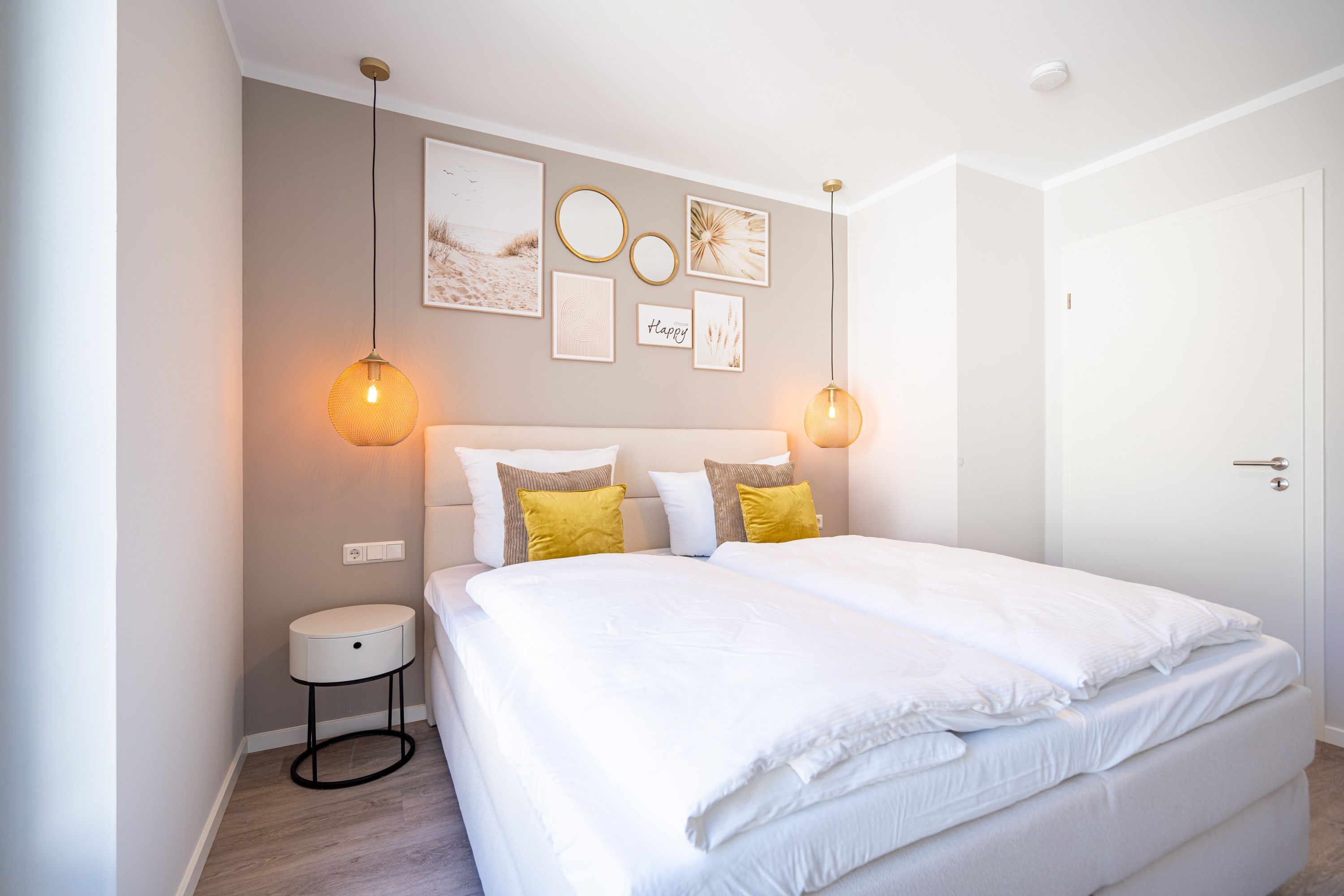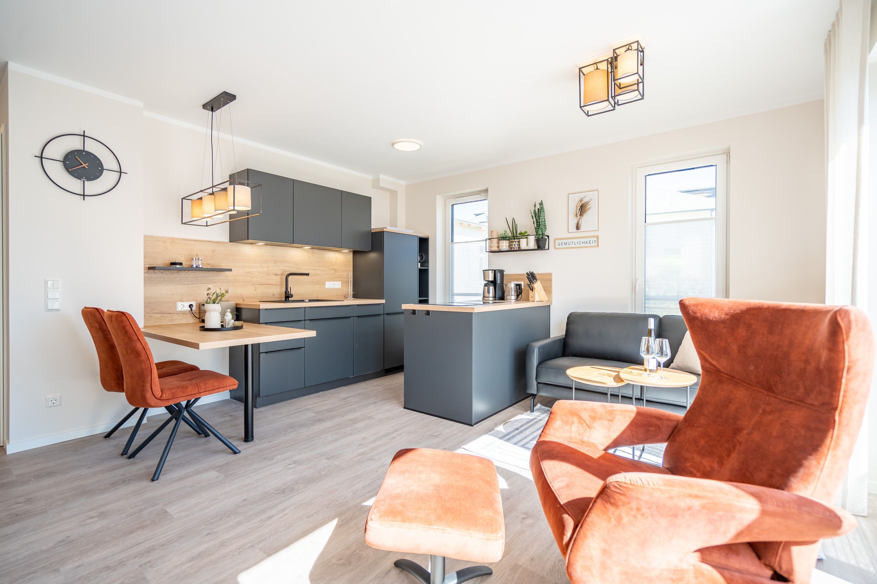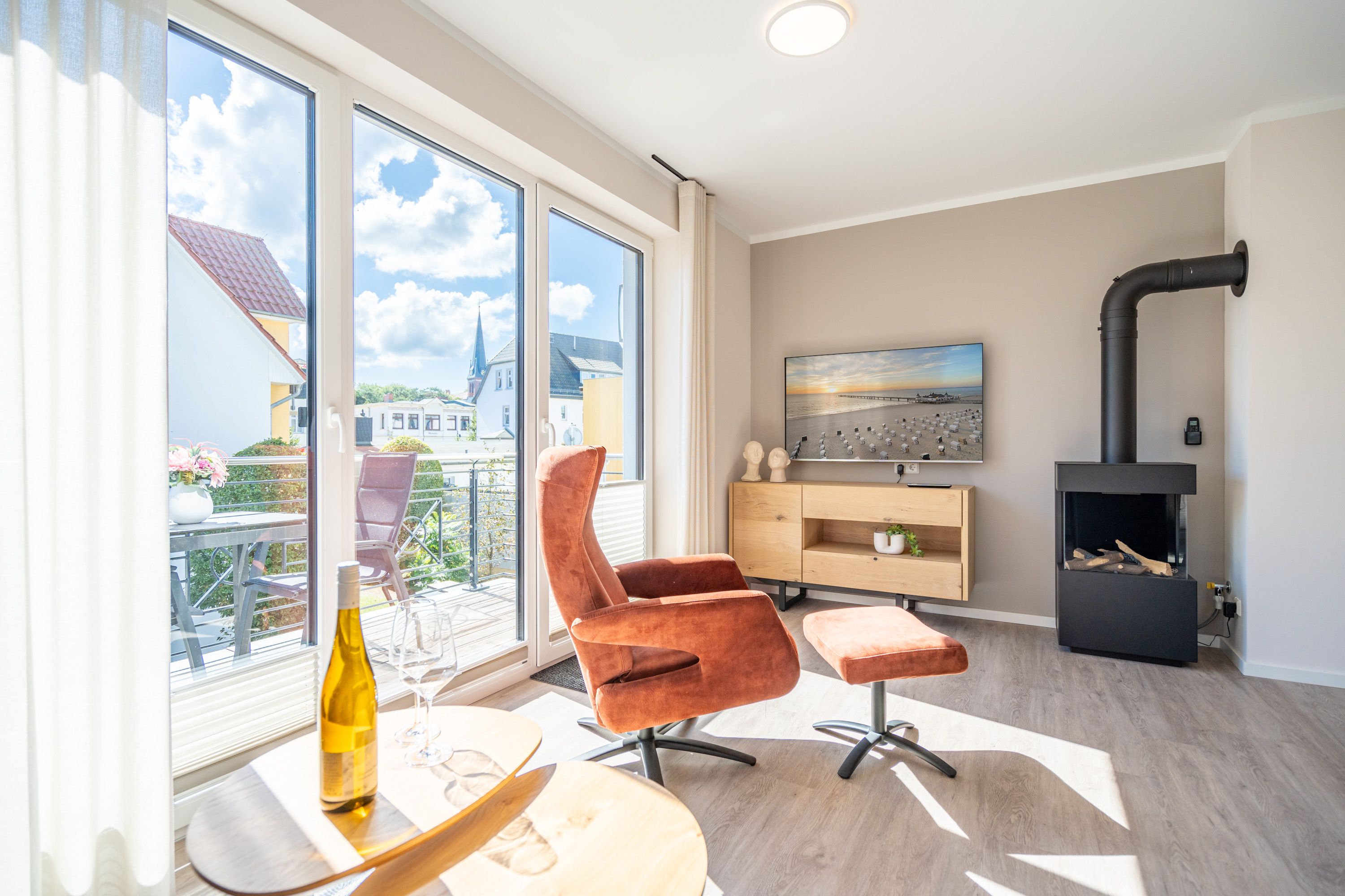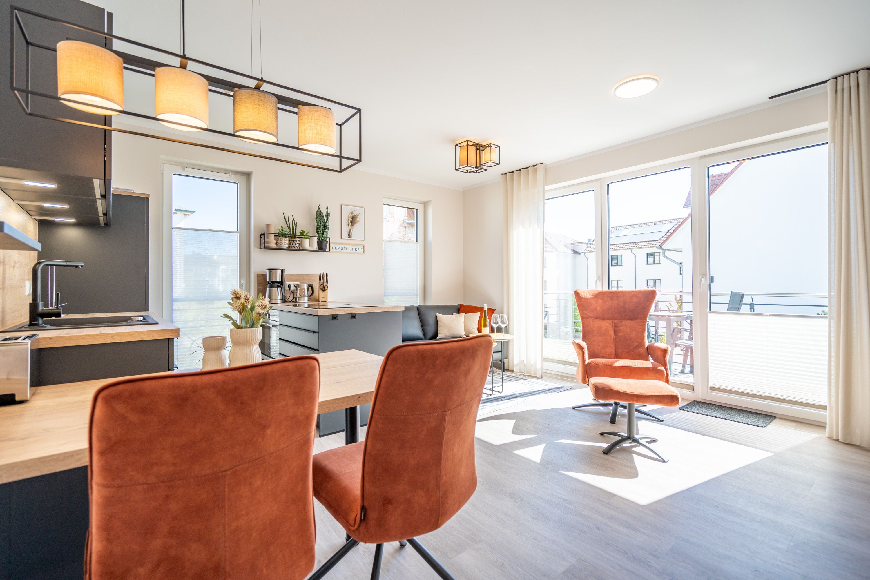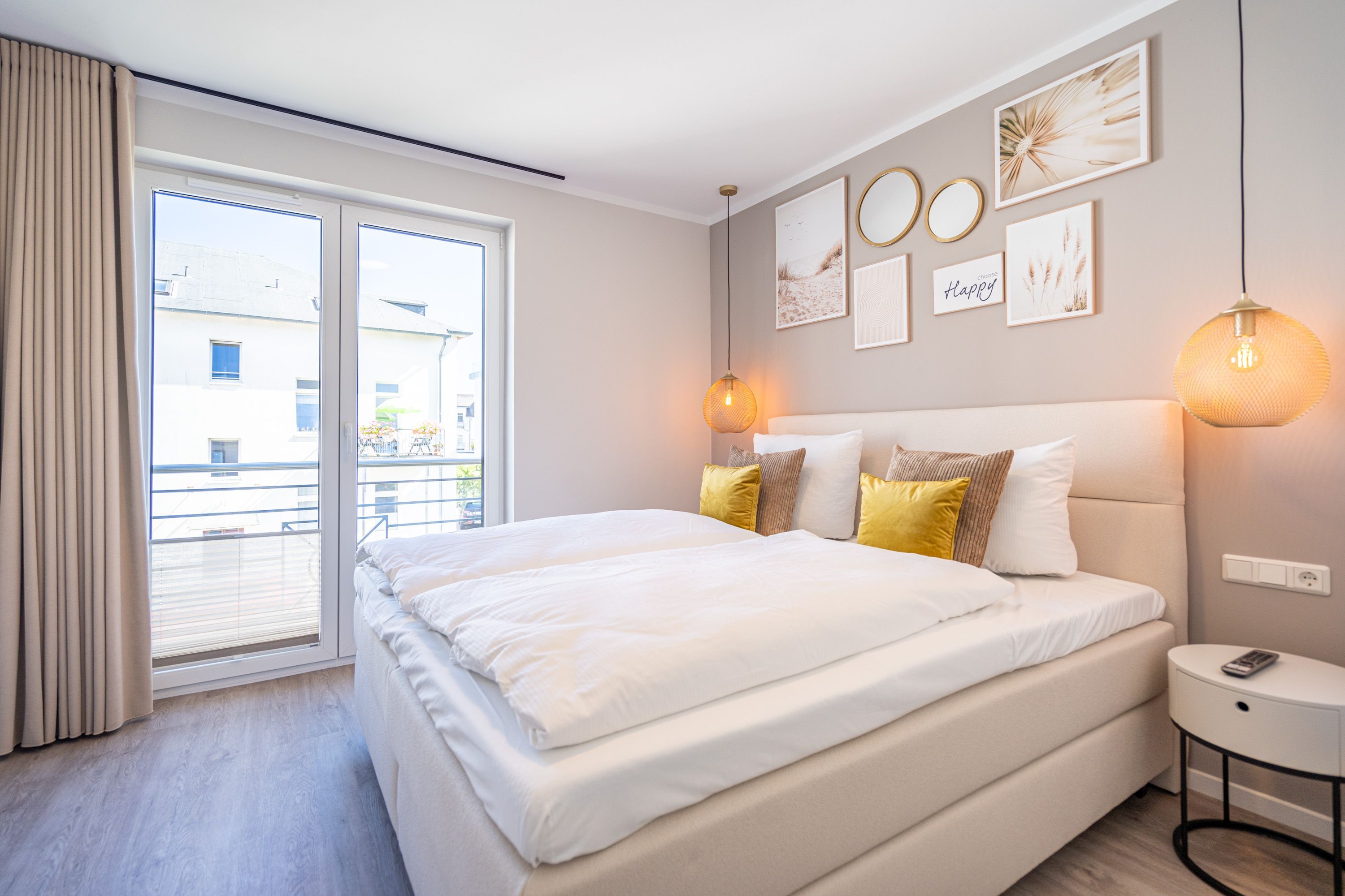 Diese einladende 2-Raum-Ferienwohnung N° 07 im Quartier 6 bietet auf 55 Quadratmetern in der ersten Etage ein komfortables Zuhause für bis zu 2 Personen und ein Kleinkind (im Kinderreisebett). Der offene Wohn-Essbereich ist stilvoll gestaltet und umfasst eine voll ausgestattete Küchenzeile mit einem Essplatz sowie einer einladenden Sitzgruppe. Hier können Sie entspannt auf dem 55-Zoll-Flat-TV fernsehen oder den Gaskamin per Fernbedienung genießen. Vom Wohnbereich aus haben Sie Zugang zu einem Süd-Ost-Balkon, der mit Gartenmöbeln ausgestattet ist perfekt für ein Frühstück in der Sonne. Im Schlafzimmer erwartet Sie ein komfortables Boxspringdoppelbett (1,80m x 2,00m), ein geräumiger Kleiderschrank, eine Kommode und ein weiterer Flat-TV (43 Zoll). Das Badezimmer ist modern eingerichtet und verfügt über eine Dusche, einen Waschtisch, ein WC und eine finnische Sauna, die Ihnen entspannte Stunden verspricht. Zu den weiteren Annehmlichkeiten gehören die kostenfreie Nutzung einer Waschmaschine sowie ein PKW-Stellplatz in der Tiefgarage. Zusätzlich steht Ihnen ein eigener Kellerraum zur Verfügung, in dem Sie Ihre Fahrräder sicher unterbringen können inklusive Lademöglichkeit für E-Bikes. Diese Ferienwohnung bietet alles, was Sie für einen rundum gelungenen Aufenthalt benötigen.