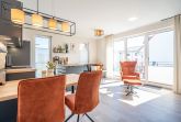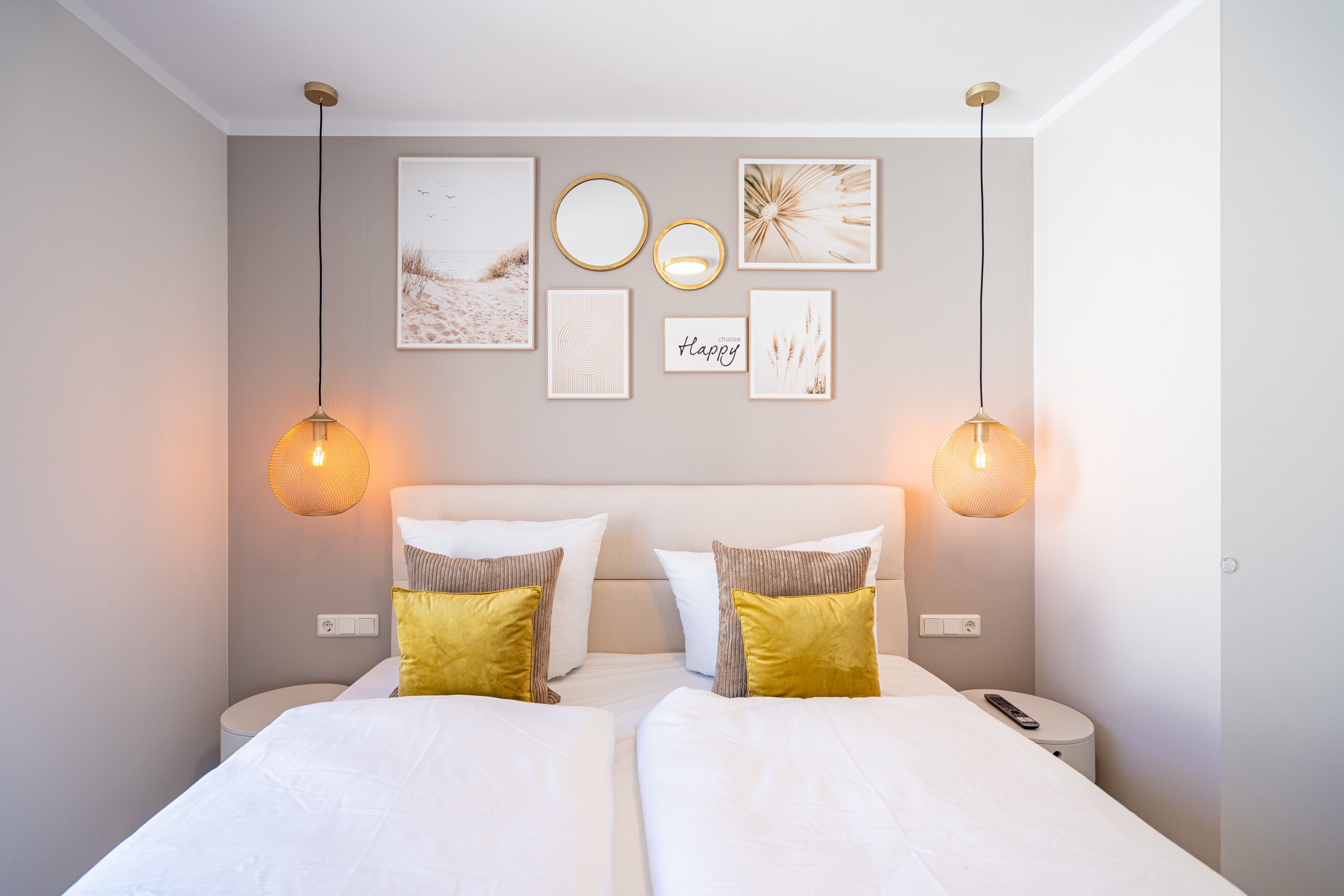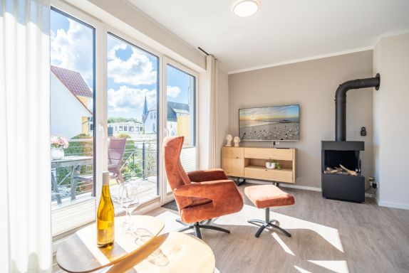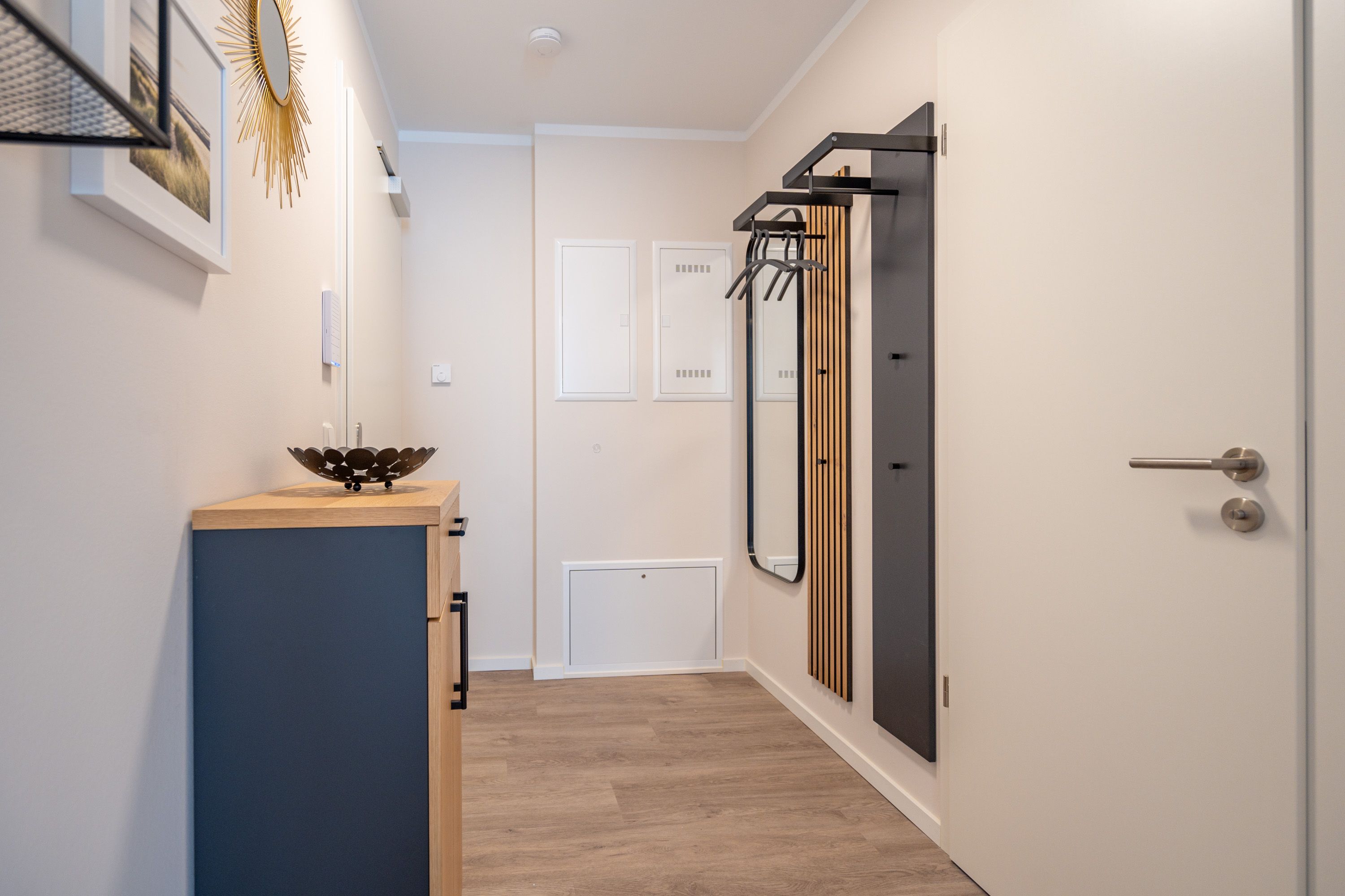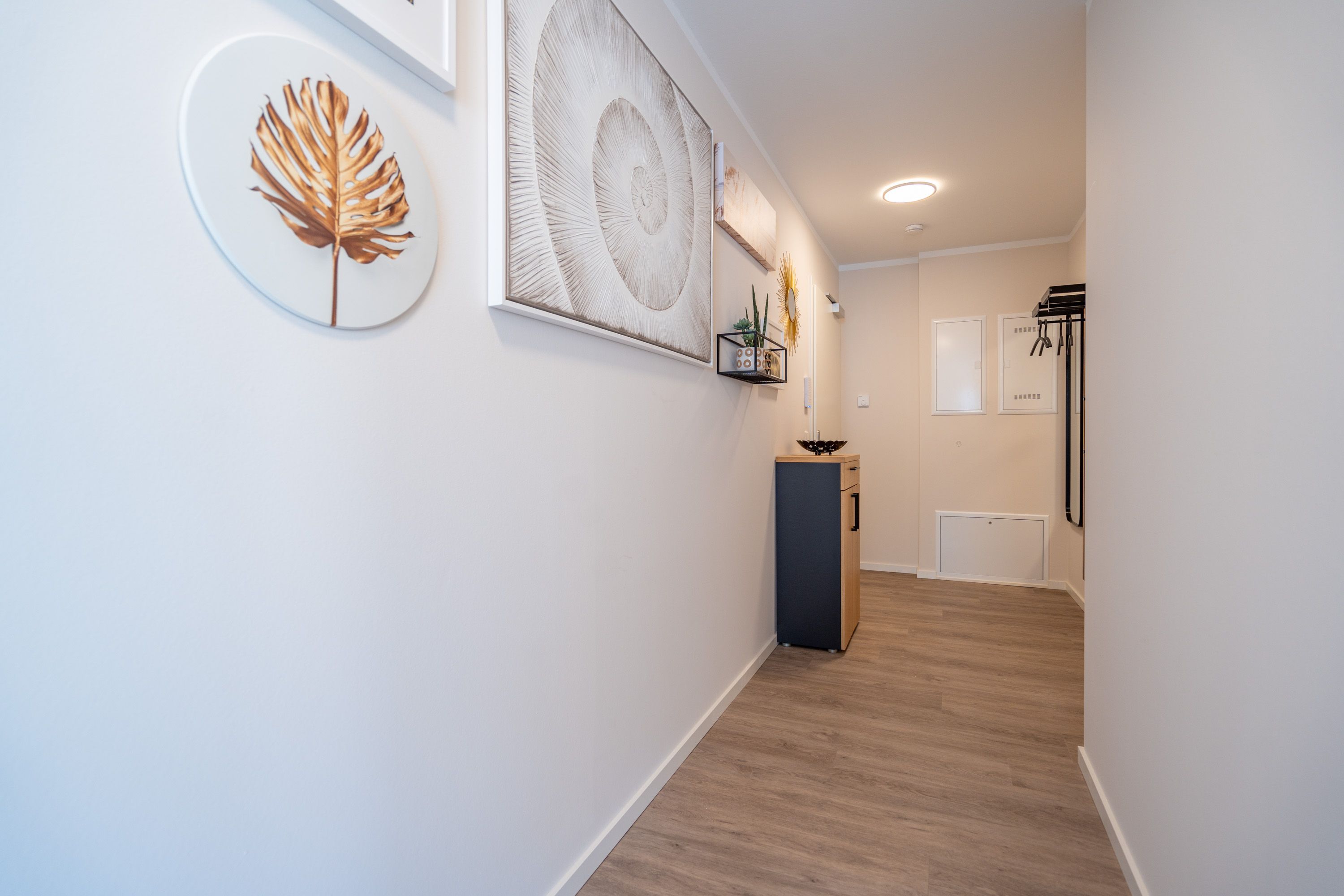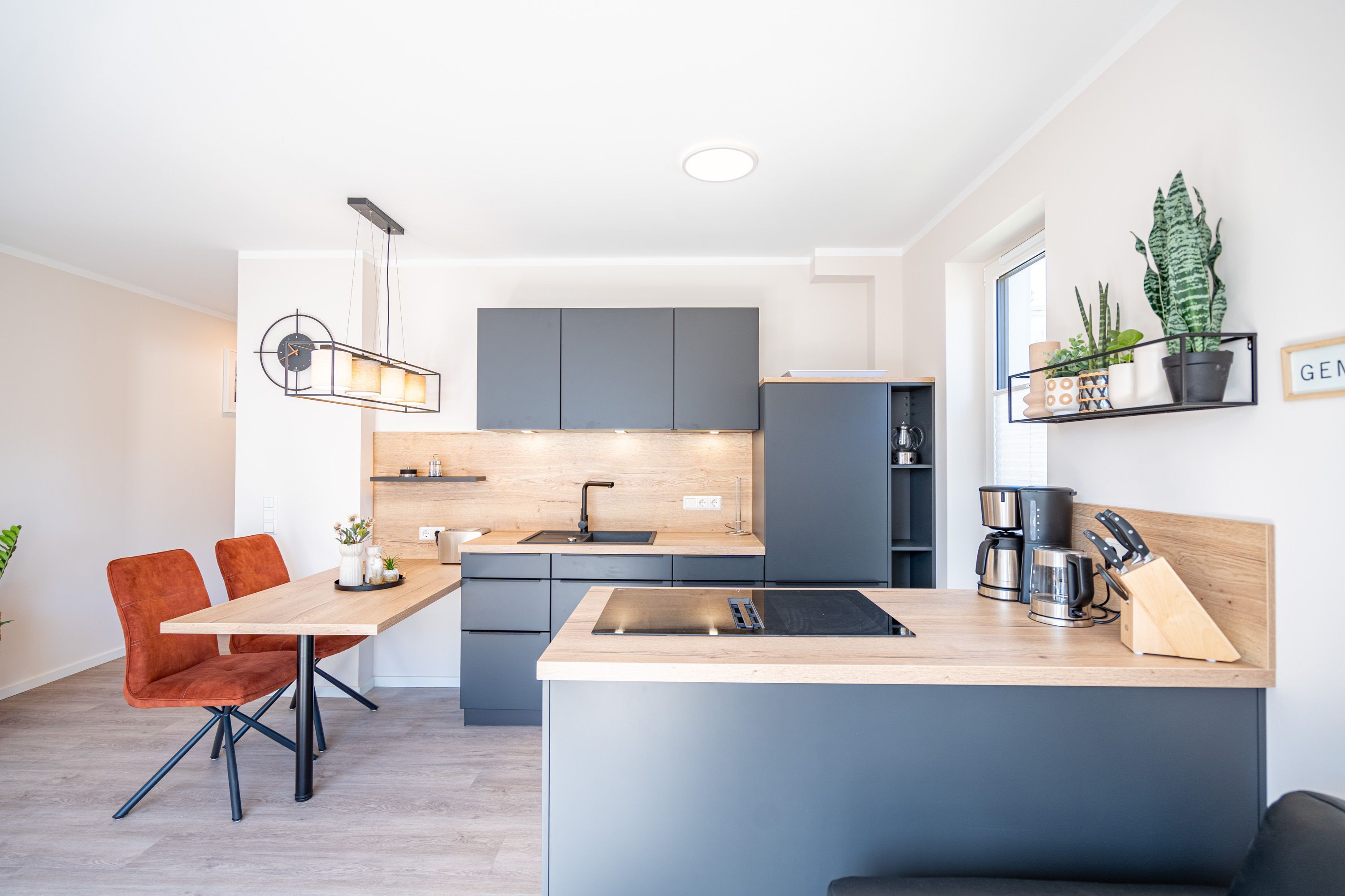 Diese einladende 2-Raum-Ferienwohnung N° 07 im Quartier 6 bietet auf 55 Quadratmetern in der ersten Etage ein komfortables Zuhause für bis zu 2 Personen und ein Kleinkind (im Kinderreisebett). Der offene Wohn-Essbereich ist stilvoll gestaltet und umfasst eine voll ausgestattete Küchenzeile mit einem Essplatz sowie einer einladenden Sitzgruppe. Hier können Sie entspannt auf dem 55-Zoll-Flat-TV fernsehen oder den Gaskamin per Fernbedienung genießen. Vom Wohnbereich aus haben Sie Zugang zu einem Süd-Ost-Balkon, der mit Gartenmöbeln ausgestattet ist perfekt für ein Frühstück in der Sonne. Im Schlafzimmer erwartet Sie ein komfortables Boxspringdoppelbett (1,80m x 2,00m), ein geräumiger Kleiderschrank, eine Kommode und ein weiterer Flat-TV (43 Zoll). Das Badezimmer ist modern eingerichtet und verfügt über eine Dusche, einen Waschtisch, ein WC und eine finnische Sauna, die Ihnen entspannte Stunden verspricht. Zu den weiteren Annehmlichkeiten gehören die kostenfreie Nutzung einer Waschmaschine sowie ein PKW-Stellplatz in der Tiefgarage. Zusätzlich steht Ihnen ein eigener Kellerraum zur Verfügung, in dem Sie Ihre Fahrräder sicher unterbringen können inklusive Lademöglichkeit für E-Bikes. Diese Ferienwohnung bietet alles, was Sie für einen rundum gelungenen Aufenthalt benötigen.