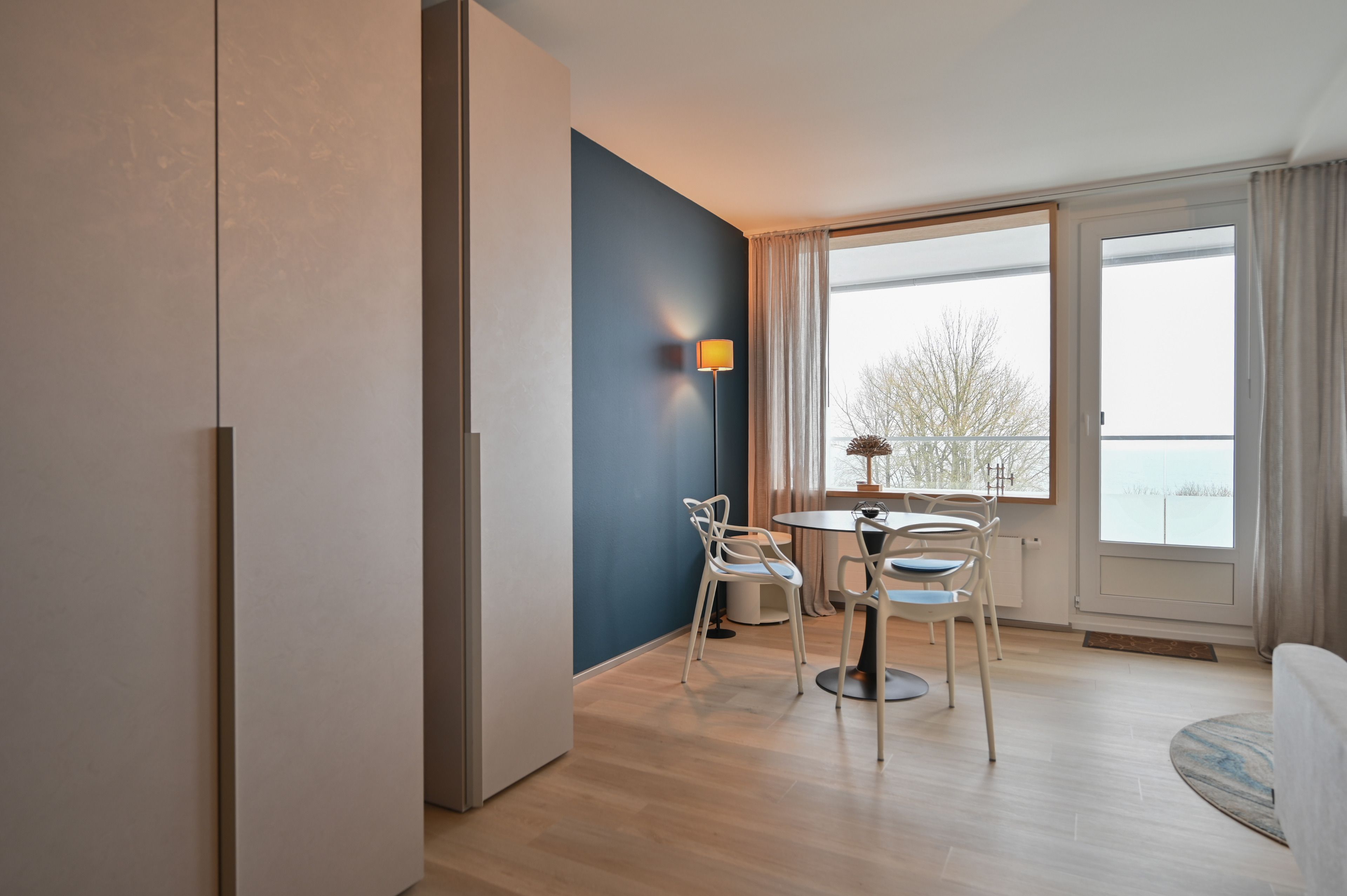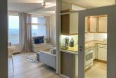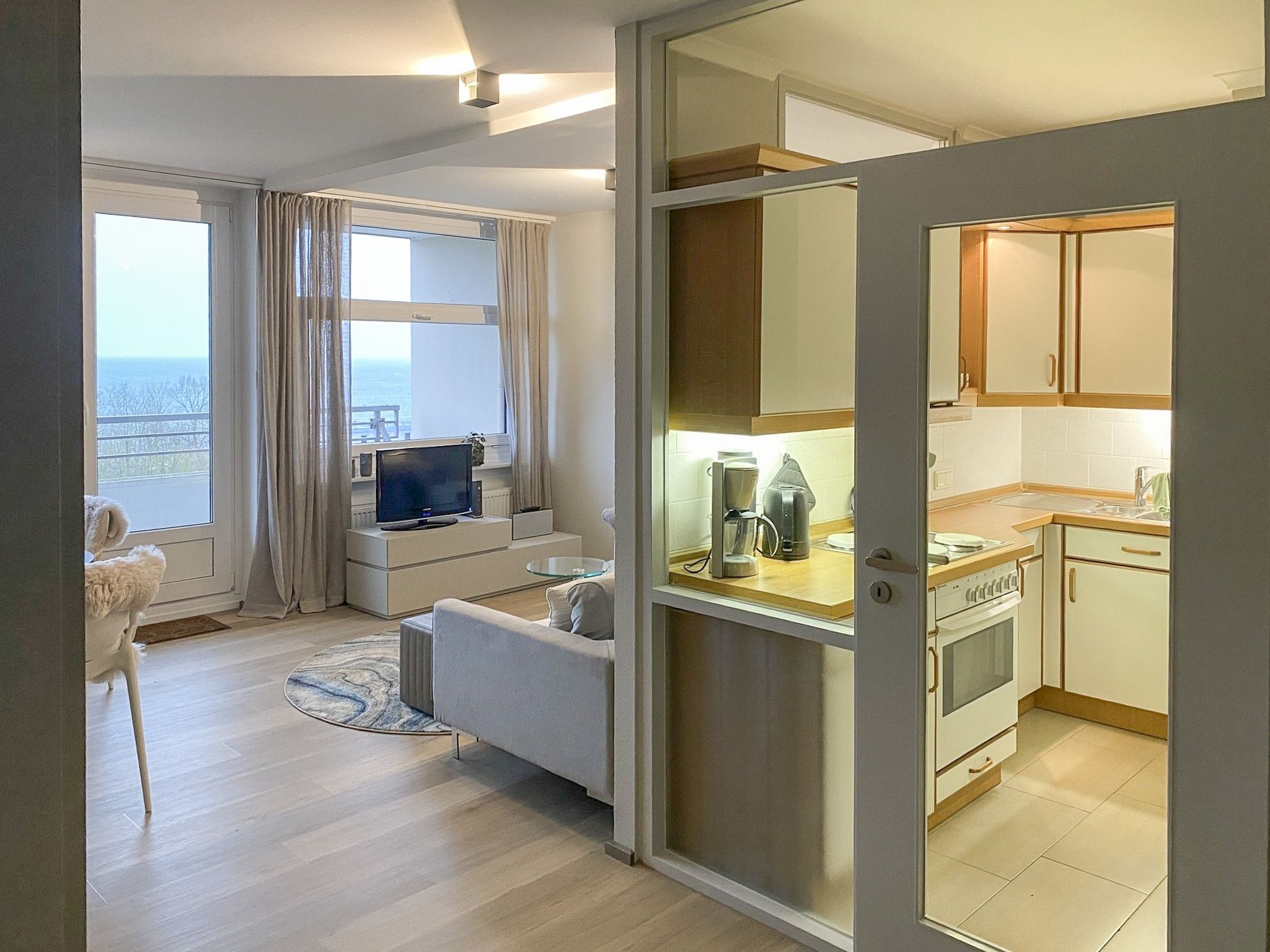 Mit hochwertiger Ausstattung lädt Ferienwohnung UTBLICK im 5. Stock mit freiem Ausblick auf die Ostsee zum Verweilen ein - klein und fein, aber mit viel Platz zum Erholen für zwei Personen.