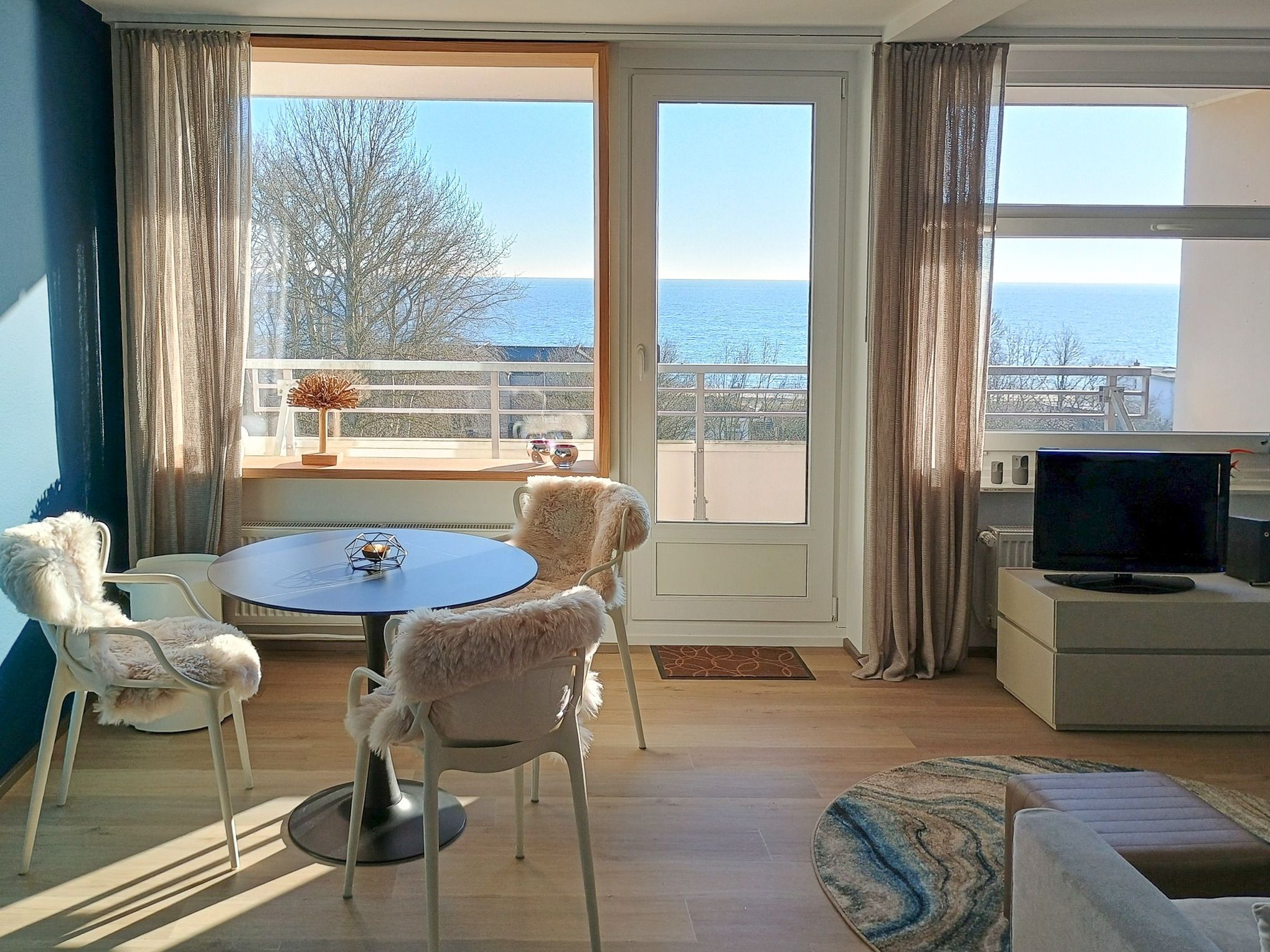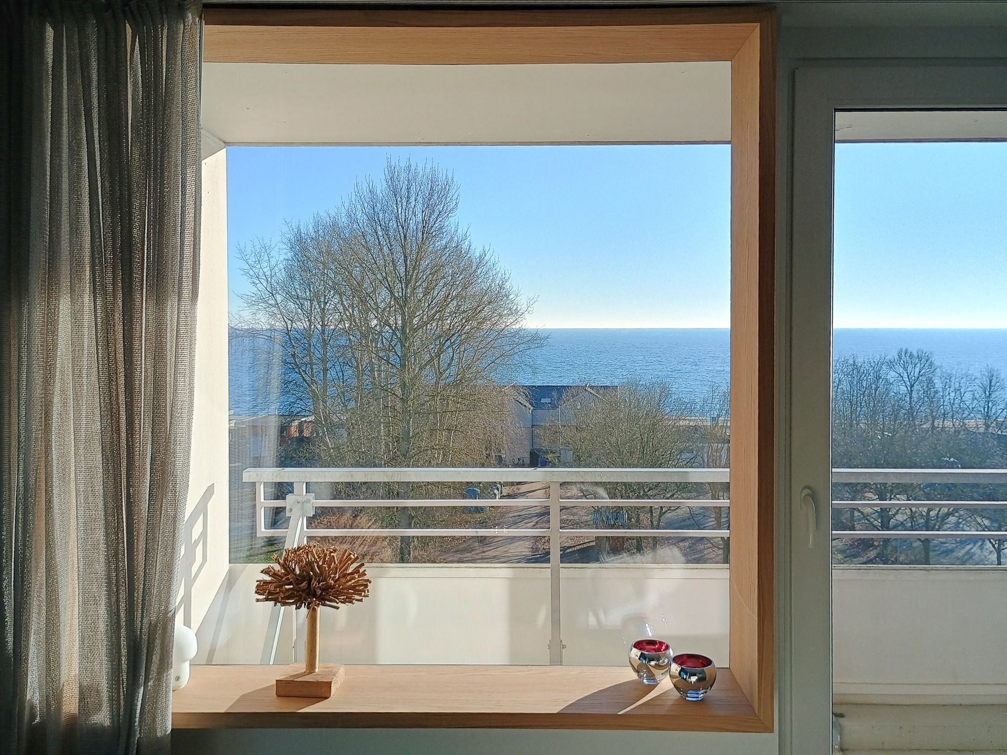 Geniessen Sie den freien Meerblick auf dem großzügigen Balkon mit Glasgeländer und aus dem gesamten Wohnbereich heraus. Starten Sie Ihren Tag mit einem wunderschönen Sonnenaufgang über dem Meer und lassen Sie Ihren Abend mit weitem Ostseeblick ausklingen ... alles gewürzt mit frischer Meeresbrise.