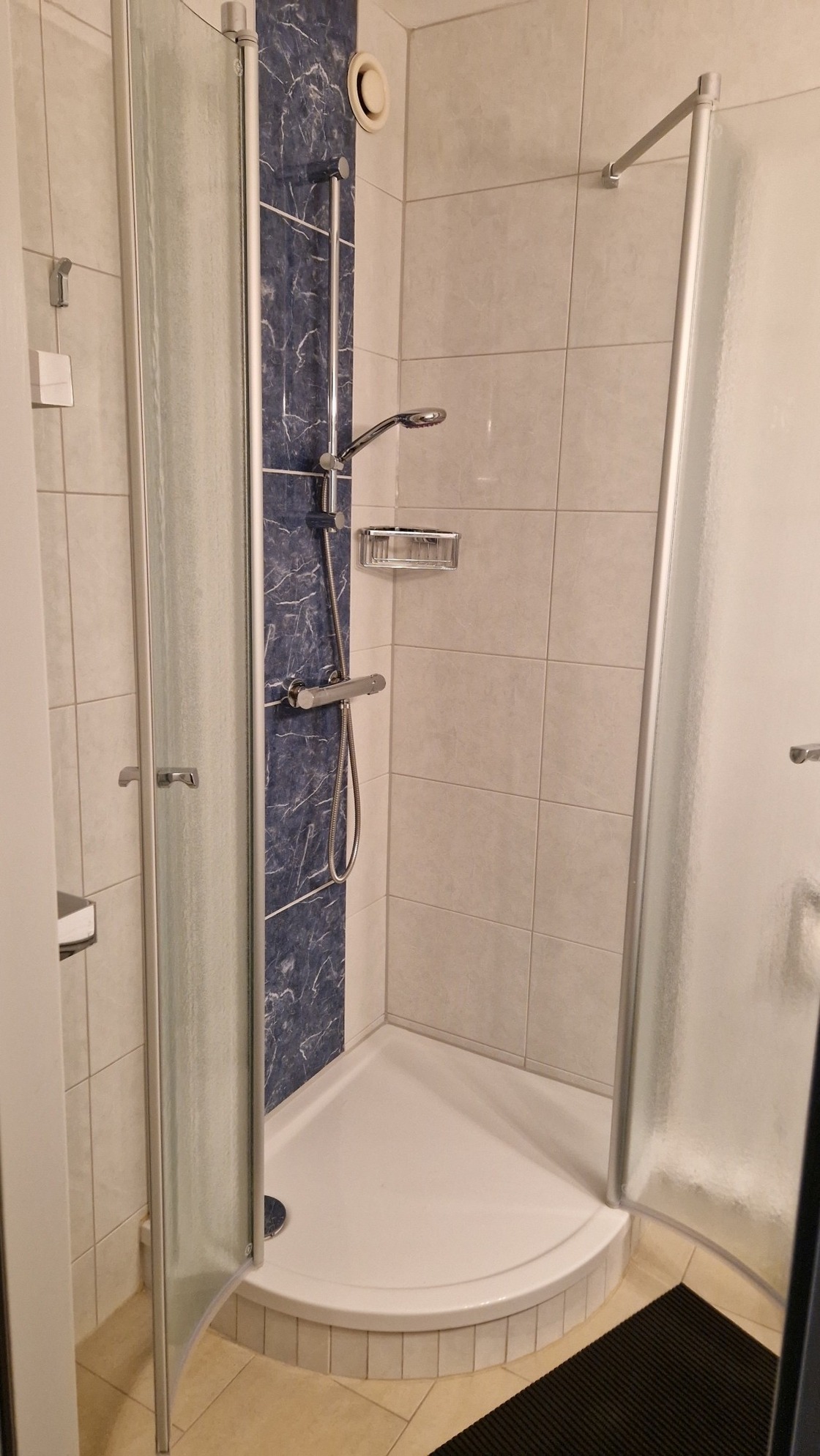 Das Badezimmer ist modern mit einer flachen Duschkabine, Handtuch-Heizkörper, Randlos-WC und einem Waschtischschrank ausgestattet und bietet Ihnen einen komfortablen Rahmen für Ihre Wellnessmomente.