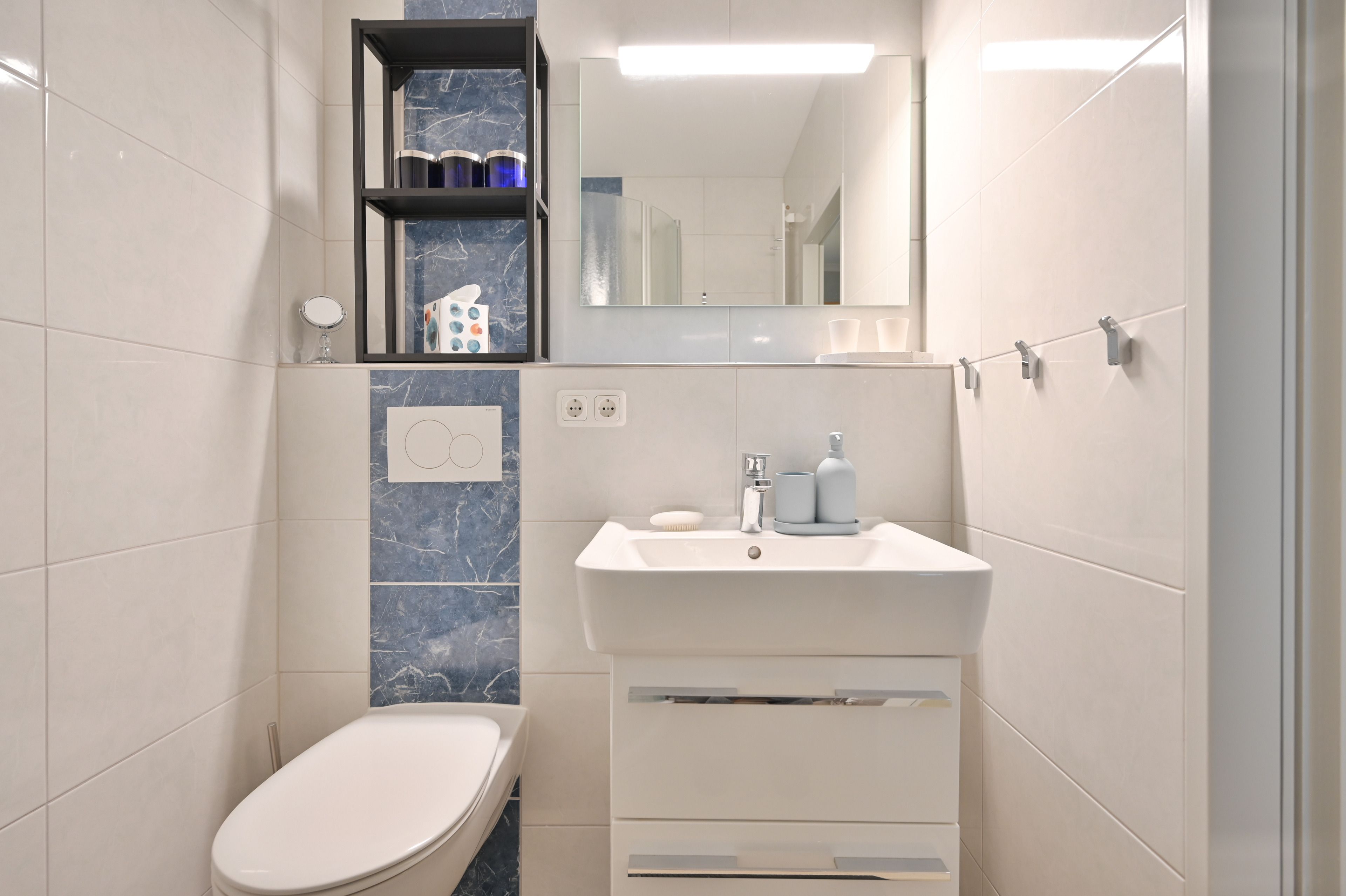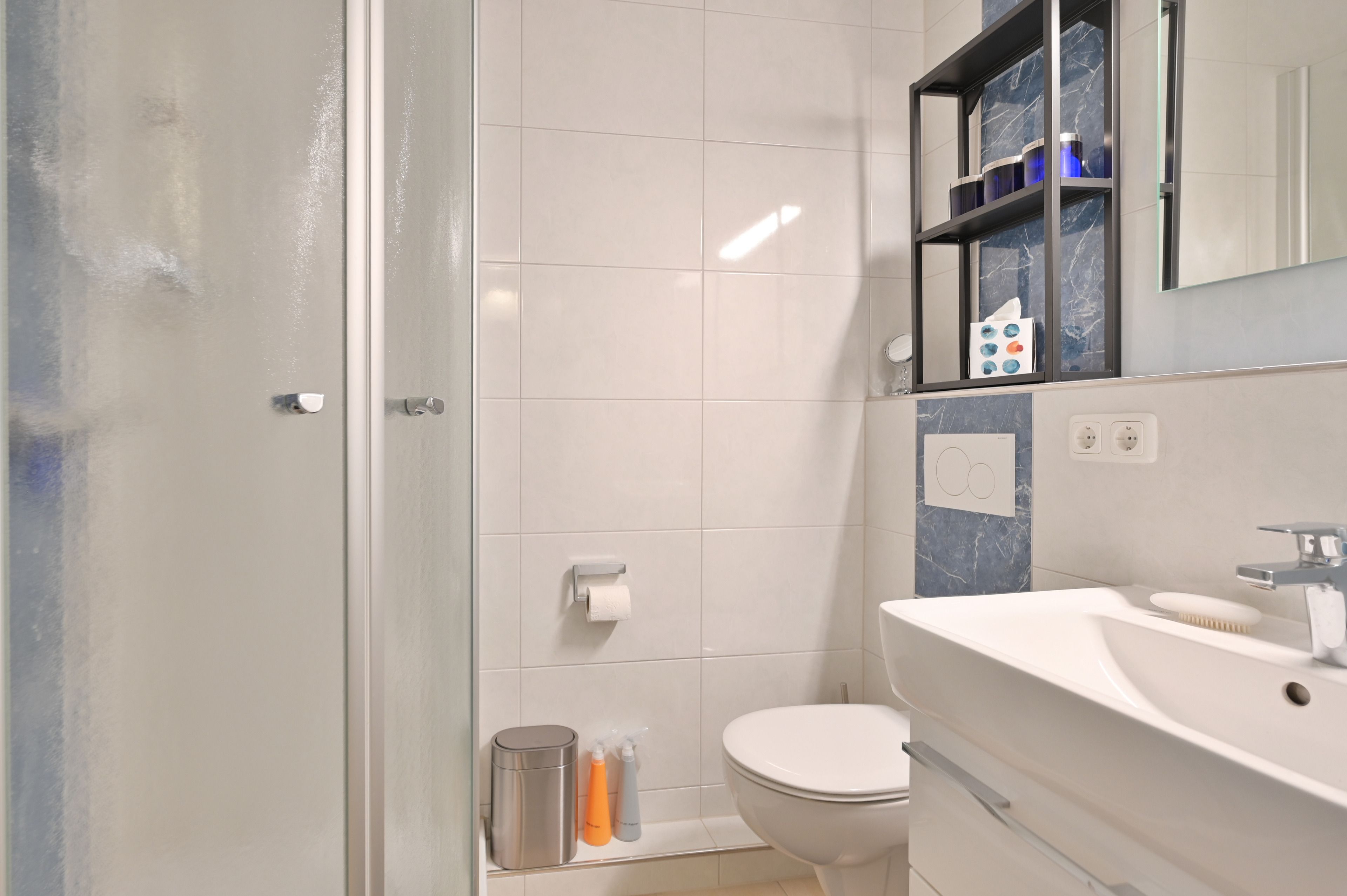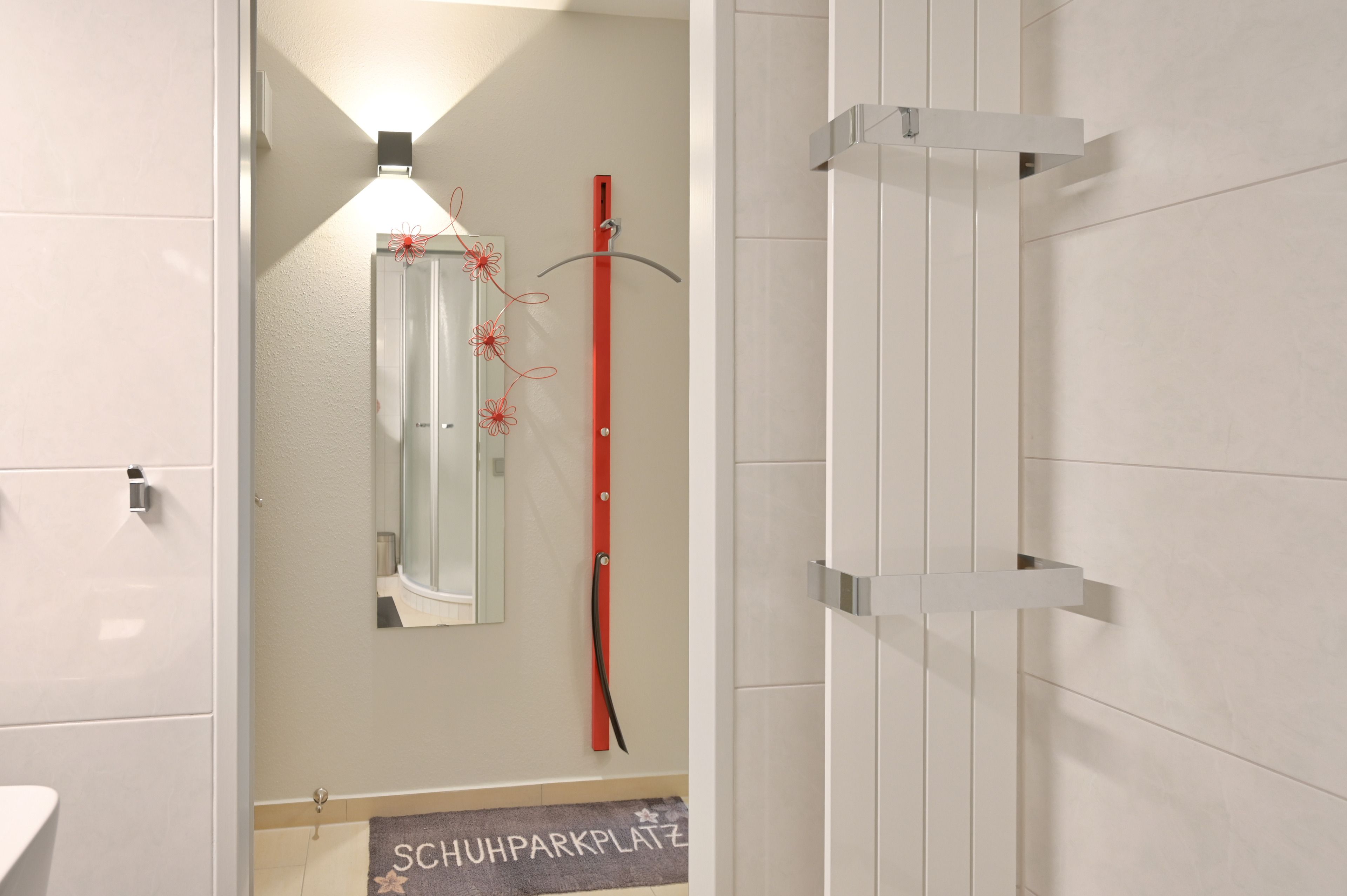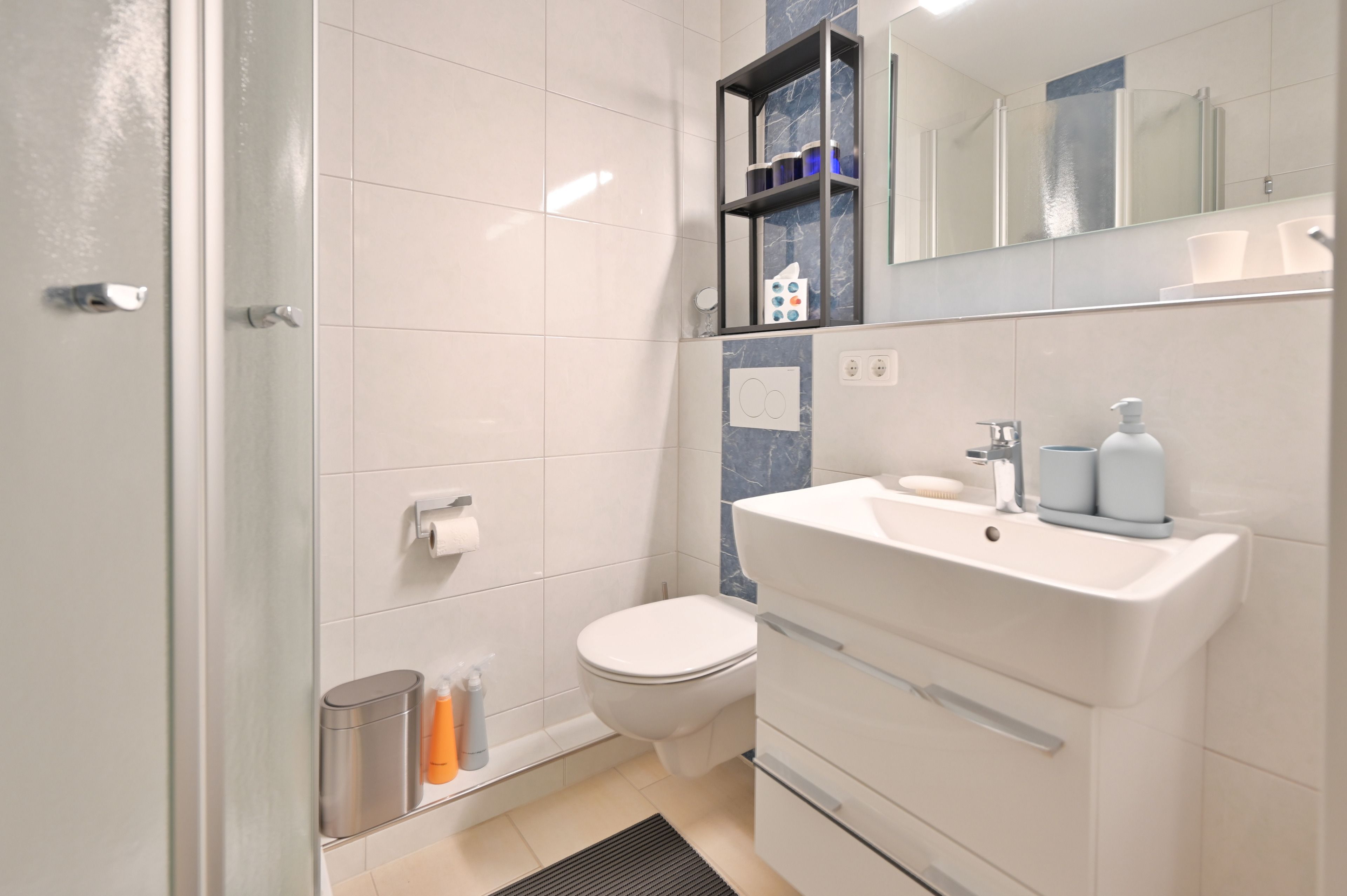 Das Badezimmer mit flacher Duschkabine, Handtuch-Heizkörper, Randlos-WC und einem Waschtischschrank bietet Ihnen einen komfortablen Rahmen für Ihre Wellnessmomente.