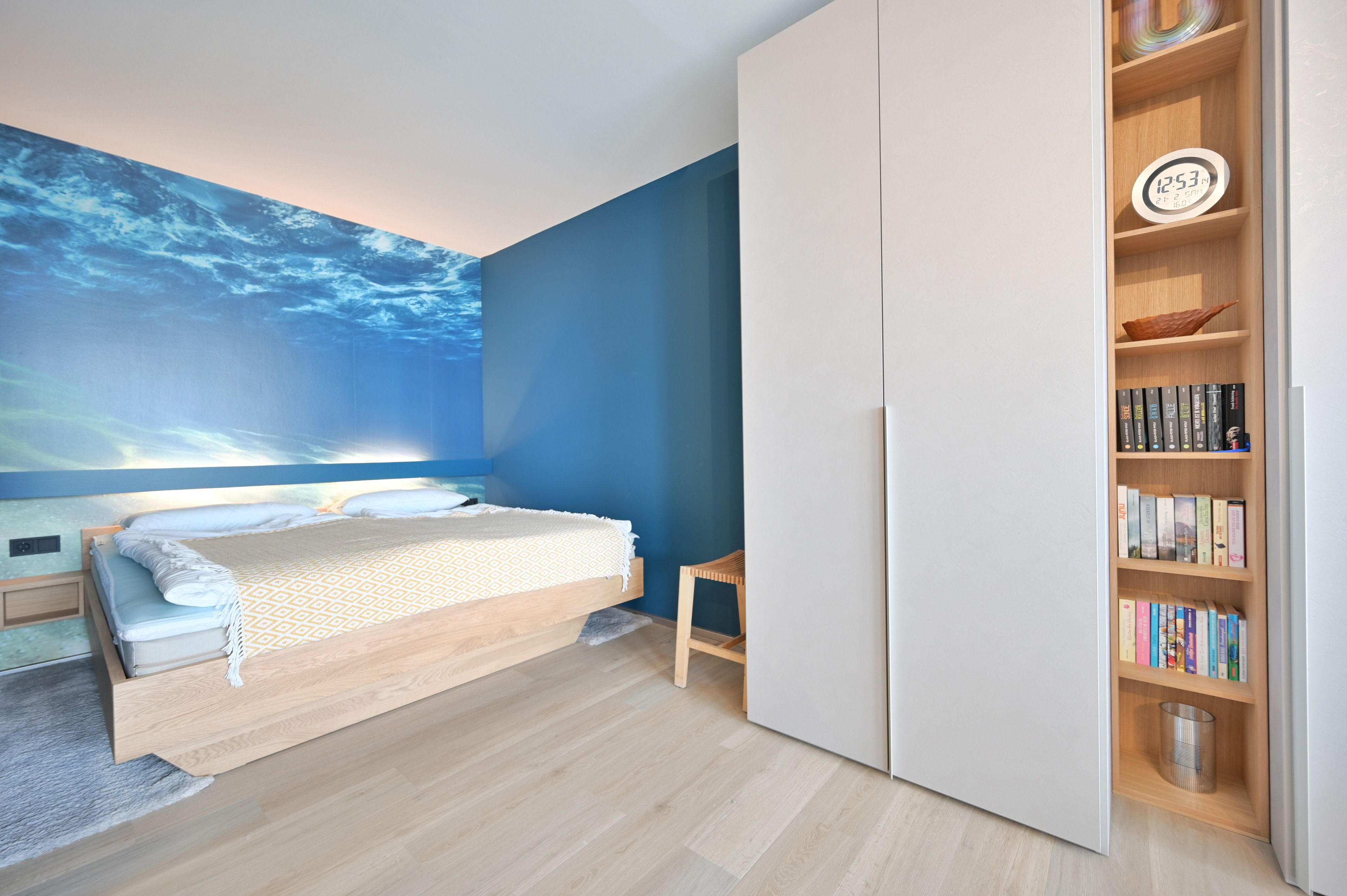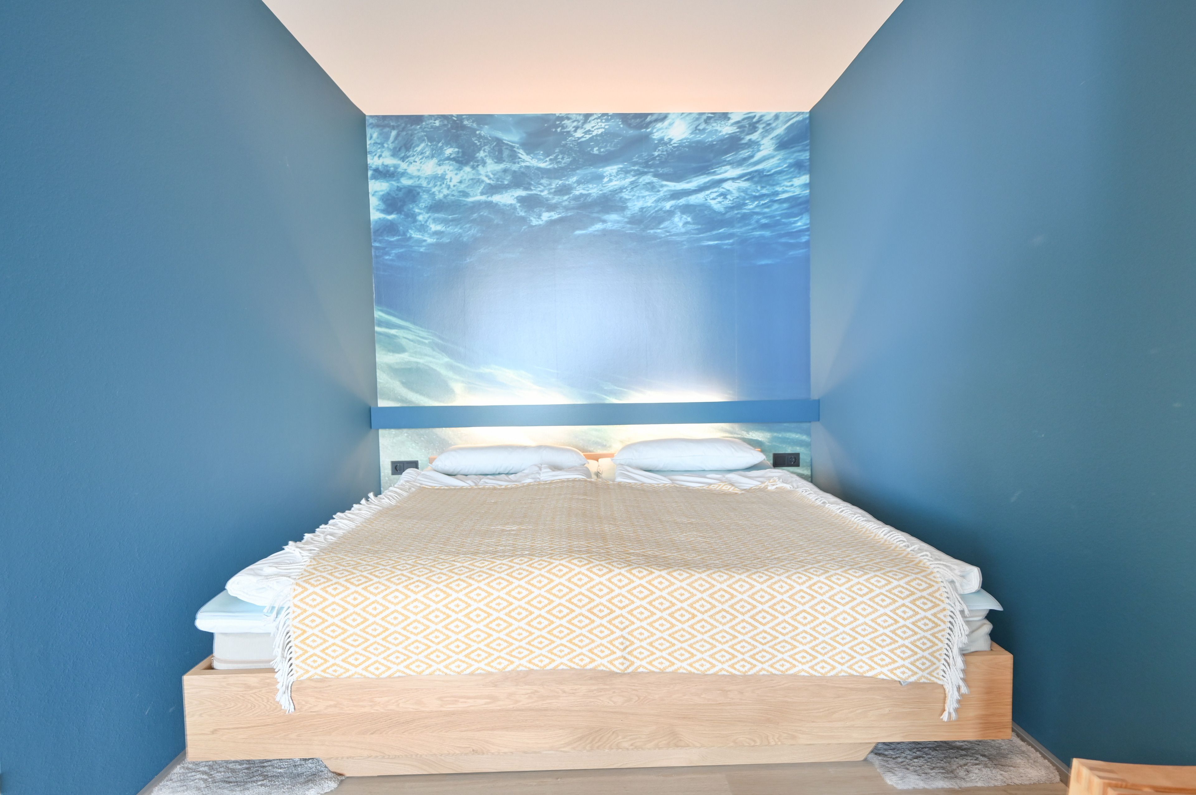 Ihre Nachtruhe finden Sie im Naturholzbett von 180 x 200cm. In der Schlafnische mit Unterwasseroptik und indirekter Beleuchtung finden Sie erholsamen Schlaf und wachen mit morgendlichem Meerblick auf.