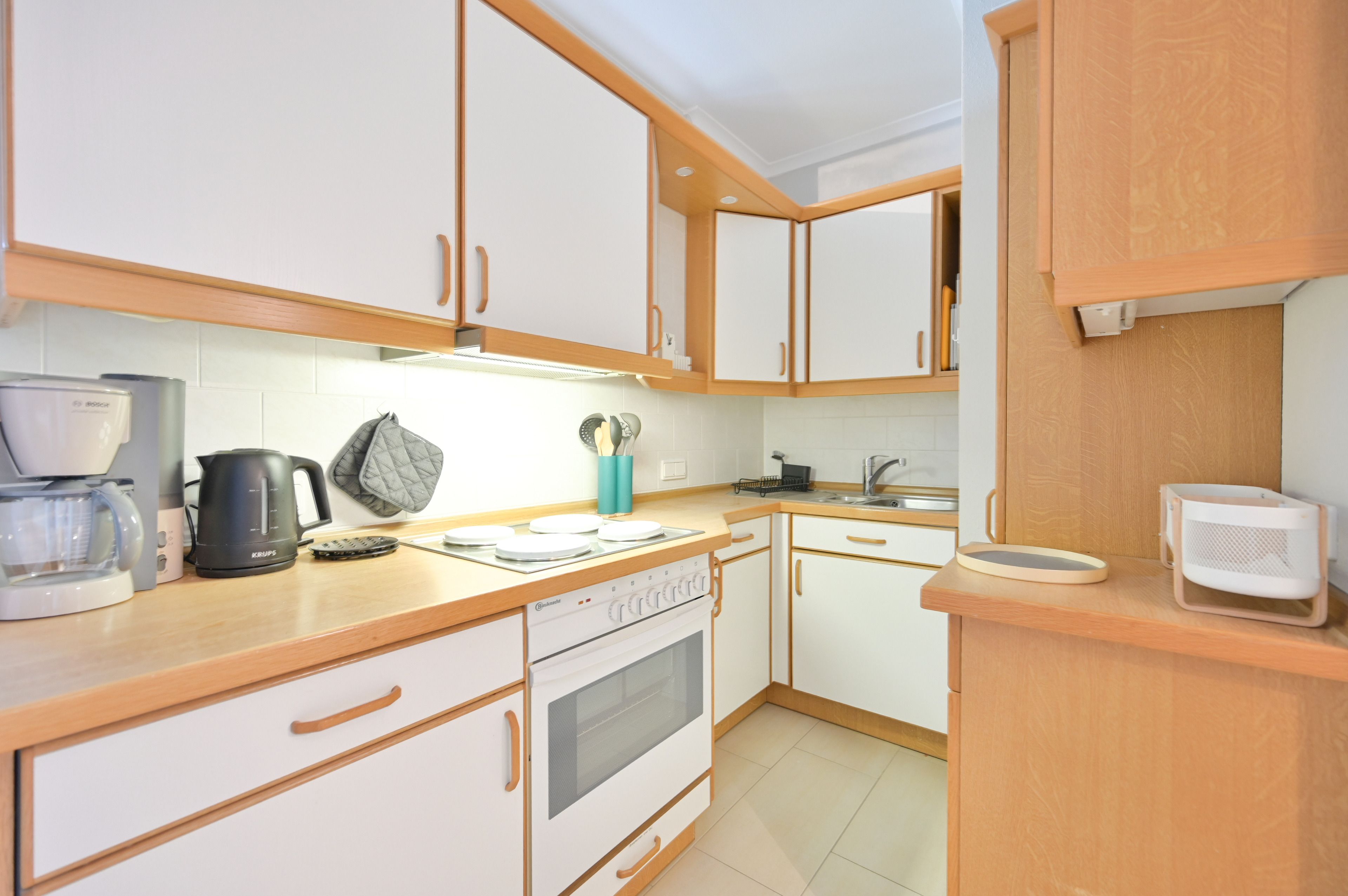 Die kleine Küche in charmanter Retro-Optik schliesst sich an den Flurbereich an und beinhaltet alles Notwendige für die Zubereitung Ihrer Mahlzeiten.