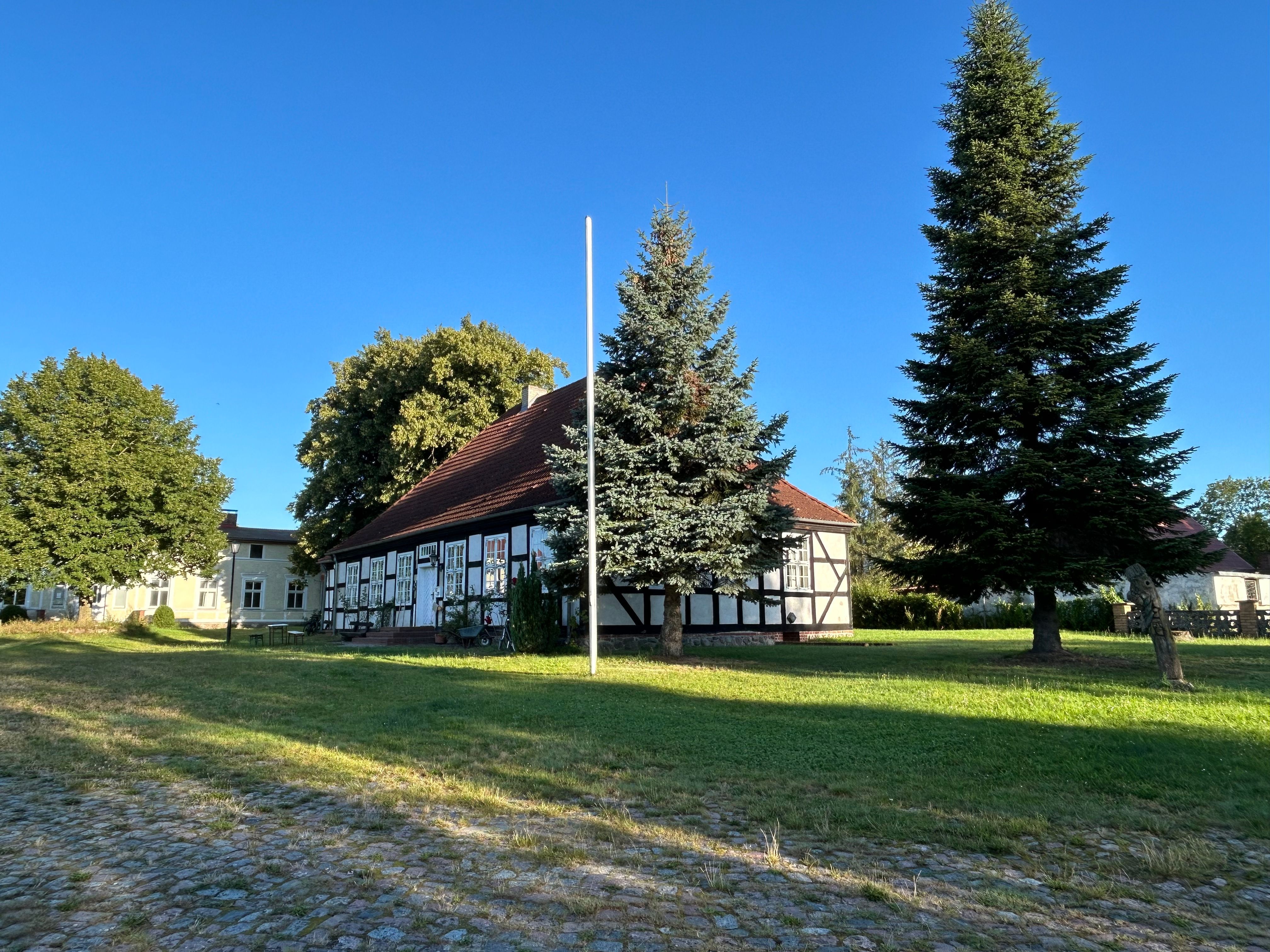 Das Gutshaus und die zwei Fachwerkhäuser stehen auf einem fußballfeldgroßen Grundstück im Ortszentrum von Schlatkow.