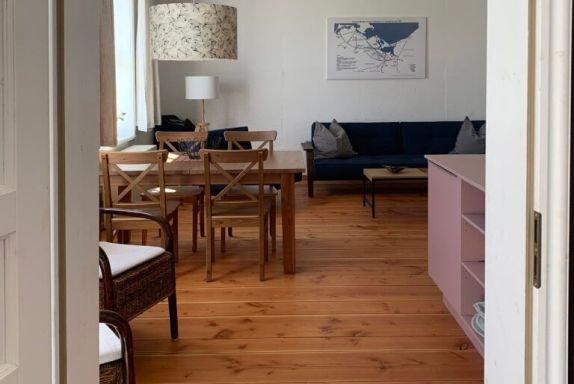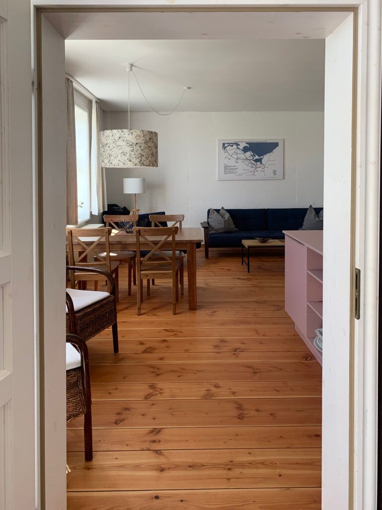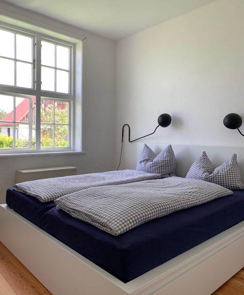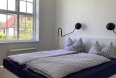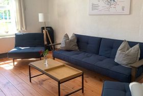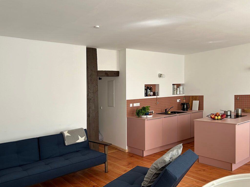 Die Fewo 2 besteht aus einem geräumigen Wohnzimmer mit offener Küche, hohen Decken, großen Fenstern und alten Holzdielen sowie einem Schlafzimmer mit Queensize-Doppelbett und einem Bad mit Dusche und WC. Die voll ausgestattete Küche bietet viel Platz für gemeinsames und kommunikatives Kochen. In dieser Wohnung können 2 Personen im Schlafzimmer und 2 Personen im Wohnzimmer auf einem breiten, gemütlichem Sofa mit Topper übernachten. So ist die Wohnung für 4 Personen geeignet.