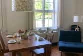 Die Fewo 2 besteht aus einem geräumigen Wohnzimmer mit offener Küche, hohen Decken, großen Fenstern und alten Holzdielen sowie einem Schlafzimmer mit Queensize-Doppelbett und einem Bad mit Dusche und WC. Die voll ausgestattete Küche bietet viel Platz für gemeinsames und kommunikatives Kochen. In dieser Wohnung können 2 Personen im Schlafzimmer und 2 Personen im Wohnzimmer auf einem breiten, gemütlichem Sofa mit Topper übernachten. Demnach insgesamt für 4 Personen geeignet.