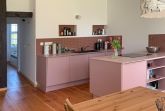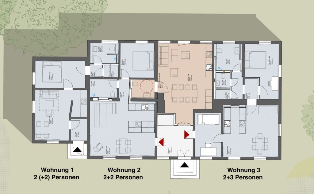 Zwischen den beiden großen Wohnungen (Fewo 2 & 3) liegt ein 40qm großer Gemeinschaftsraum mit Küche und WC, der zum gemeinsamen Essen, Arbeiten, Spielen und für Gruppenaktivitäten genutzt werden kann. Ein Schlafsofa bietet hier zudem 2 zusätzliche Schlafgelegenheiten.