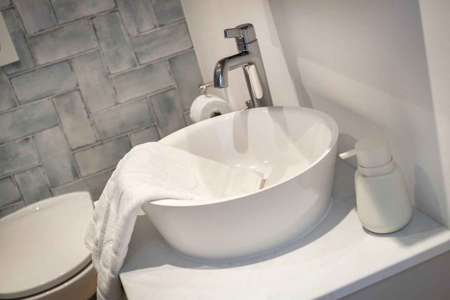 Bei der Einrichtung von Achtern wurde besonderen Wert auf geschmackvolles und bequemes Mobiliar gelegt, es gibt ein großes Boxspringbett, ein gemütliches Wohnzimmer, einen Esstisch und eine perfekt eingerichtete Küche mit Spülmaschine, Backofen und einem geräumigen Kühlschrank.