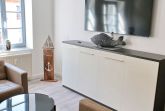 • Stilvolles Wohnzimmer mit Couch, (nutzbar als Schlafcouch für 1 Person), 2 Sessel, Low-board umklappbar zum Schlafbett für 1 Person, großer Flat-TV, Sonos-Lautsprecher.